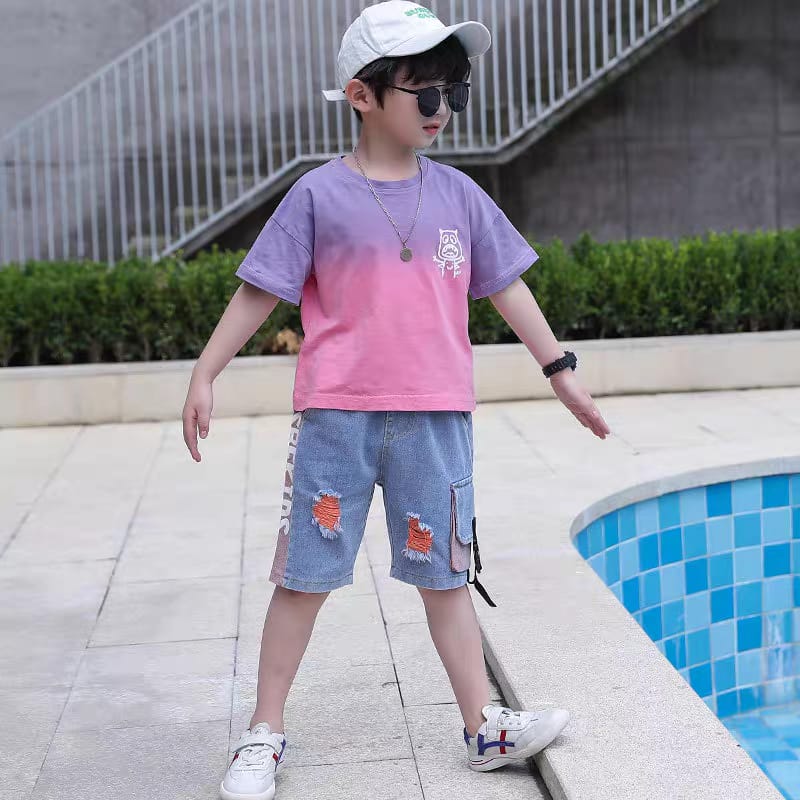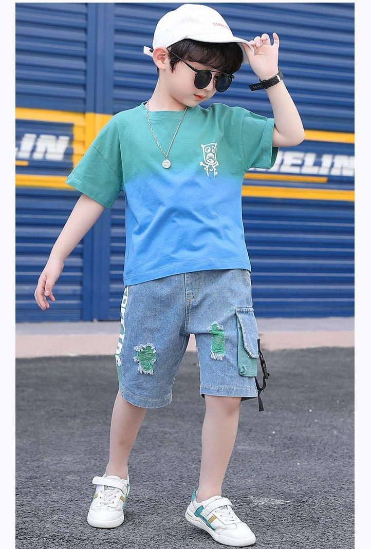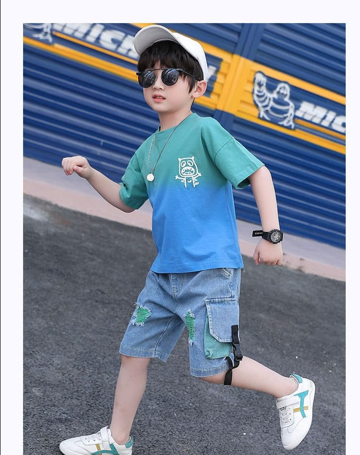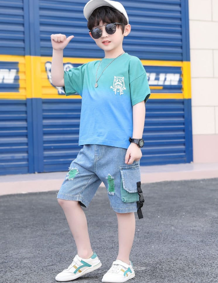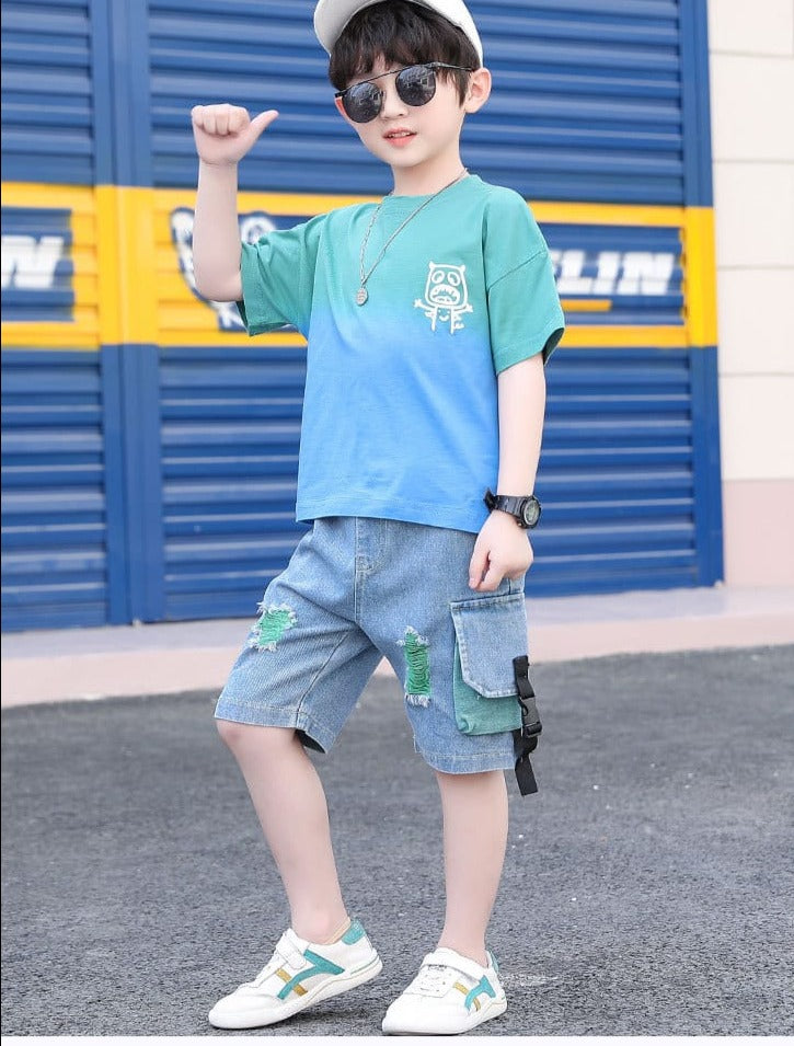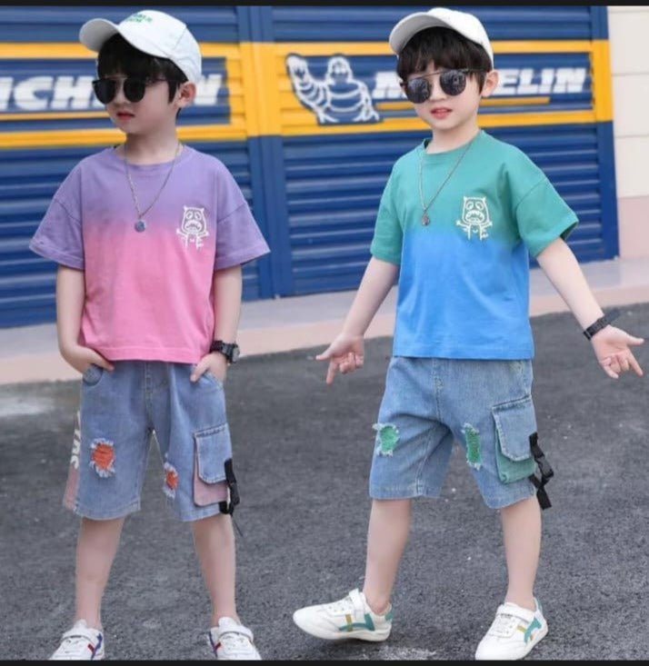 طقم ولادي جينز ( بلوزة قطنية + شورت جينز ناعم )