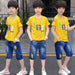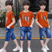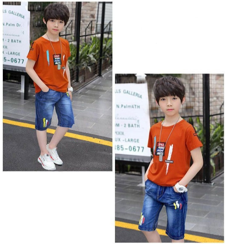 AO0402-62 طقم ولادي قطعتين ( بلوزة قطنية + بنطلون شورت جينز ناعم )