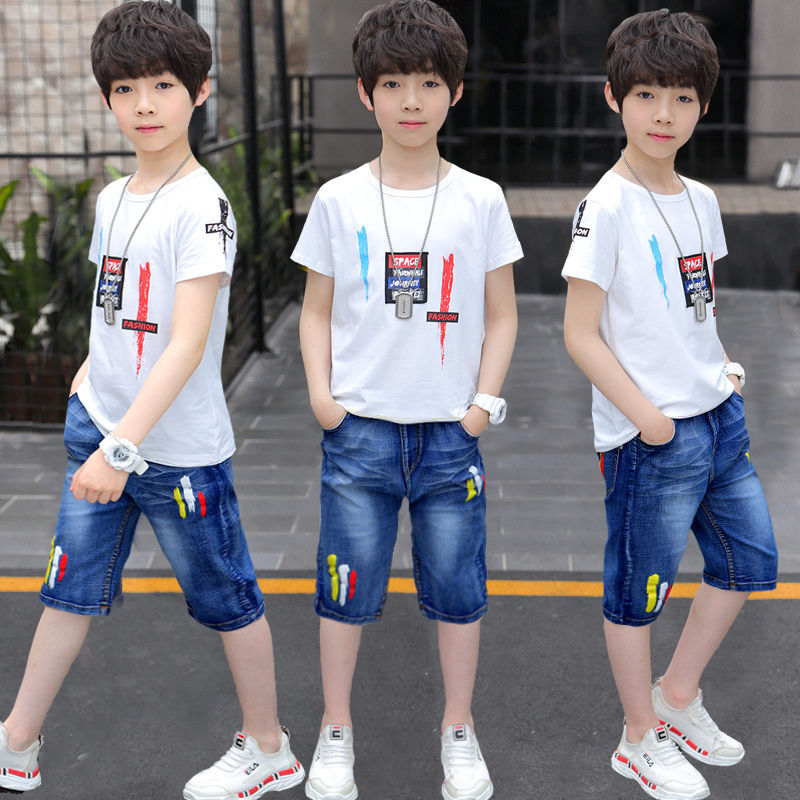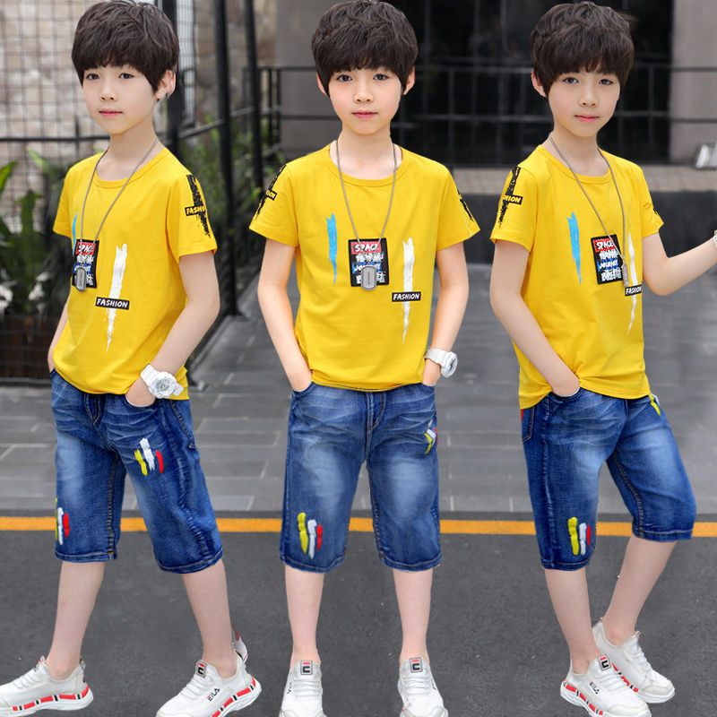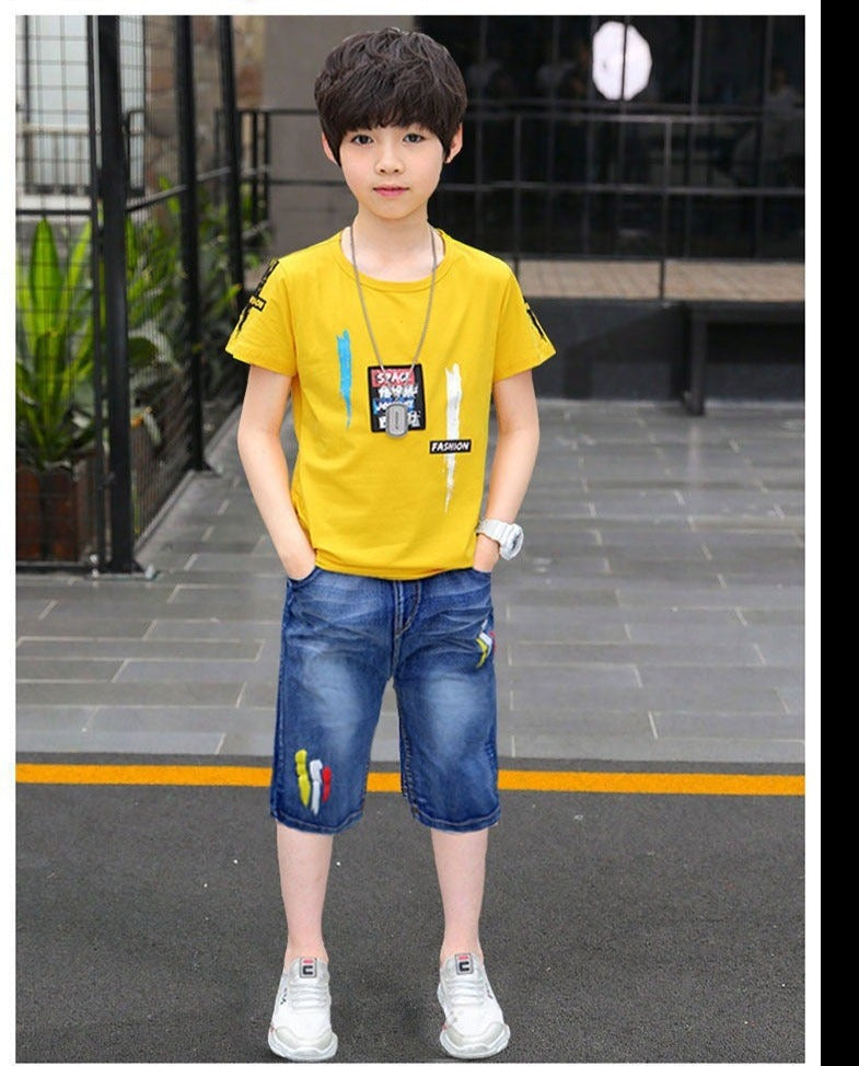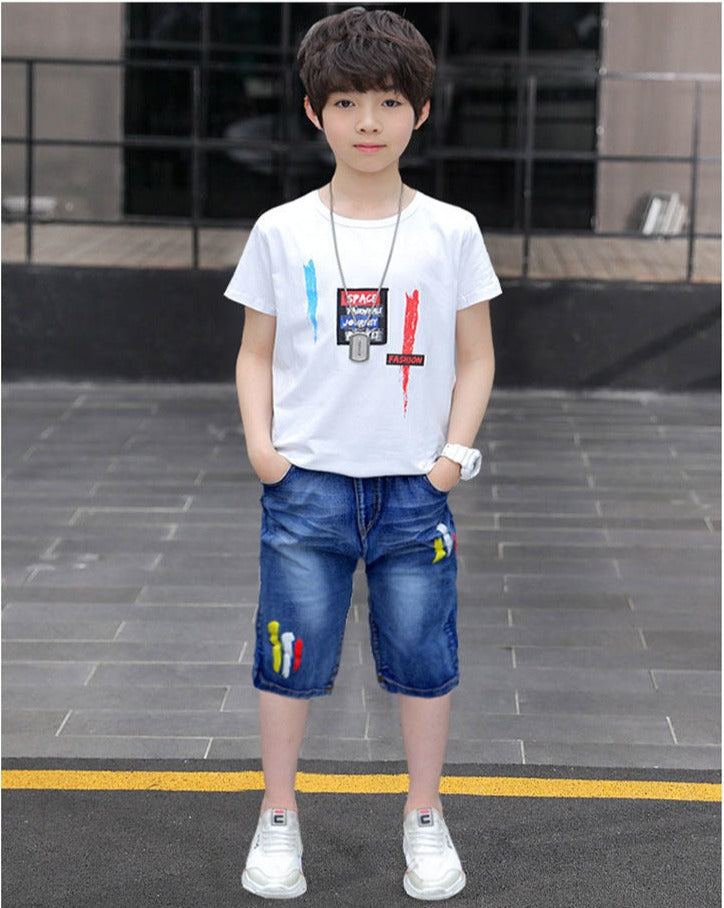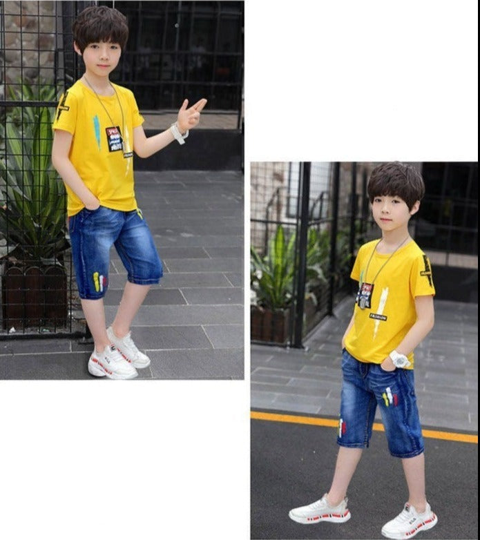 طقم ولادي قطعتين ( بلوزة قطنية + بنطلون شورت جينز ناعم )