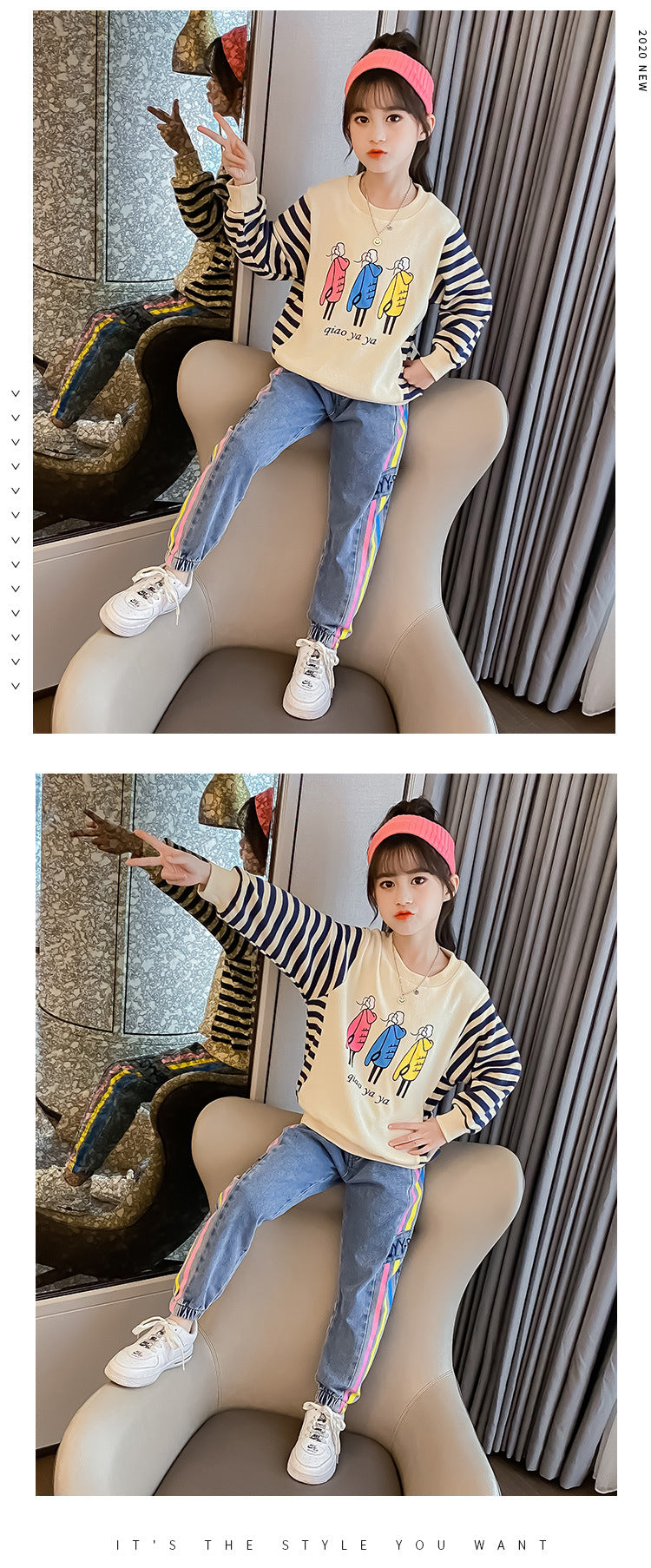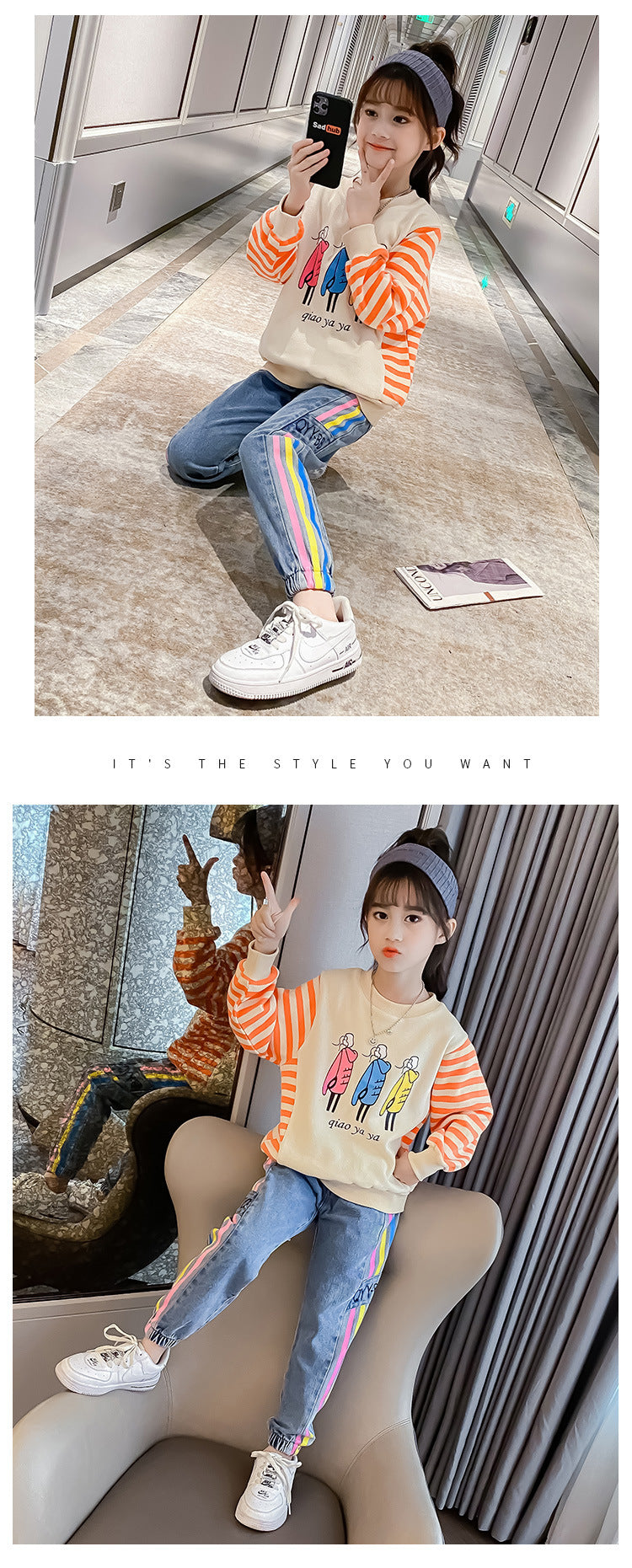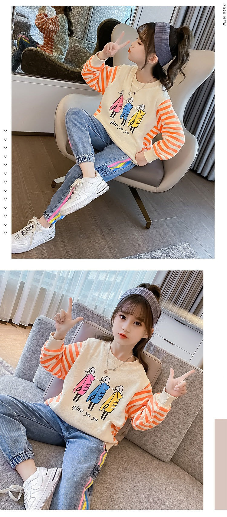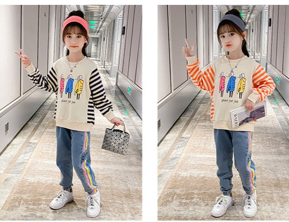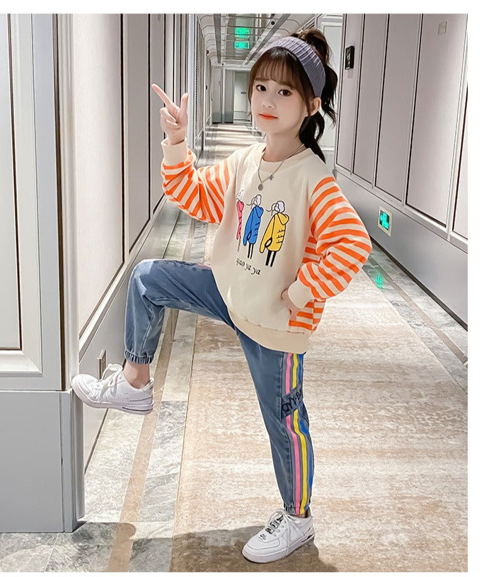 AO0505-58 طقم جيز مميز خريفي دافي ( بلوزة قطنية ثقيلة + بنطلون جينز ناعم )