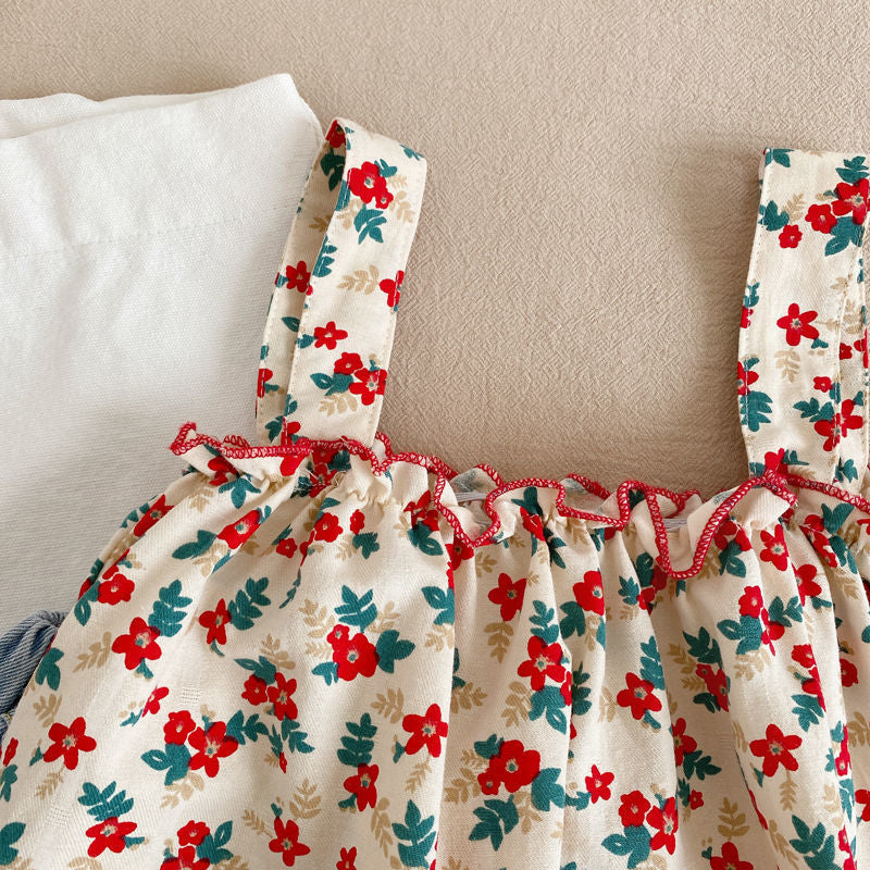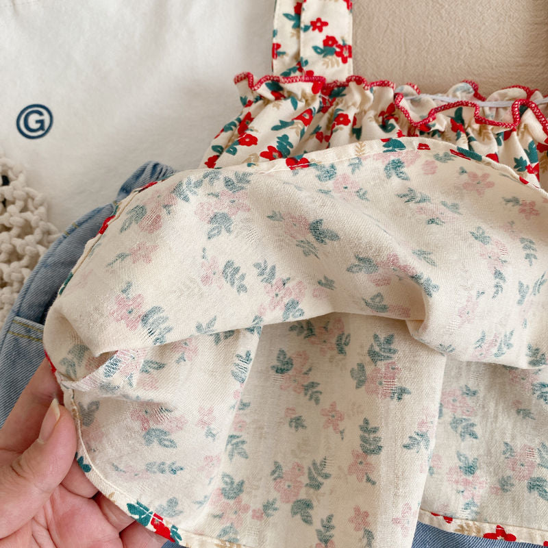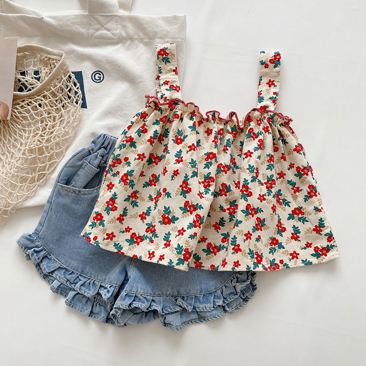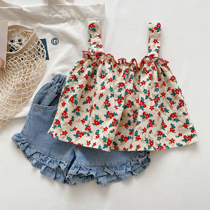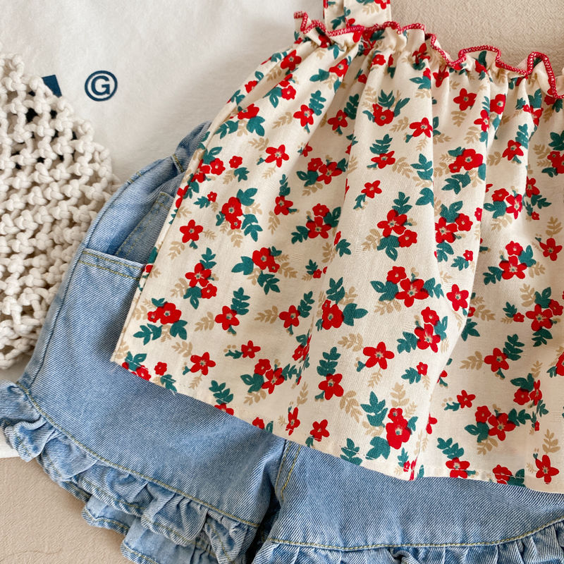 AO0507-60 طقم بناتي صيفي شورت بجي قطعتين ( بلوزة + شورت جينز)
