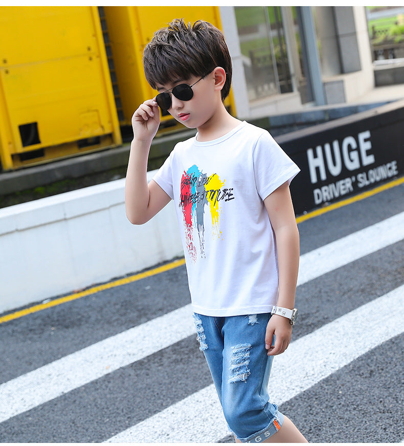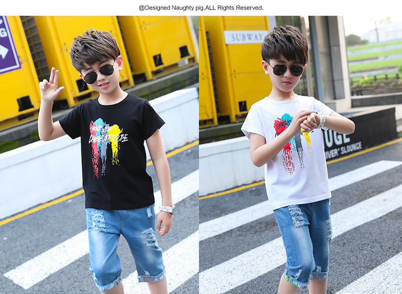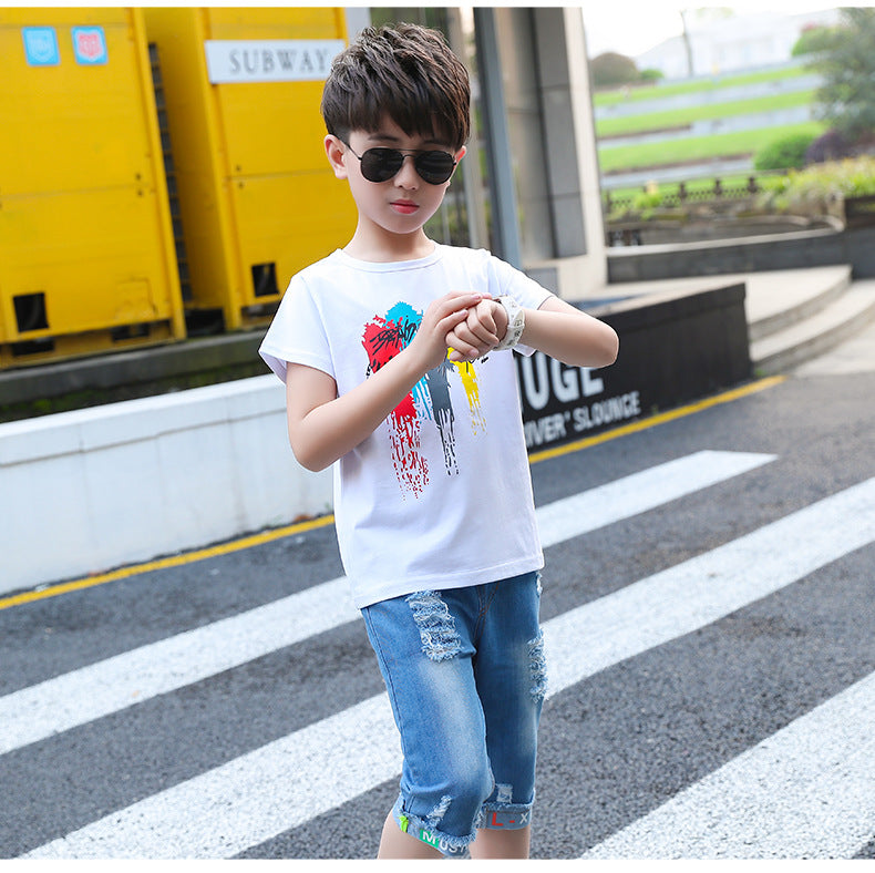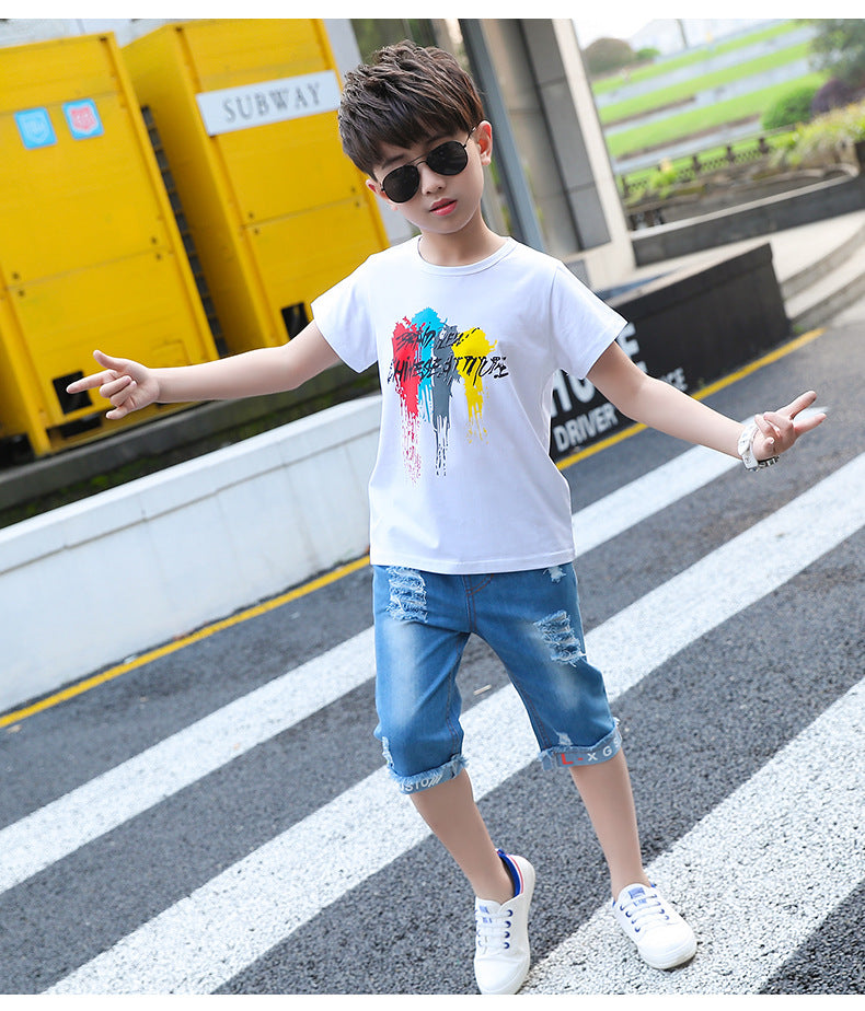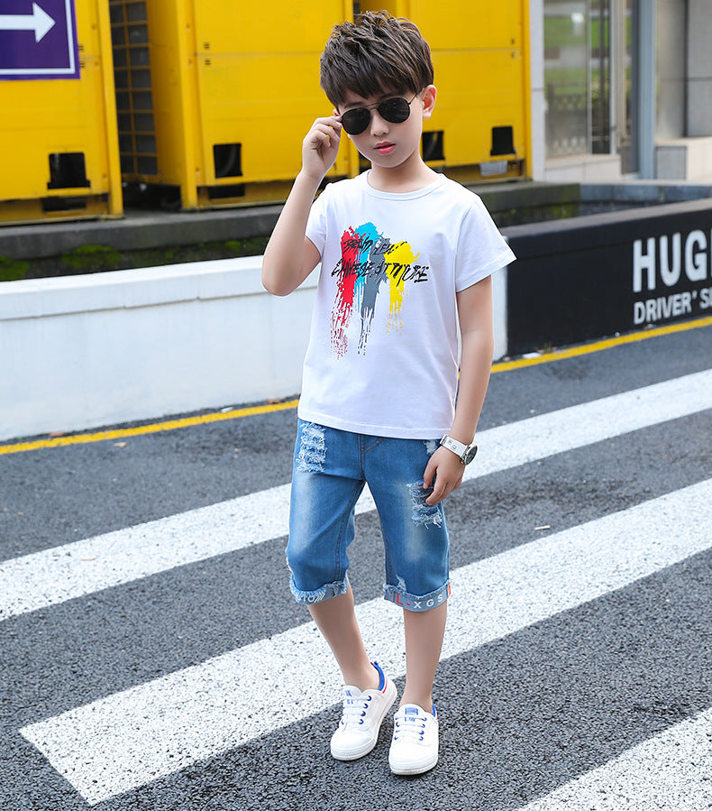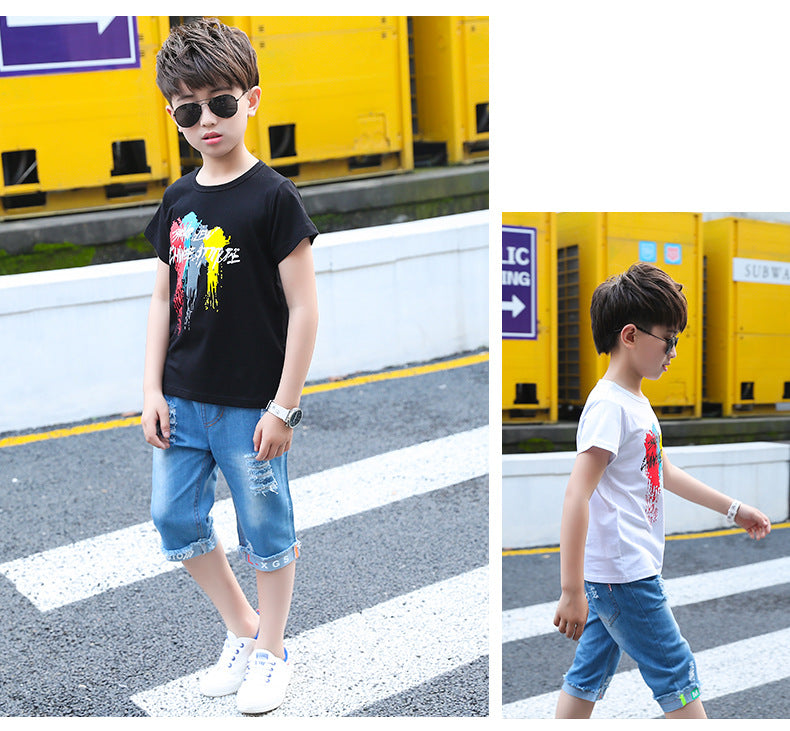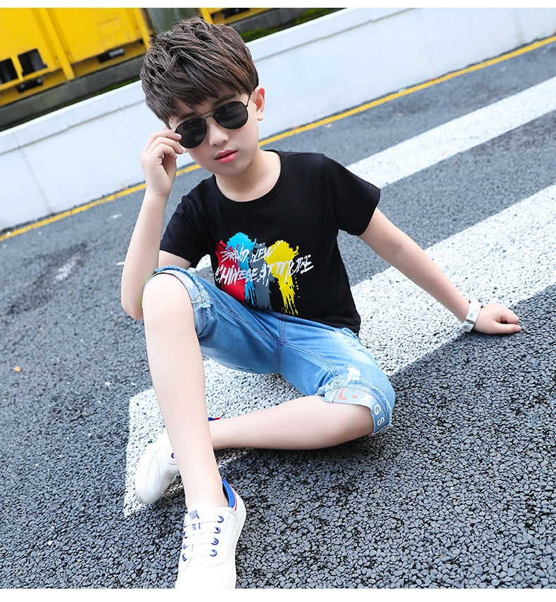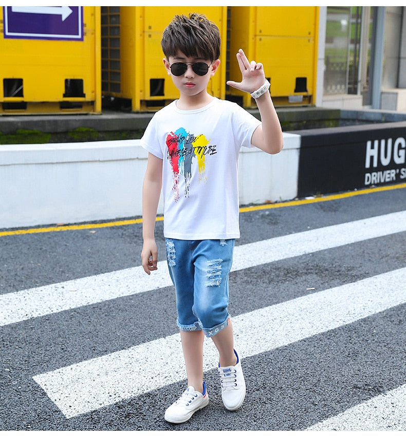 طقم ولادي جينز قطعتين (بلوزة قطنية + شورت جينز )