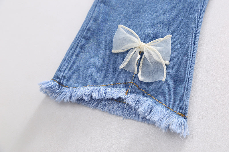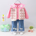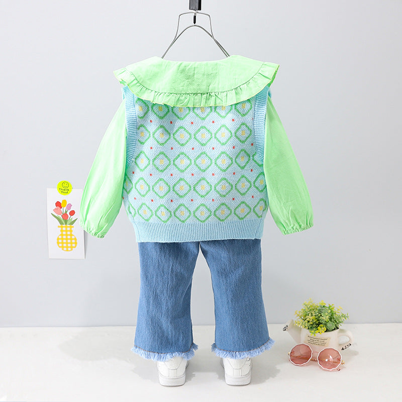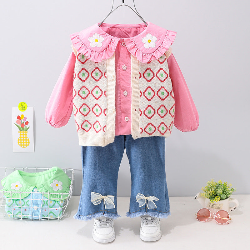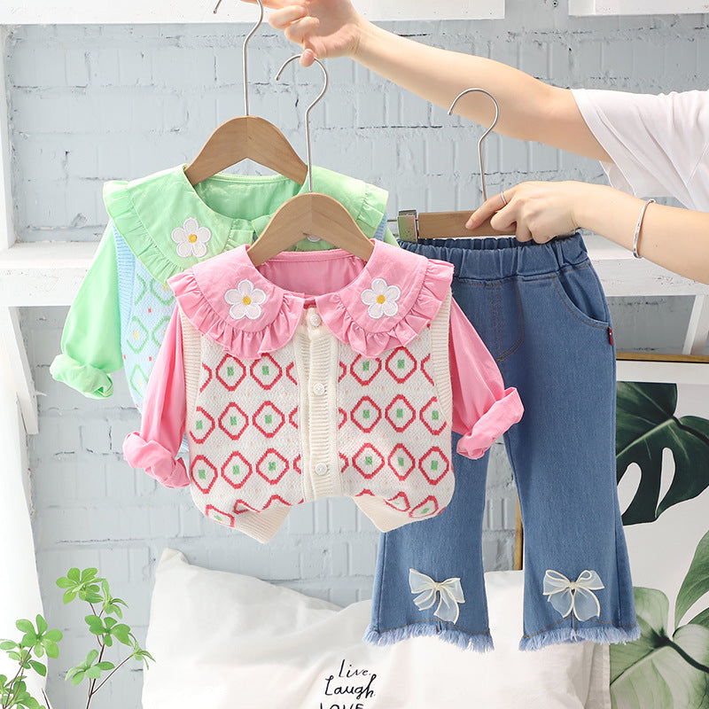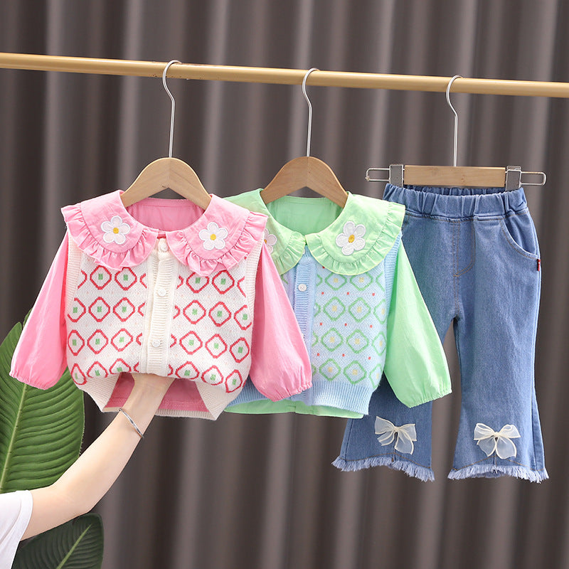 طقم بناتي 3 قطع ( قميص + فست صوف + بنطلون جينز )