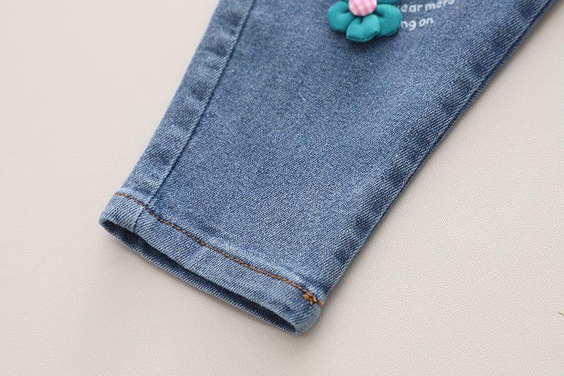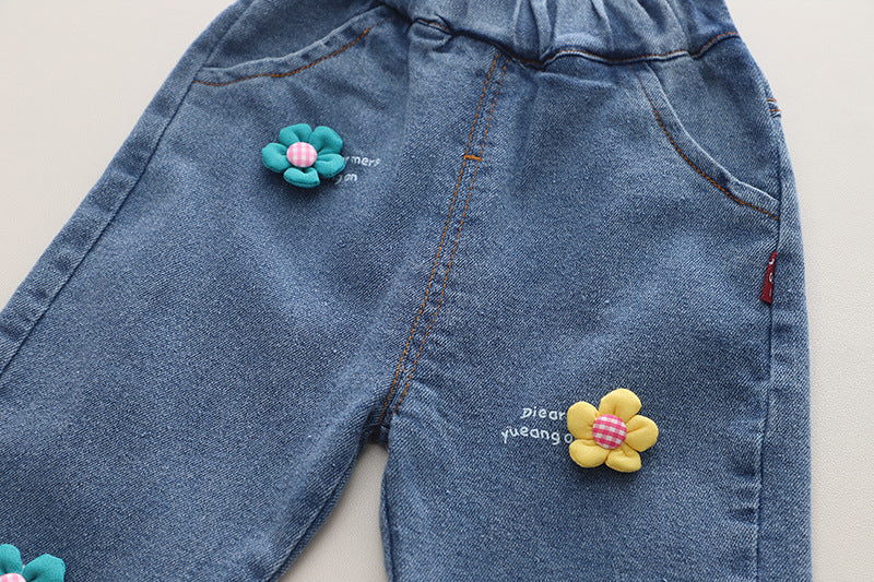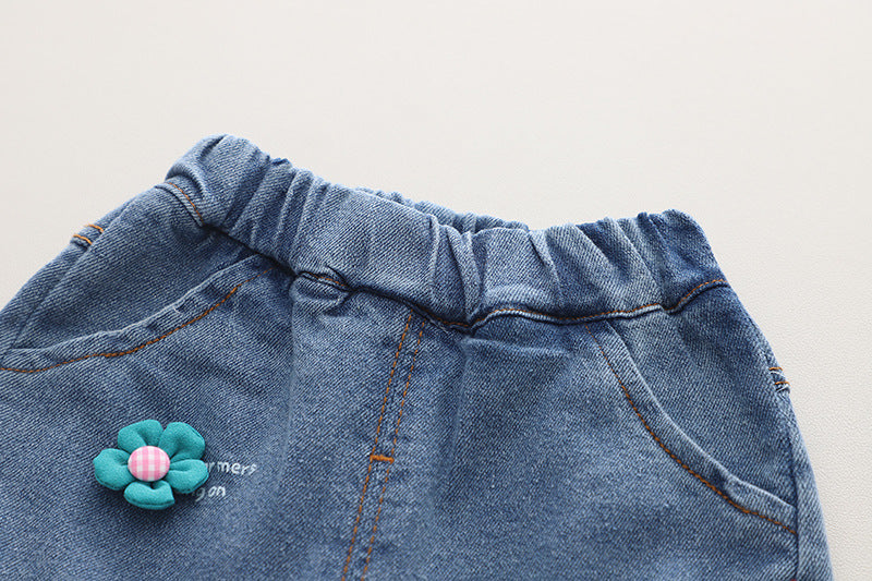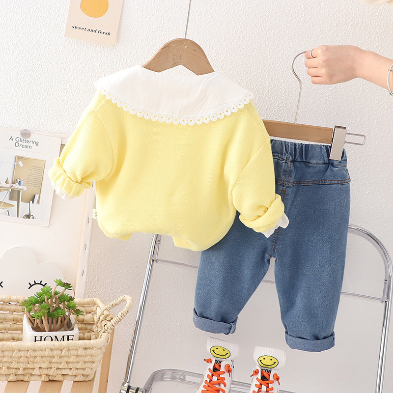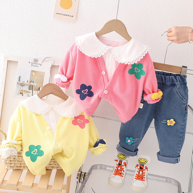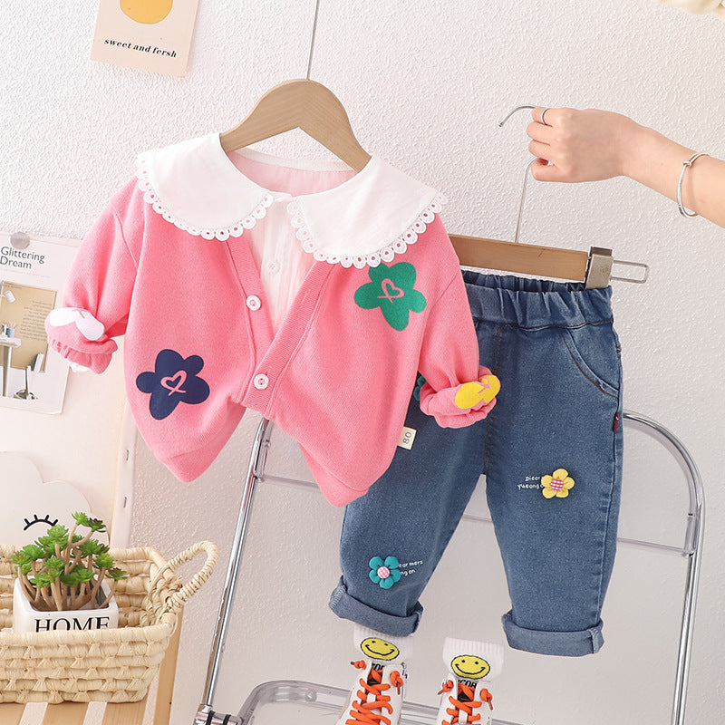 طقم بناتي 3 قطع ( قميص + جكيت مورد+ بنطلون جينز ناعم )