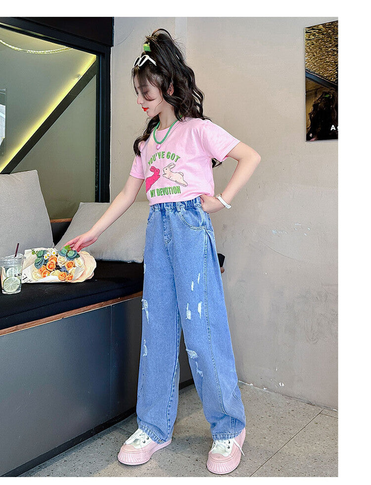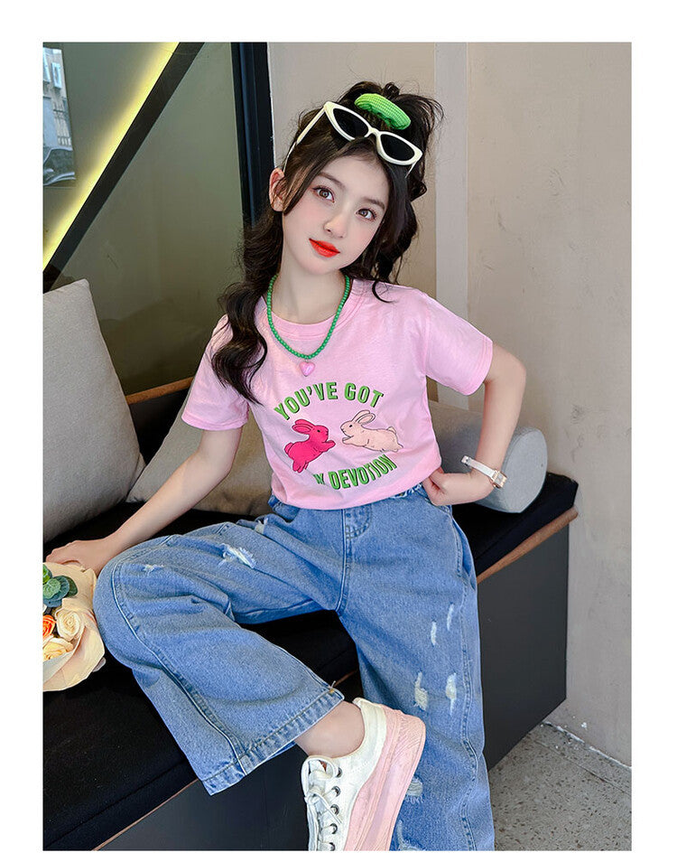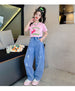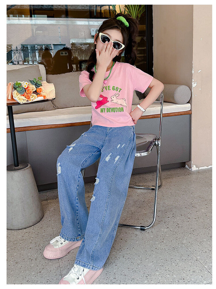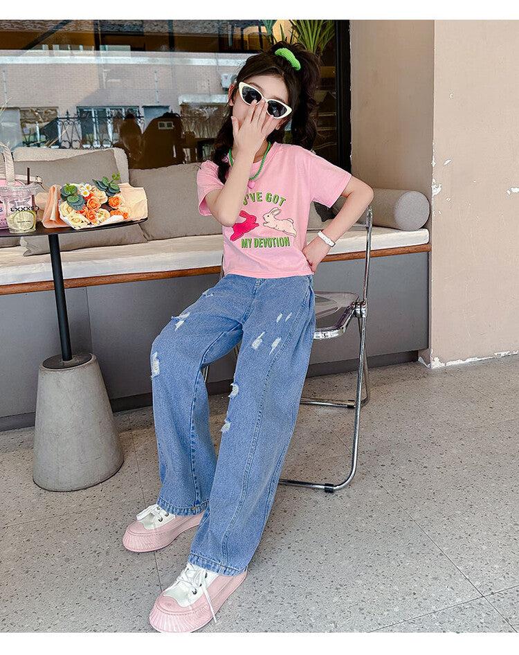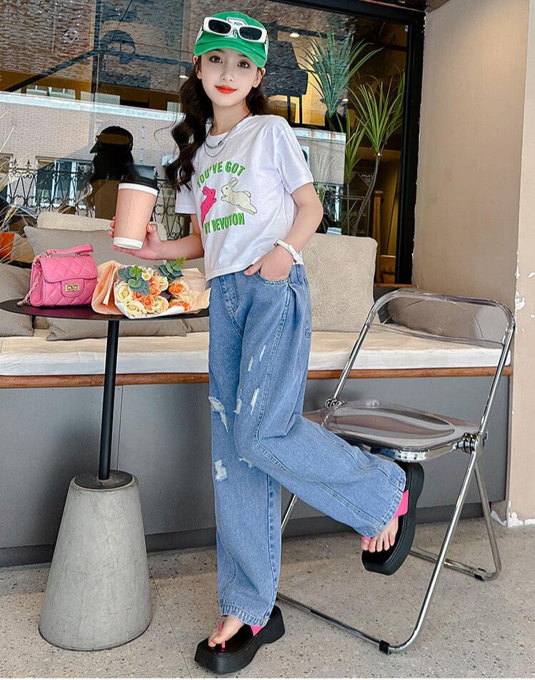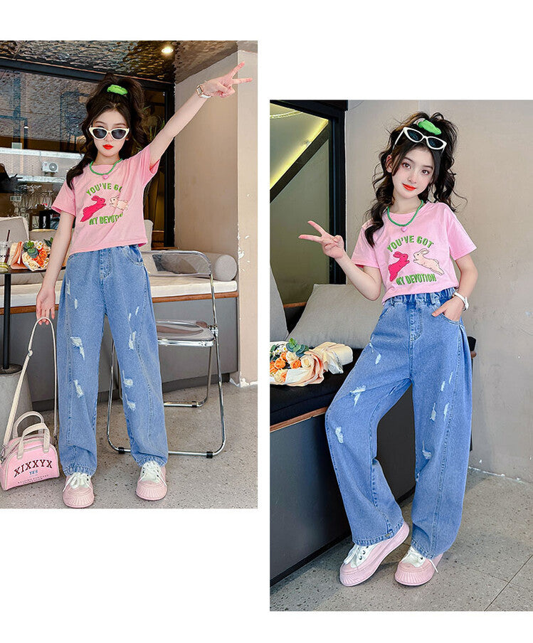 FU14042024-22 طقم بناتي صيفي قطعتين ( بلوزة قطنية + بنطلون جينز)