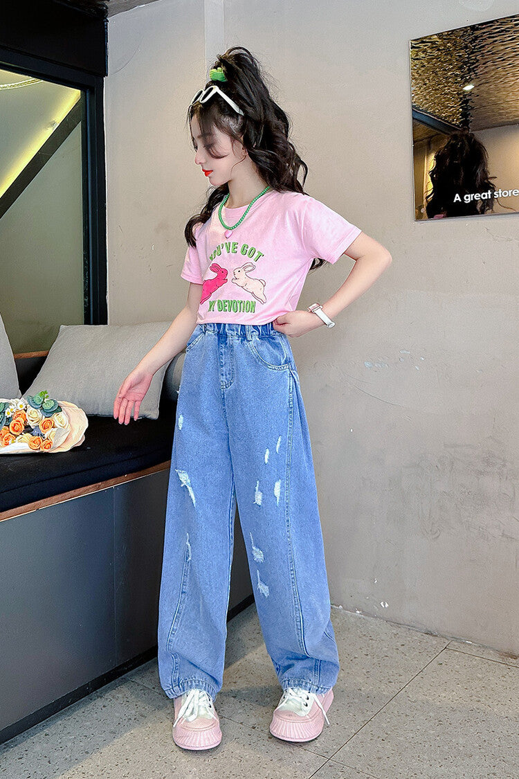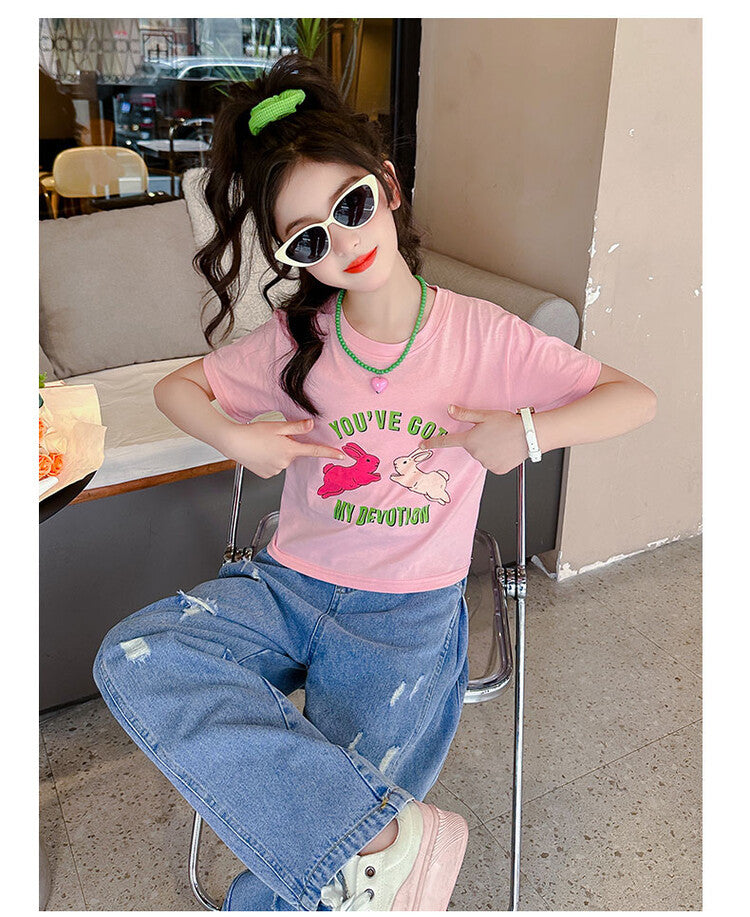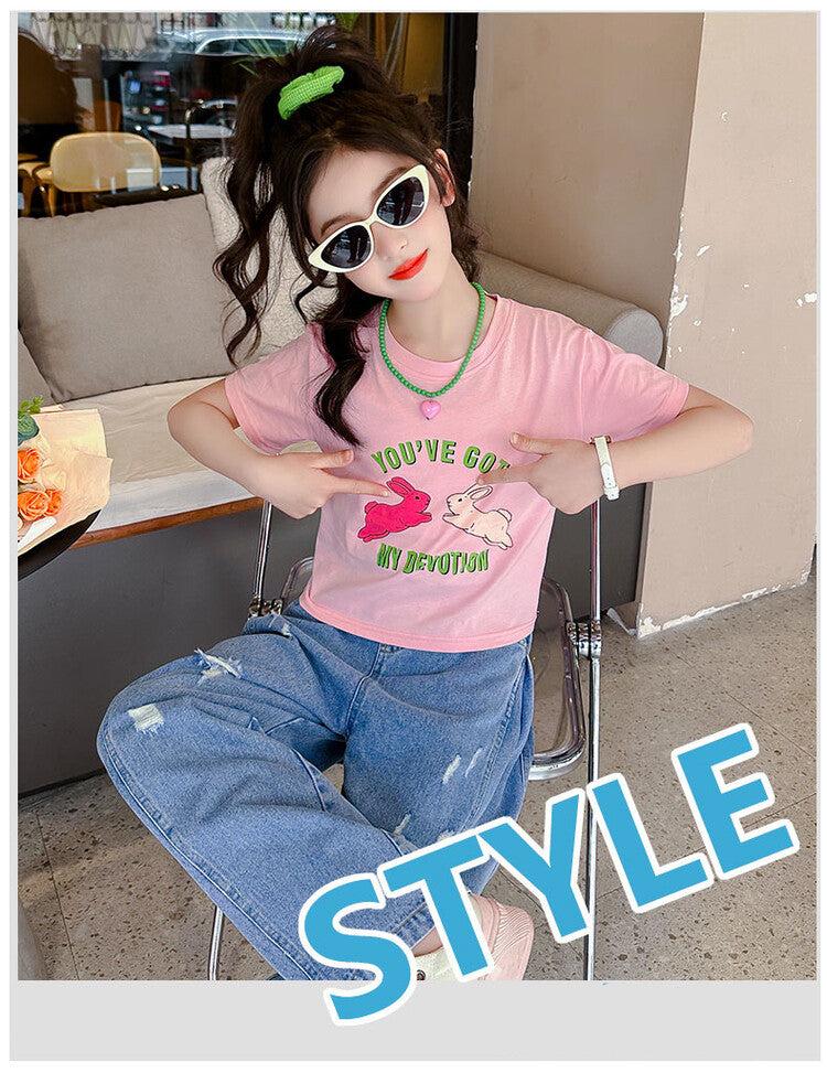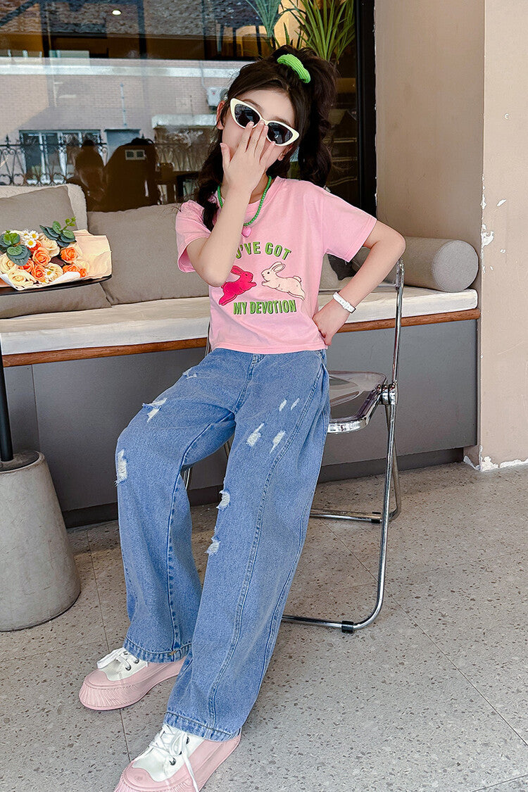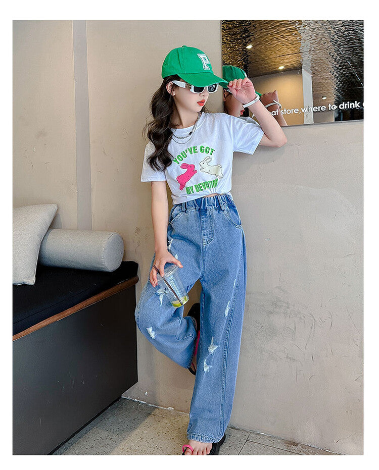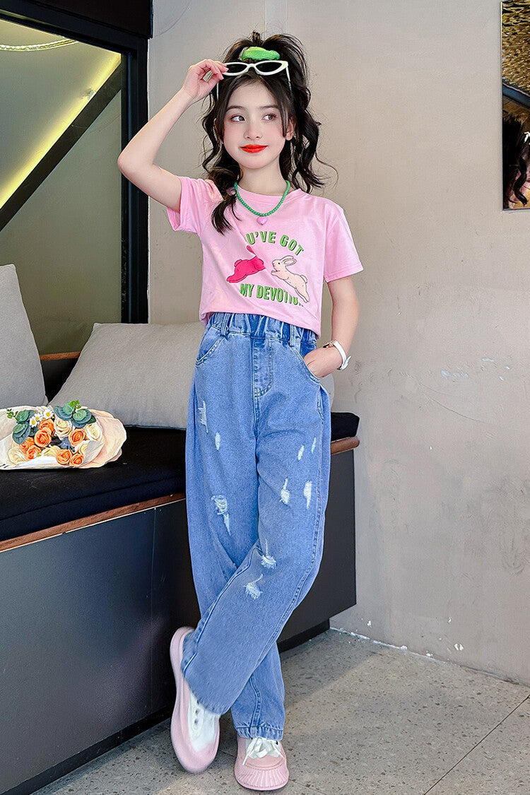 FU14042024-22 طقم بناتي صيفي قطعتين ( بلوزة قطنية + بنطلون جينز)
