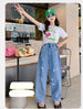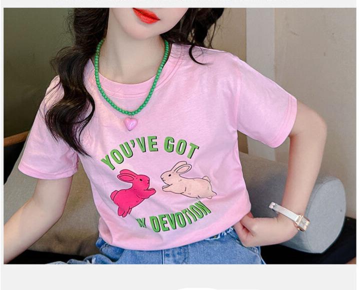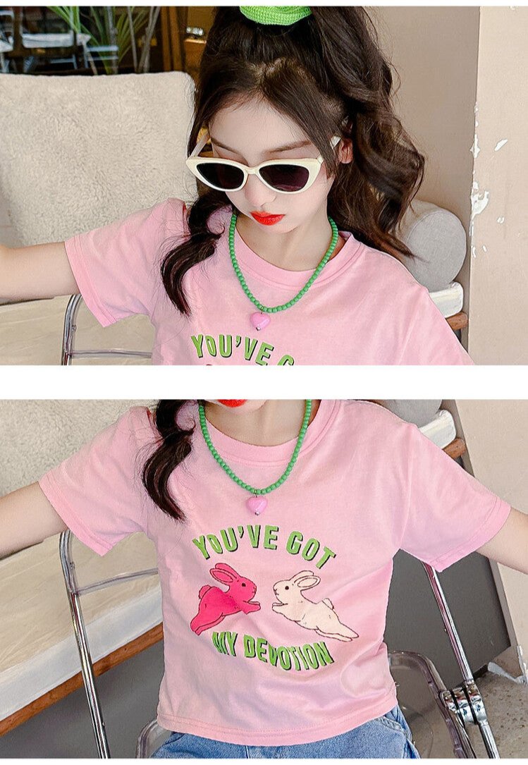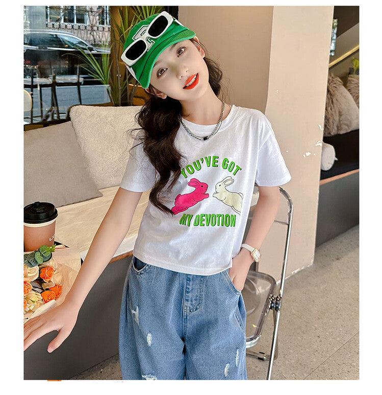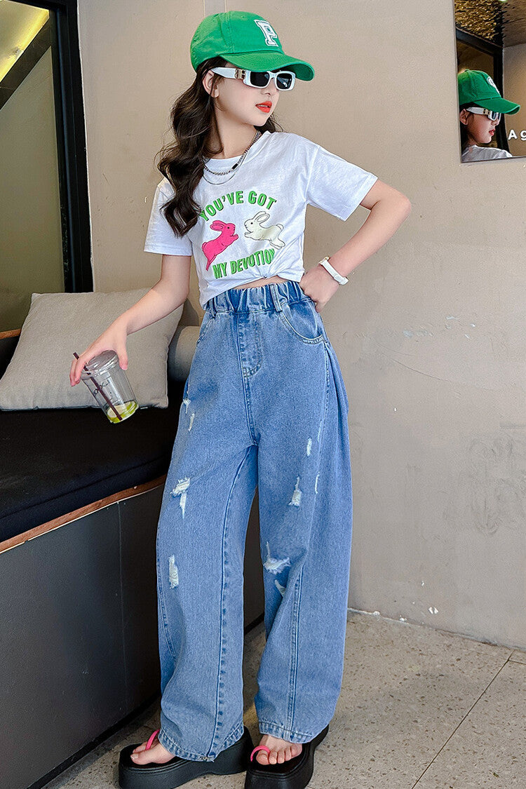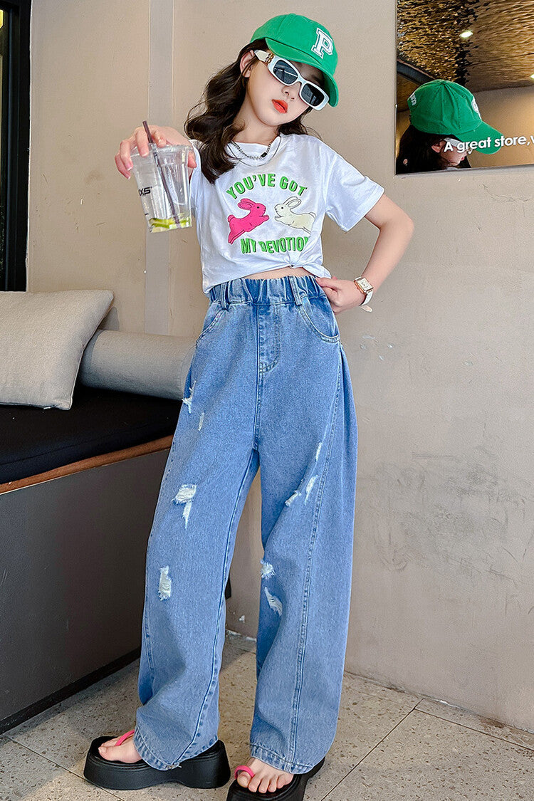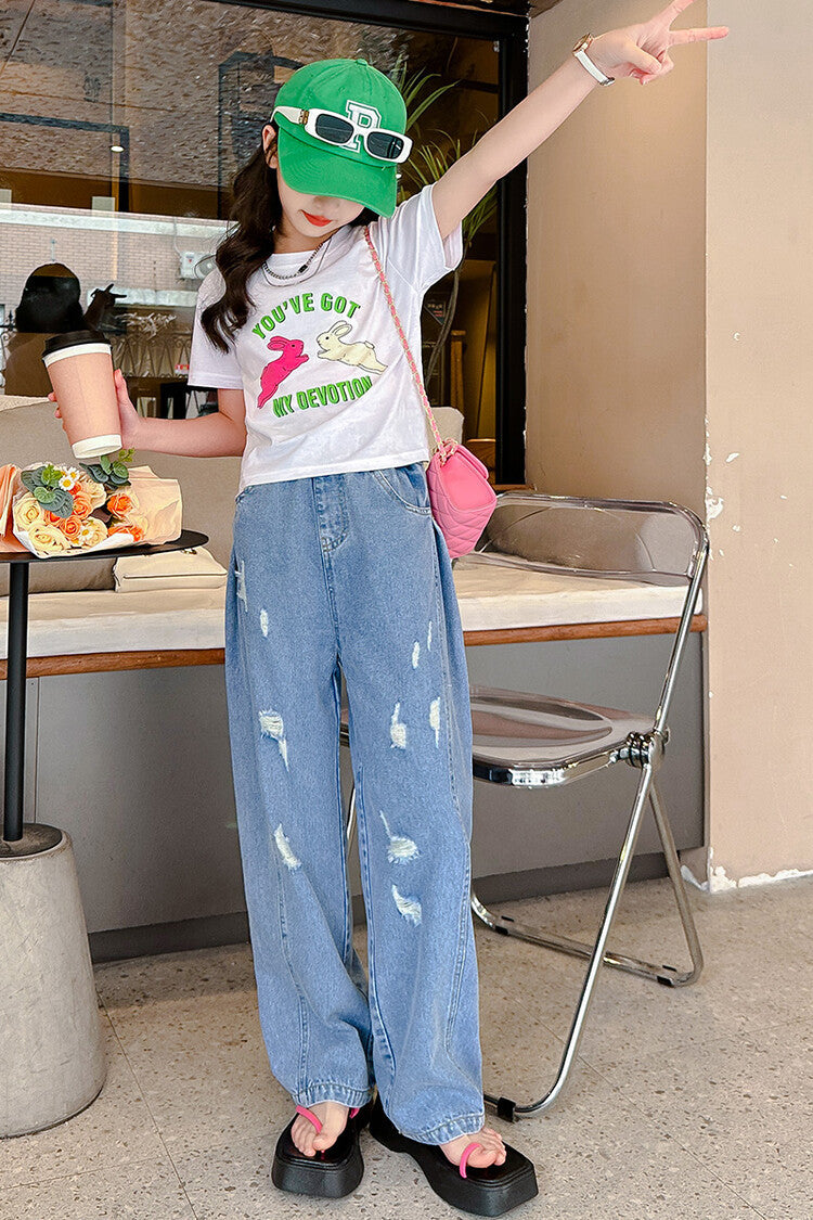 FU14042024-22 طقم بناتي صيفي قطعتين ( بلوزة قطنية + بنطلون جينز)
