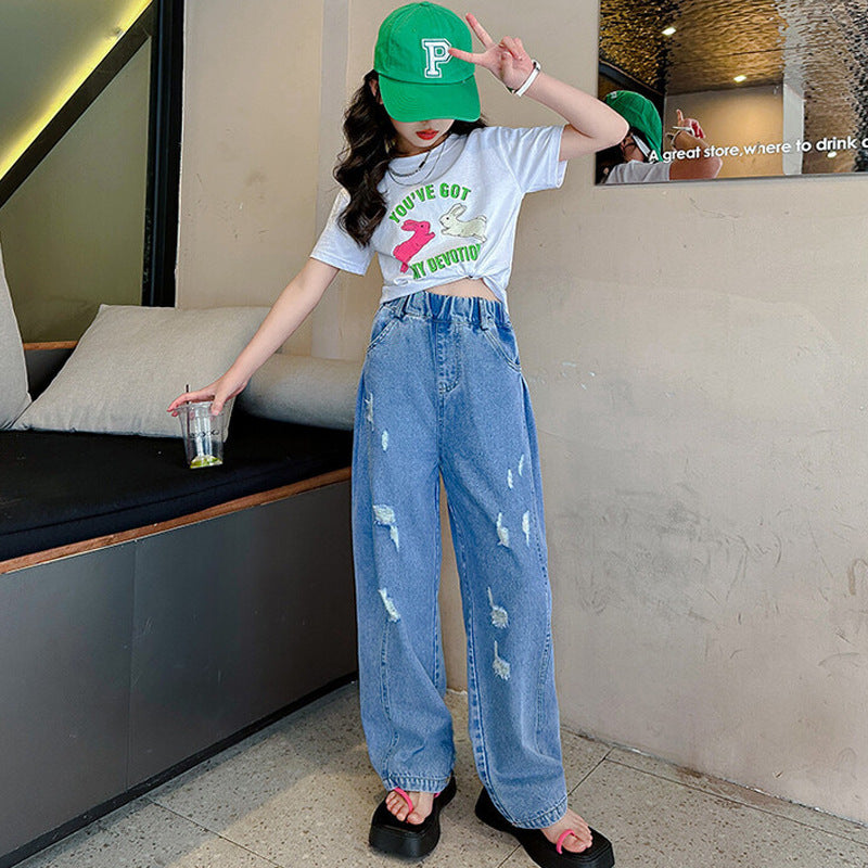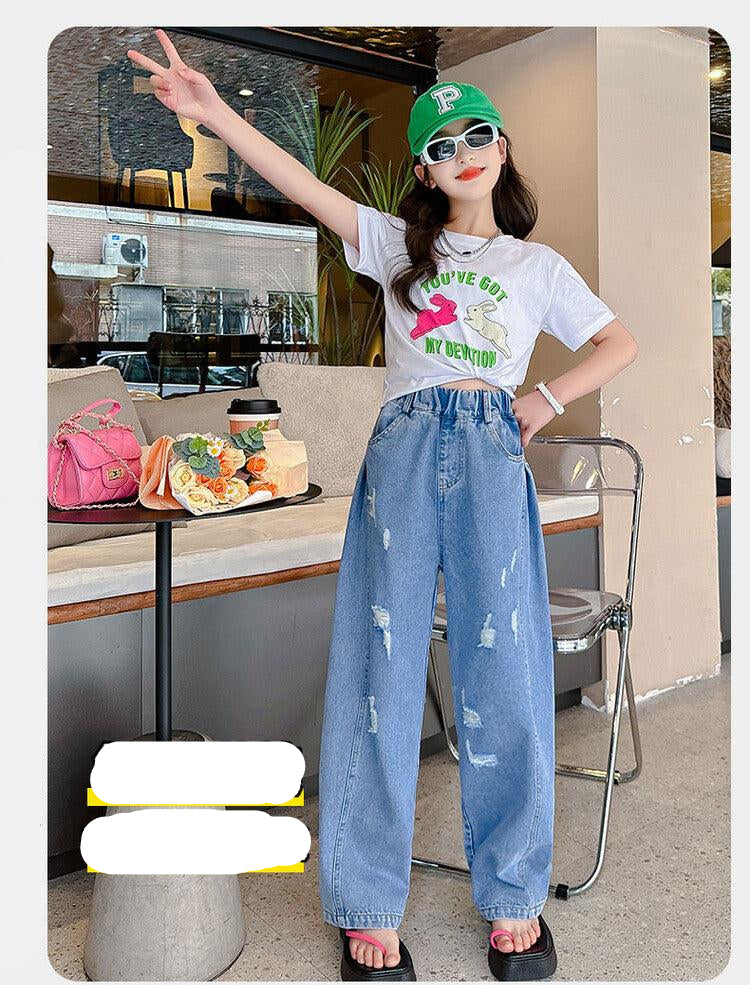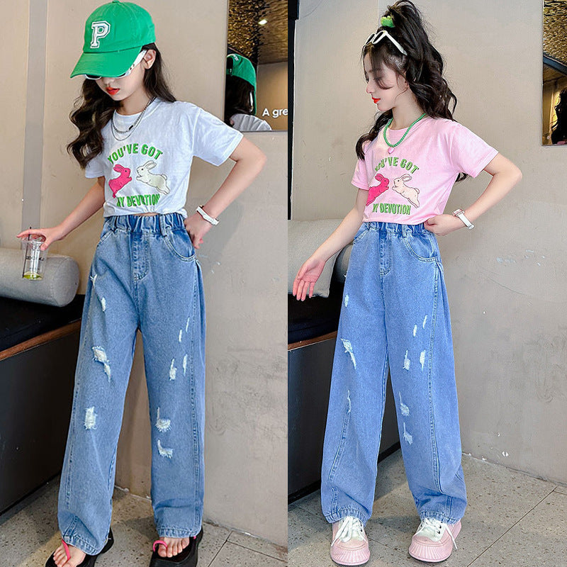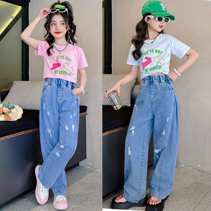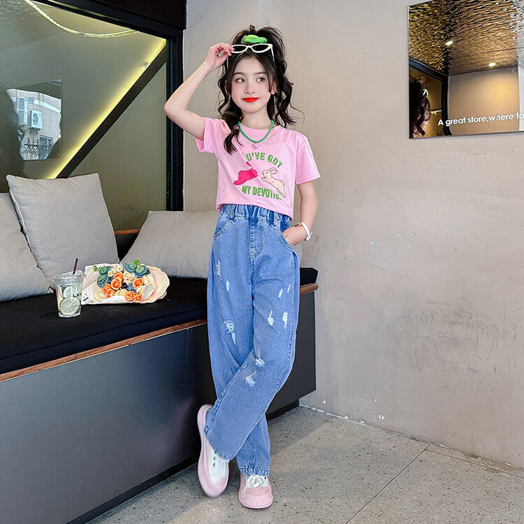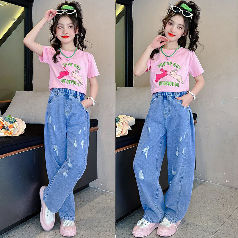 طقم بناتي صيفي قطعتين ( بلوزة قطنية + بنطلون جينز)