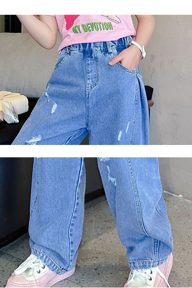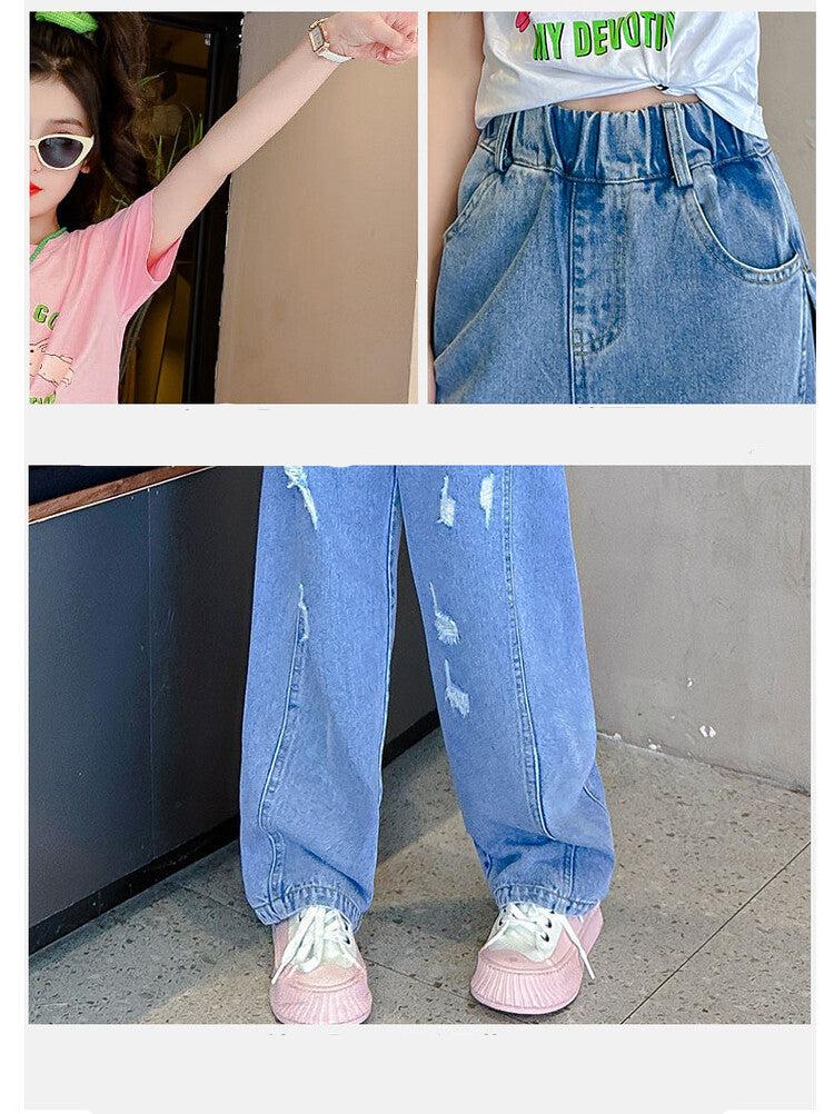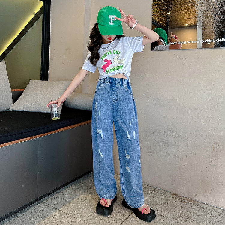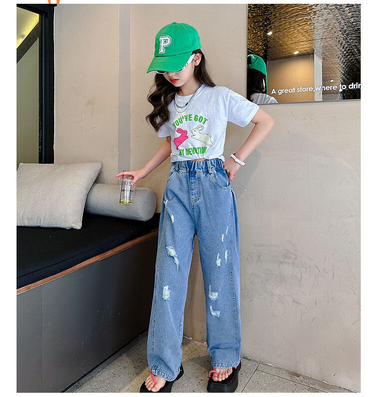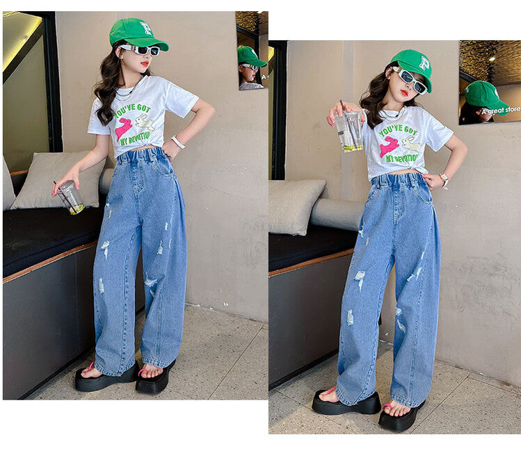 طقم بناتي صيفي قطعتين ( بلوزة قطنية + بنطلون جينز)