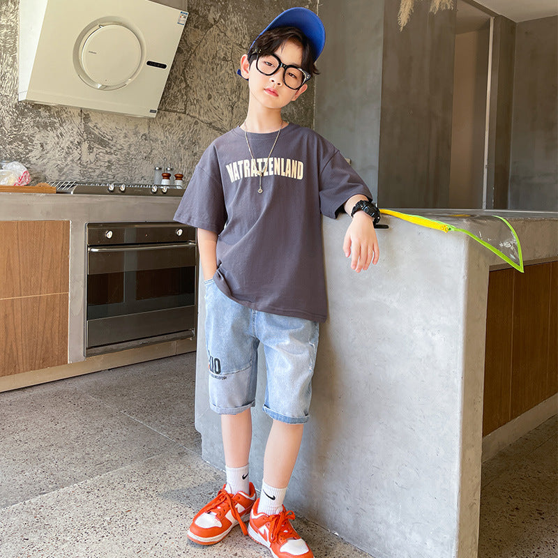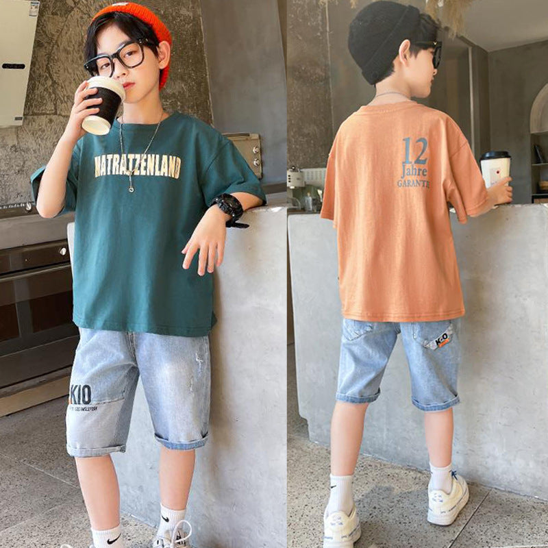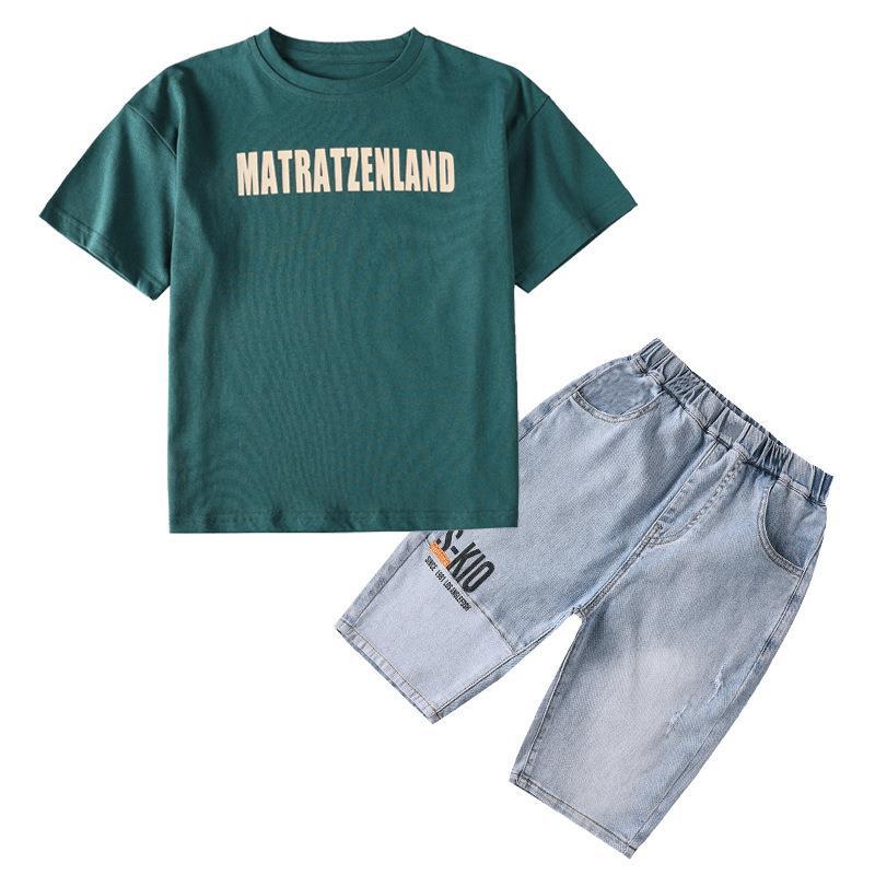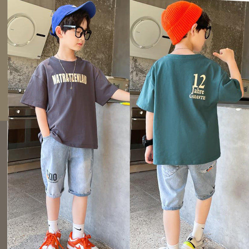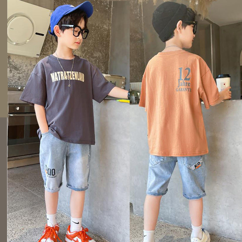 طقم ولادي صيفي قطعتين ( بلوز قطنية + بنطلون جينز)