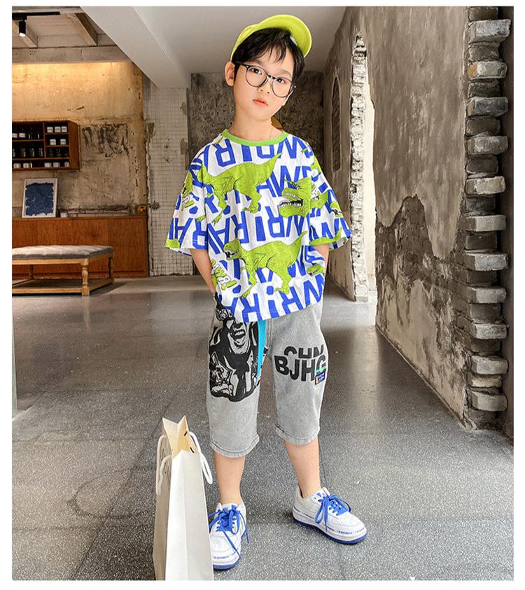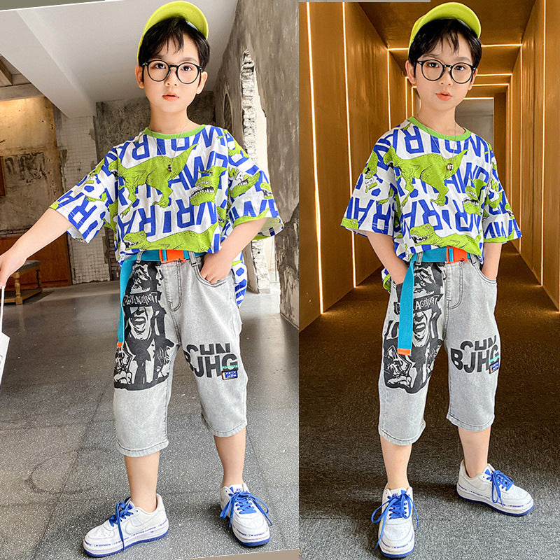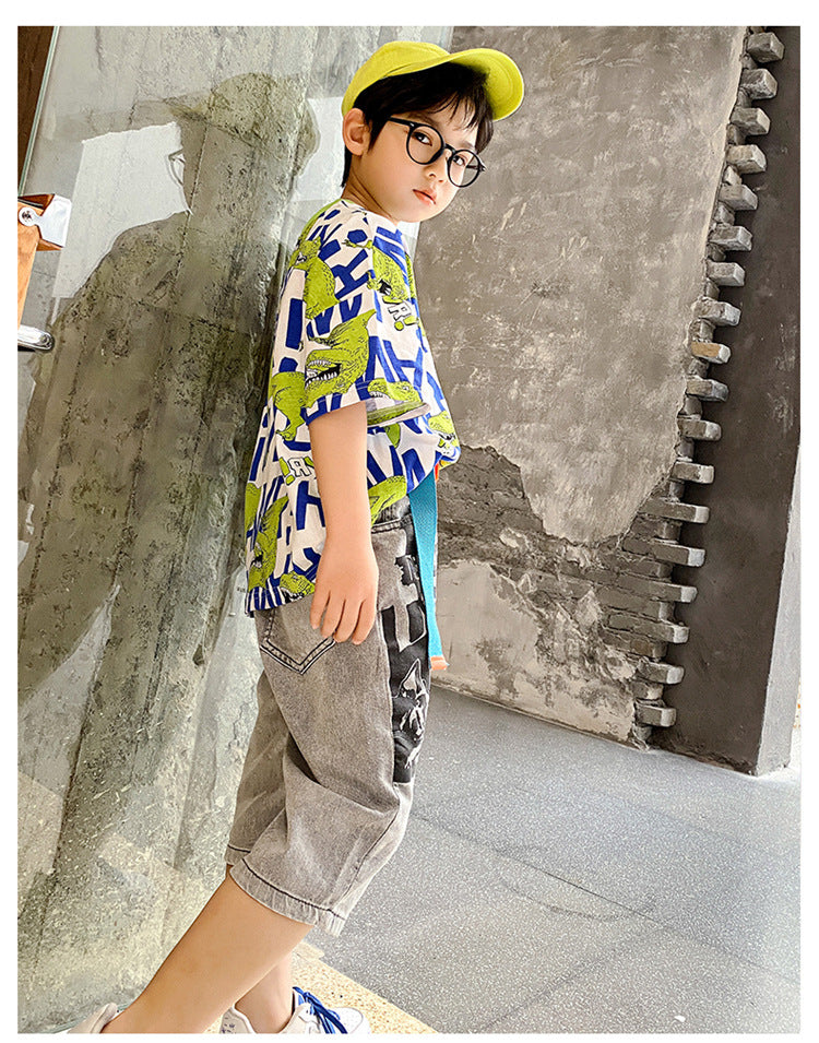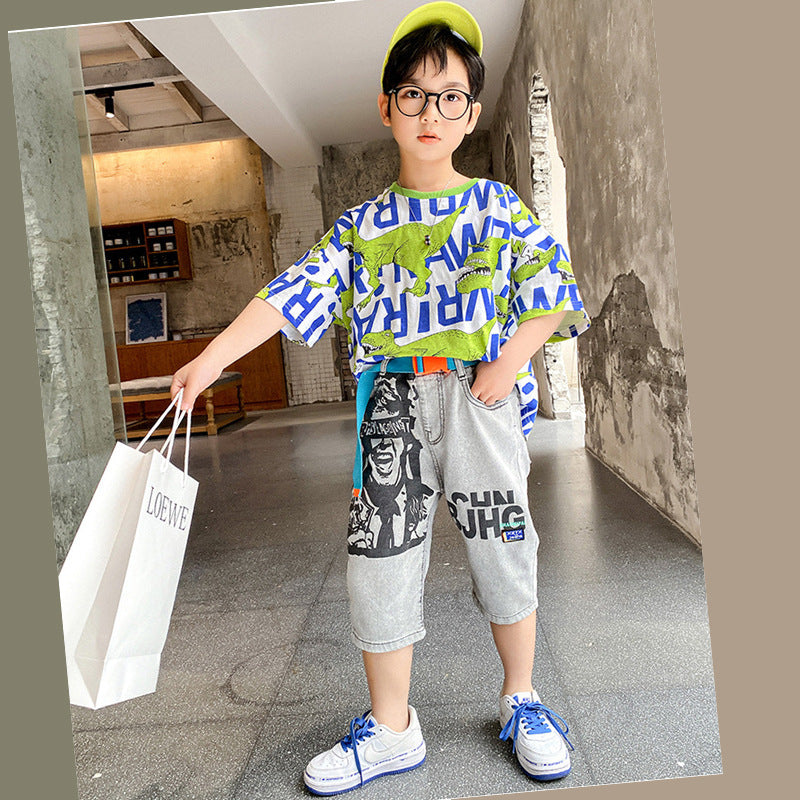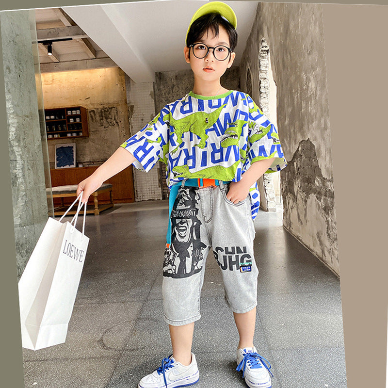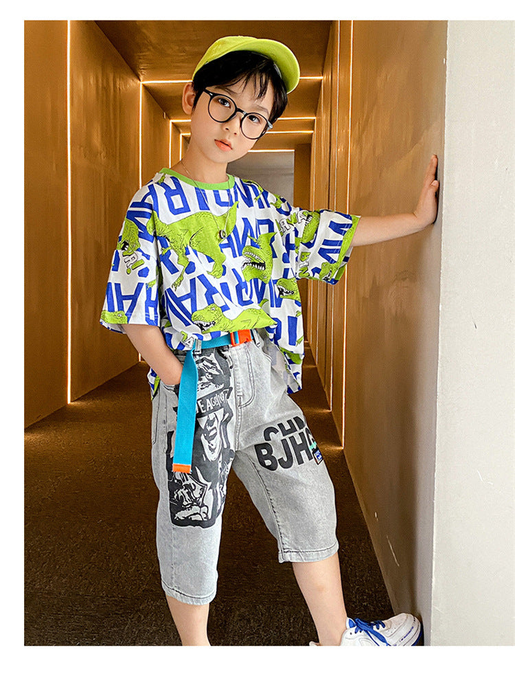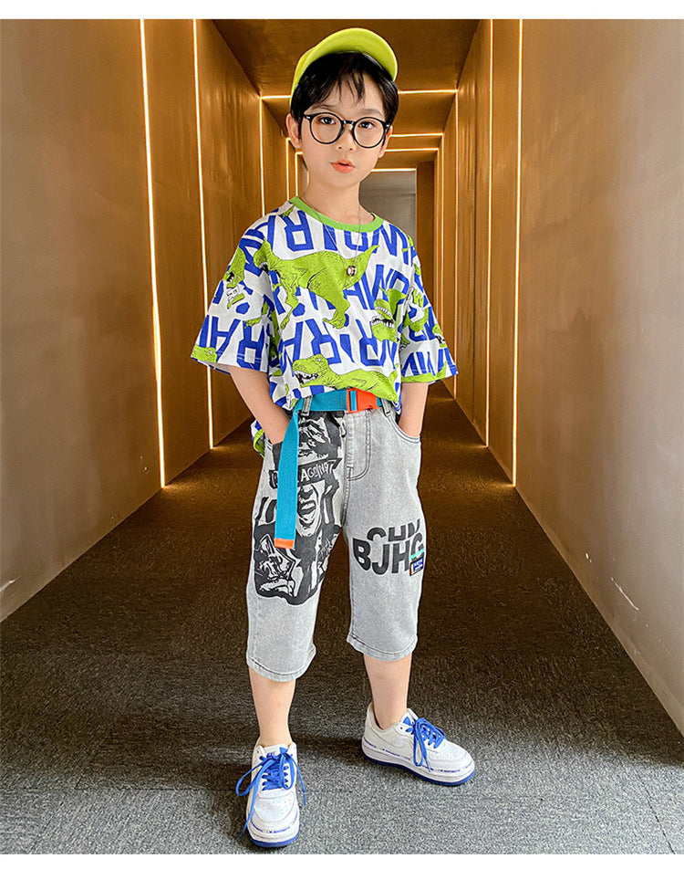 FU14042024-44 طقم ولادي صيفي ( بلوزة قطنية + بنطلون جينز + حزام وسط)