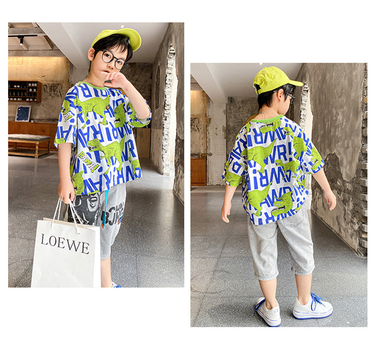 طقم ولادي صيفي ( بلوزة قطنية + بنطلون جينز + حزام وسط)