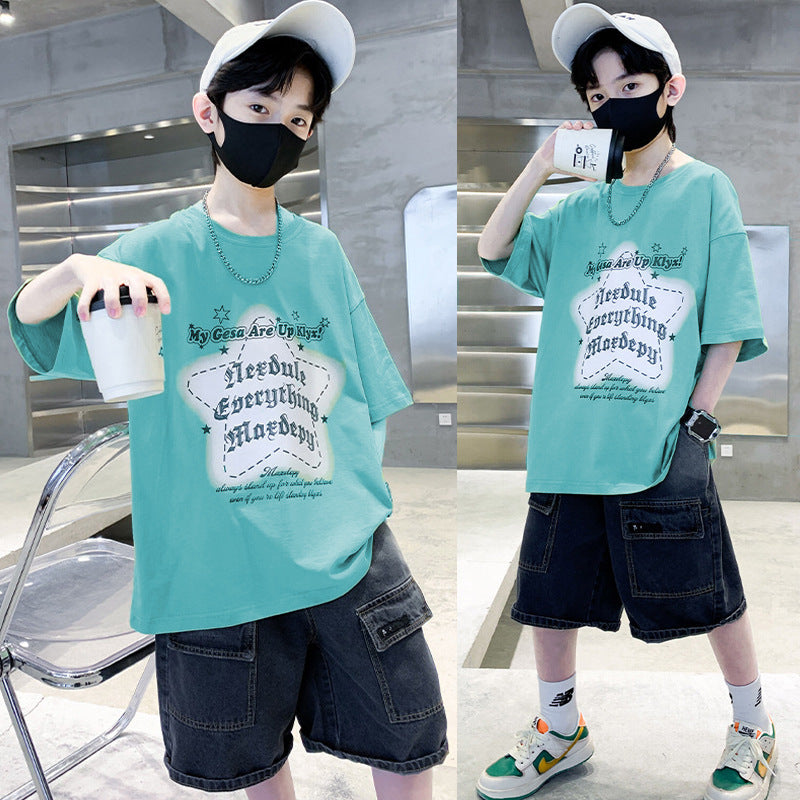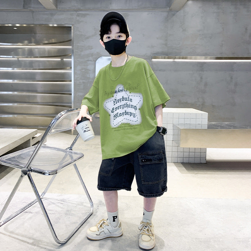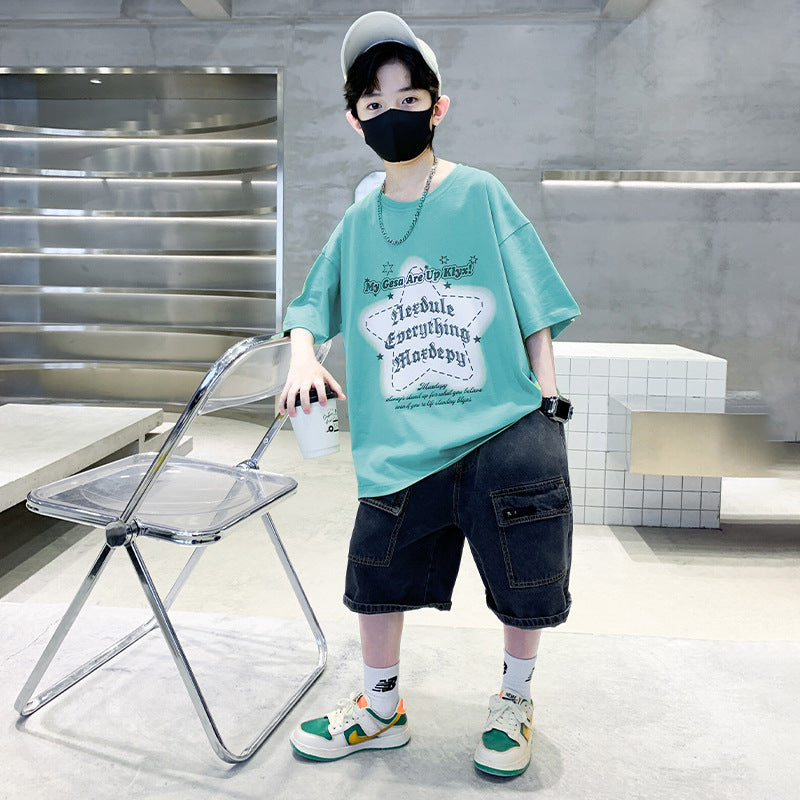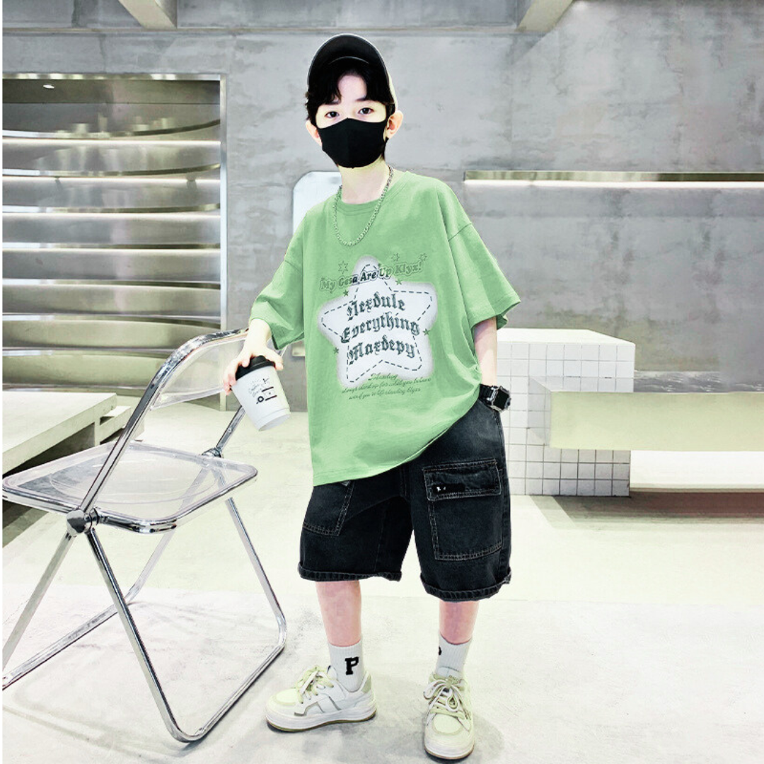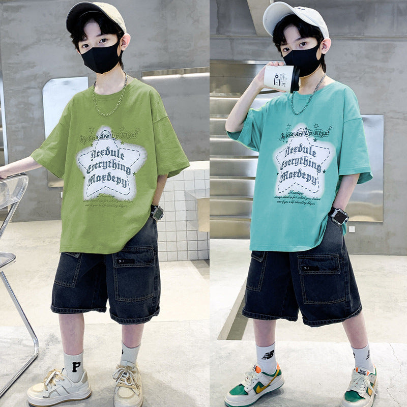 طقم ولادي قطعتين صيفي ( بلوزة قطنية + بنطلون جينز )