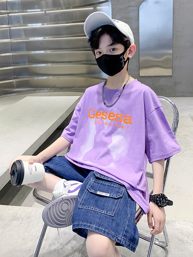 طقم ولادي صيفي قعطتين ( بلوز + بنطلون جينز)