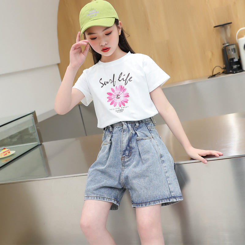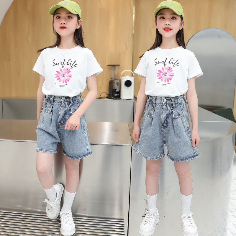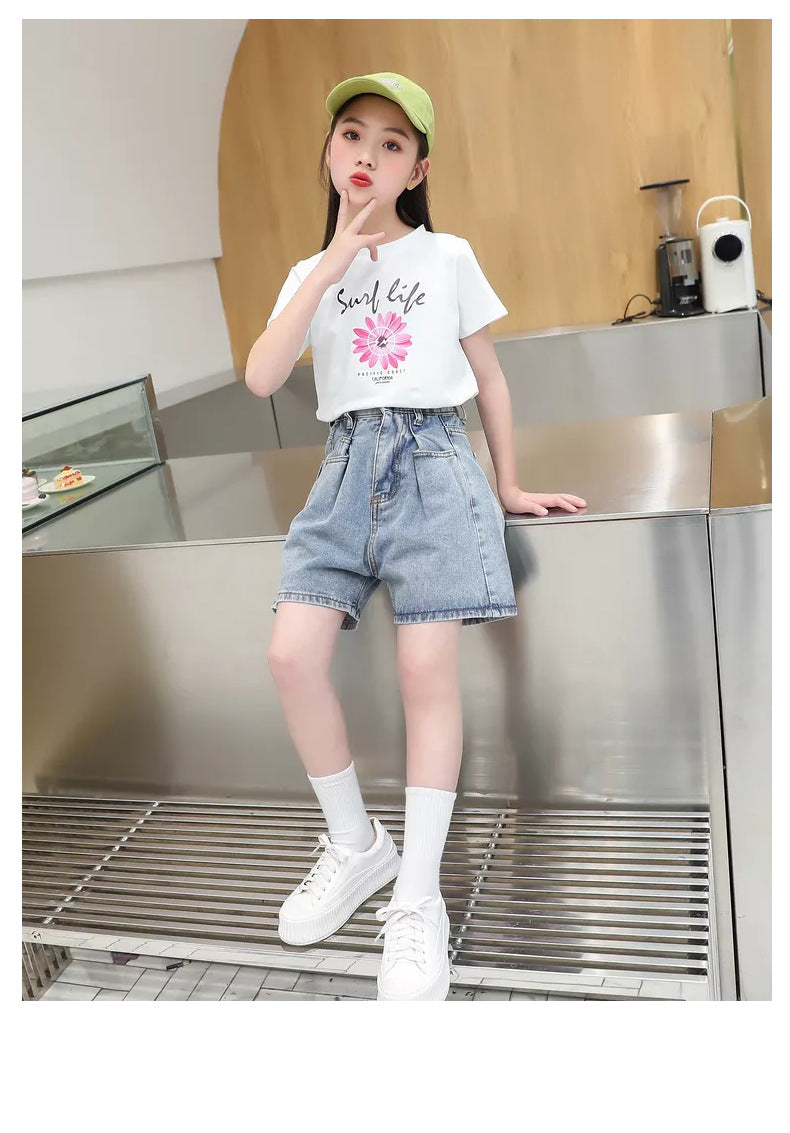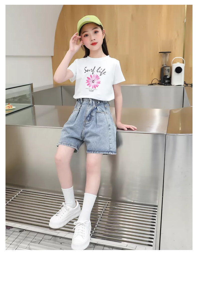 طقم بناتي صيفي قطعتين ( بلوز قطنية + شورت جينز )