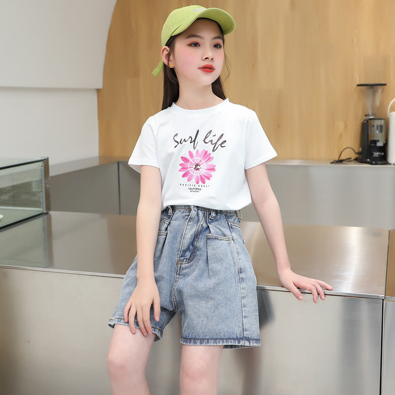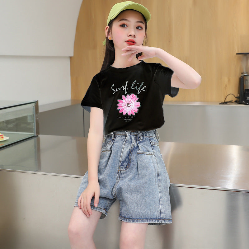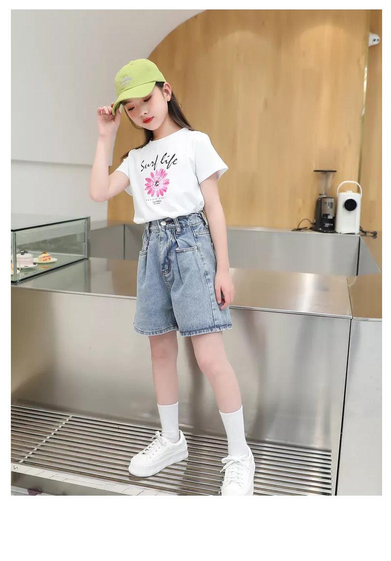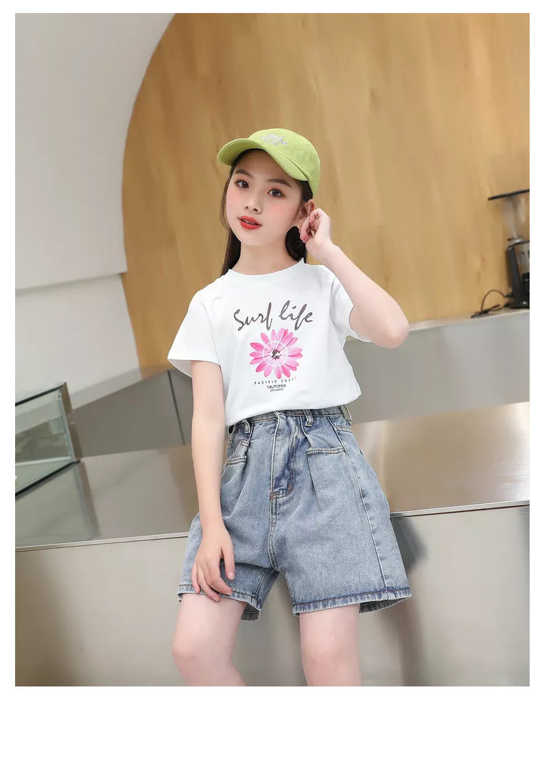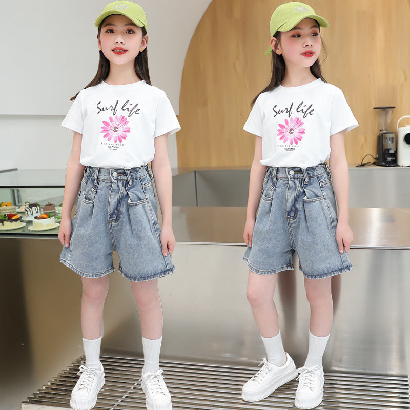 طقم بناتي صيفي قطعتين ( بلوز قطنية + شورت جينز )
