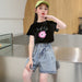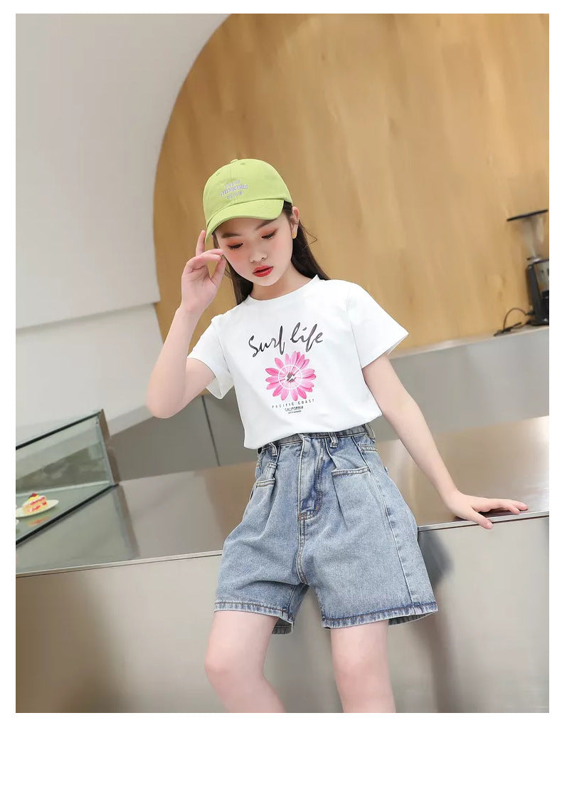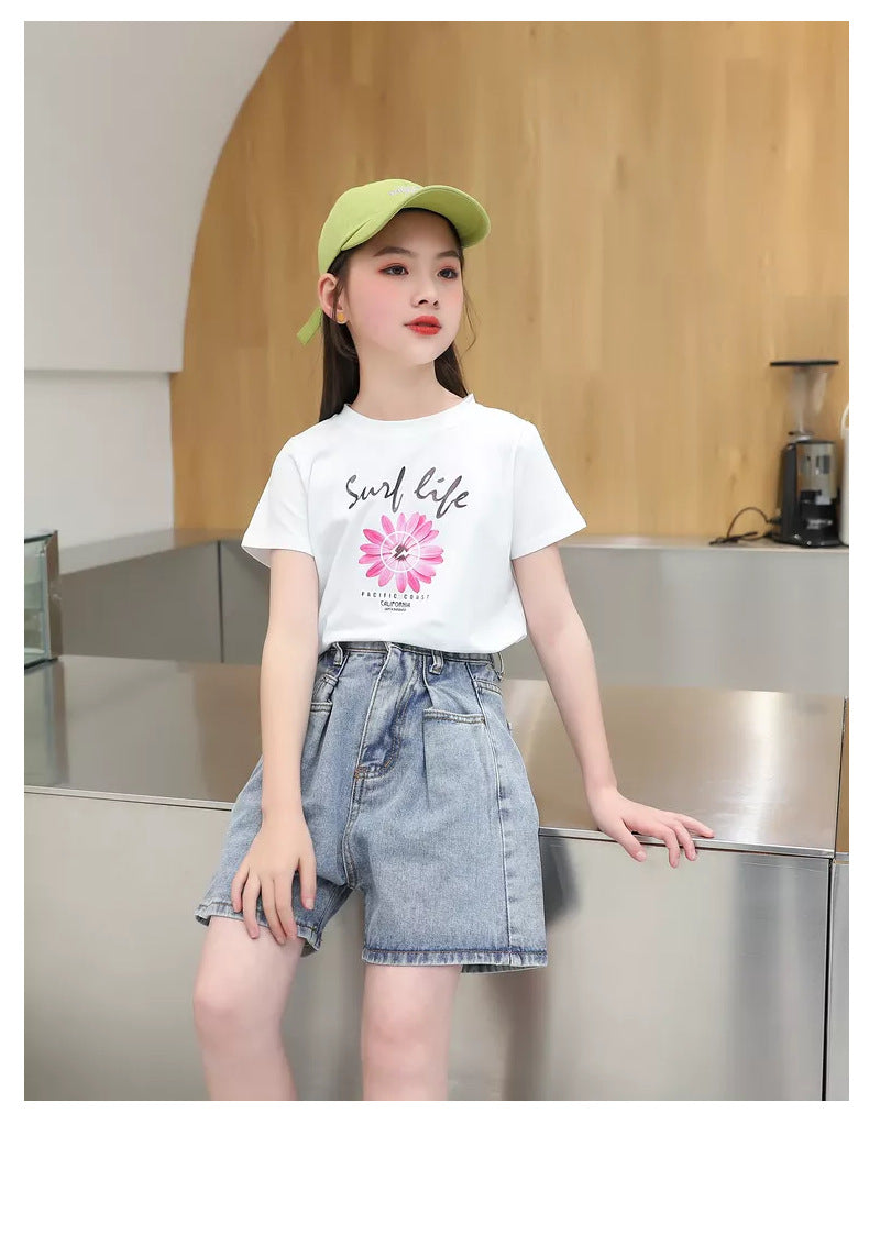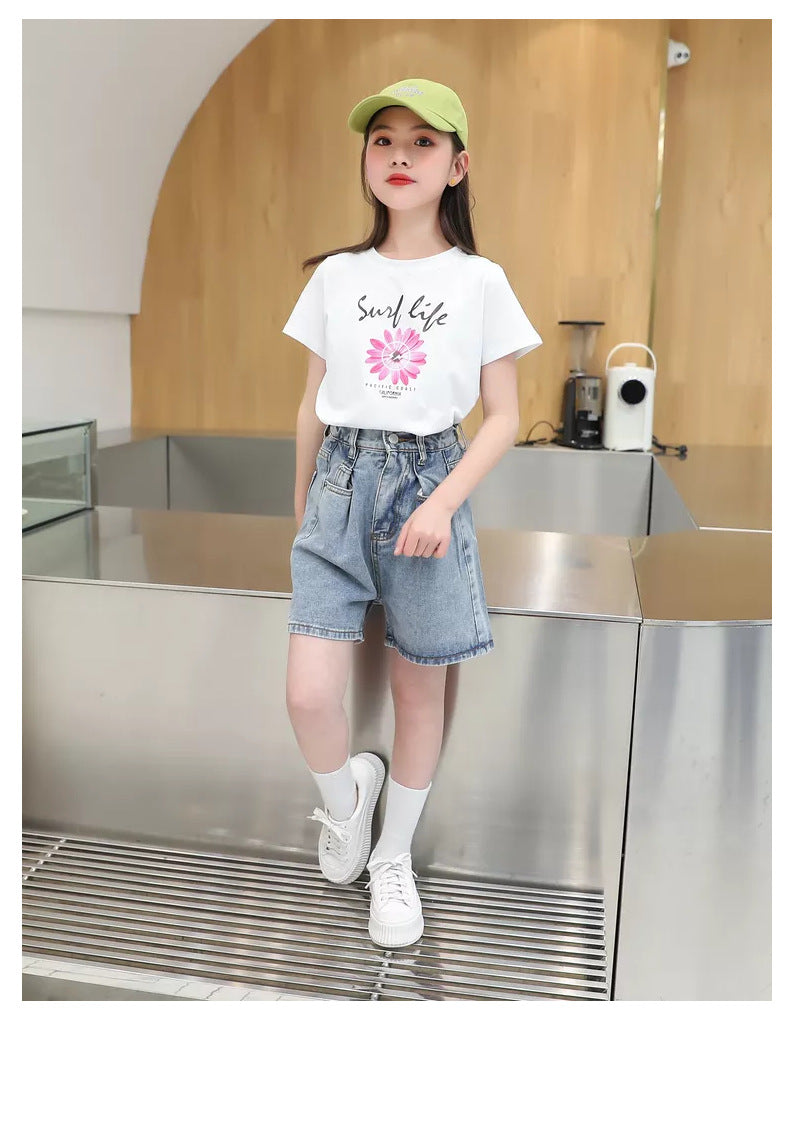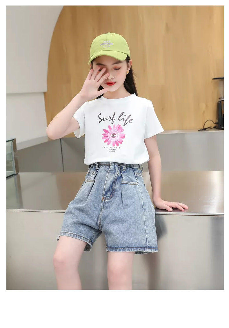 FU14042024-6 طقم بناتي صيفي قطعتين ( بلوز قطنية + شورت جينز )