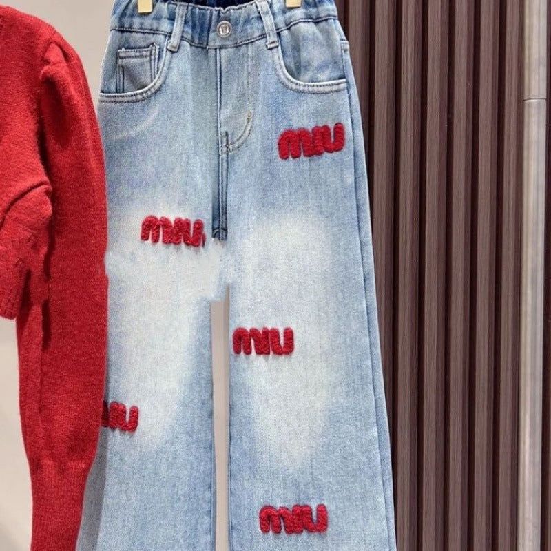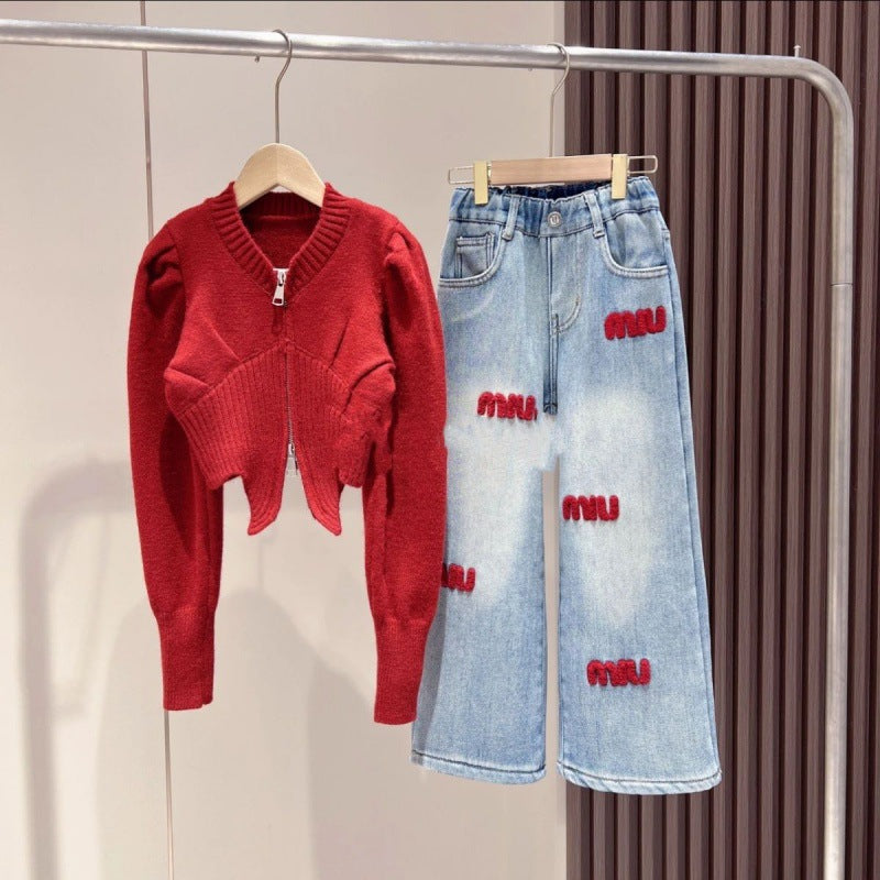 RM0115-10 طقم بناتي شتوي بلوزة صوف + بنطلون جينز مبطن فرو من الداخل