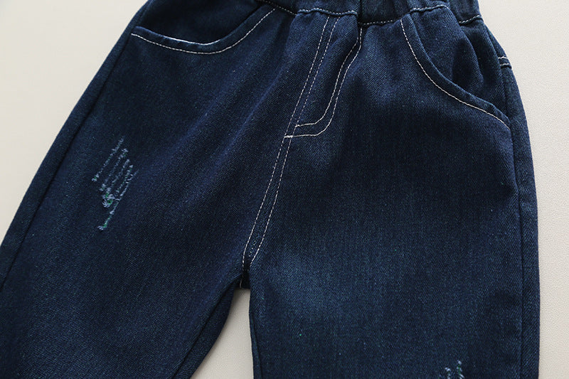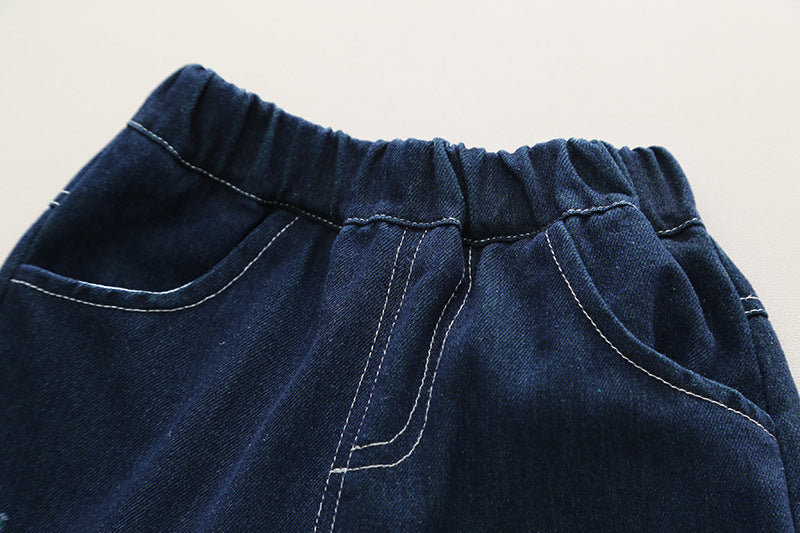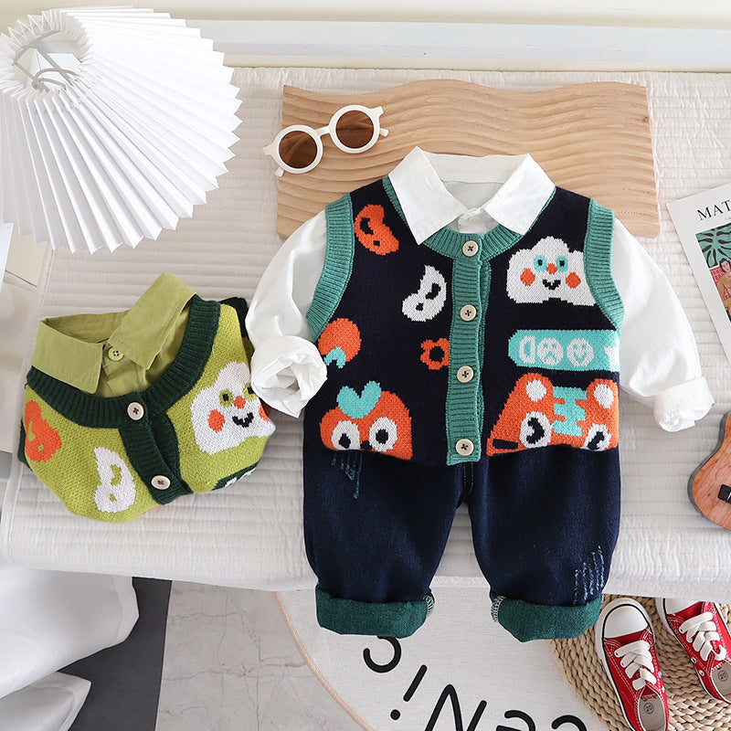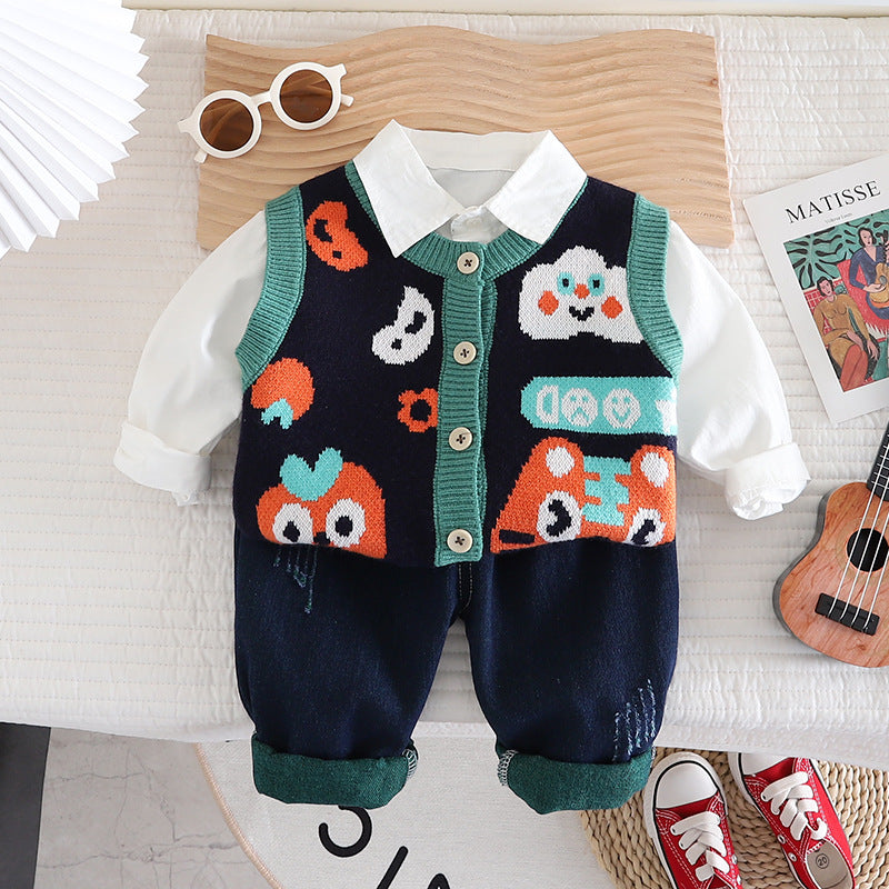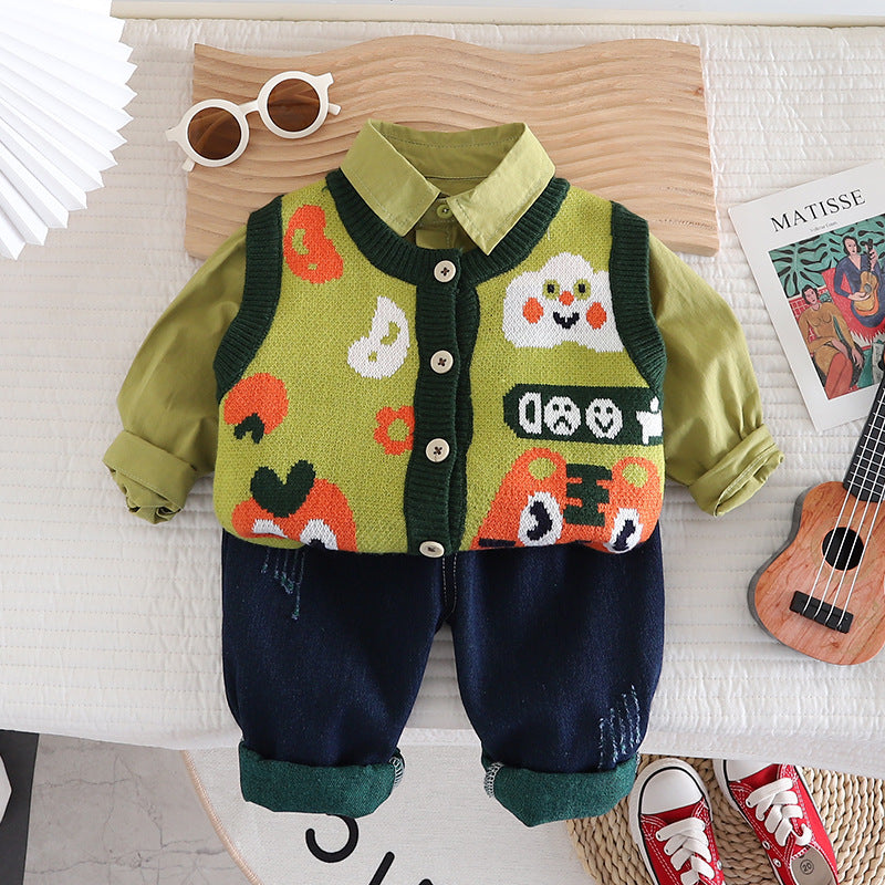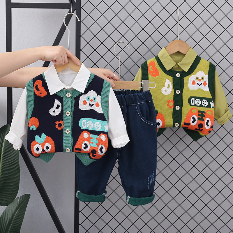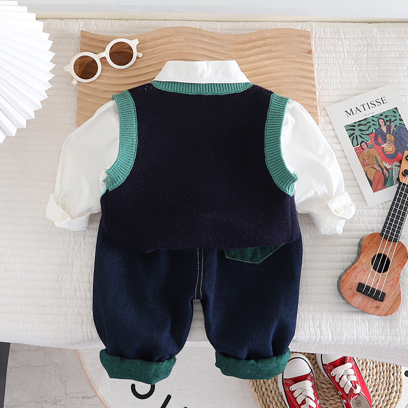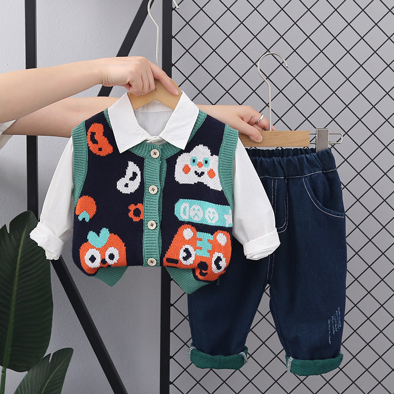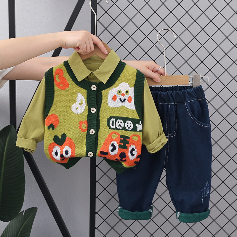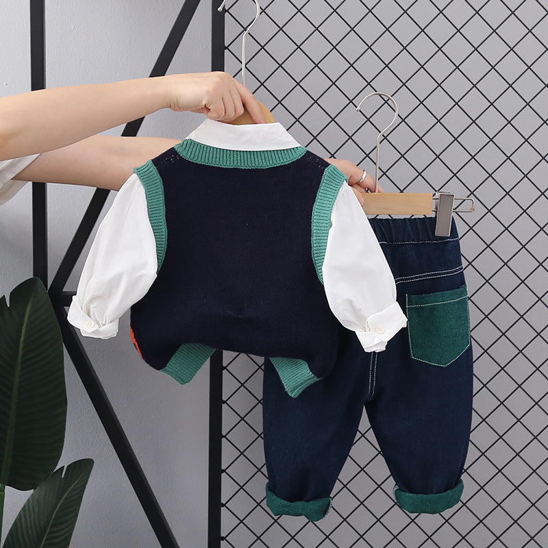 طقم ولادي 3 قطع ( قميص + فست صوف + بنطلون جينز )