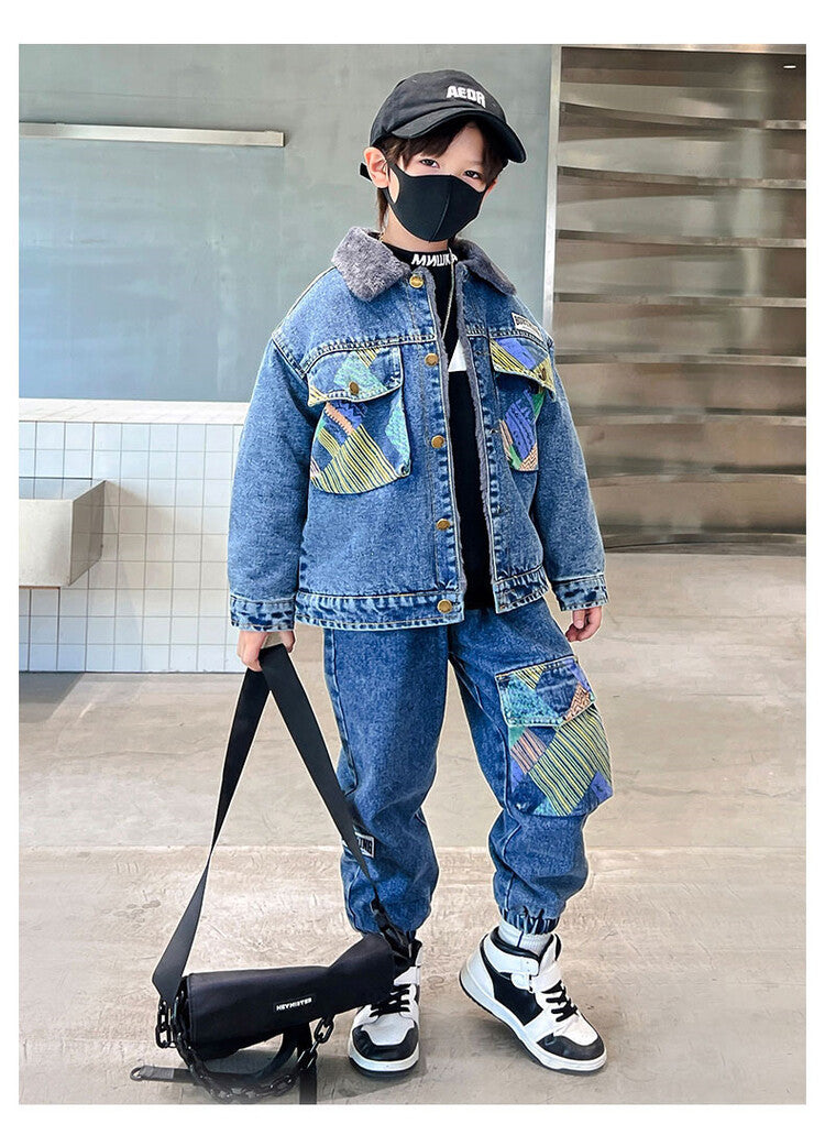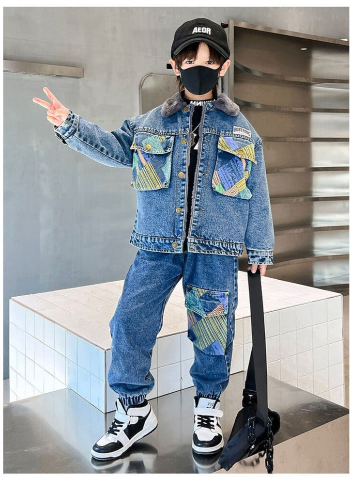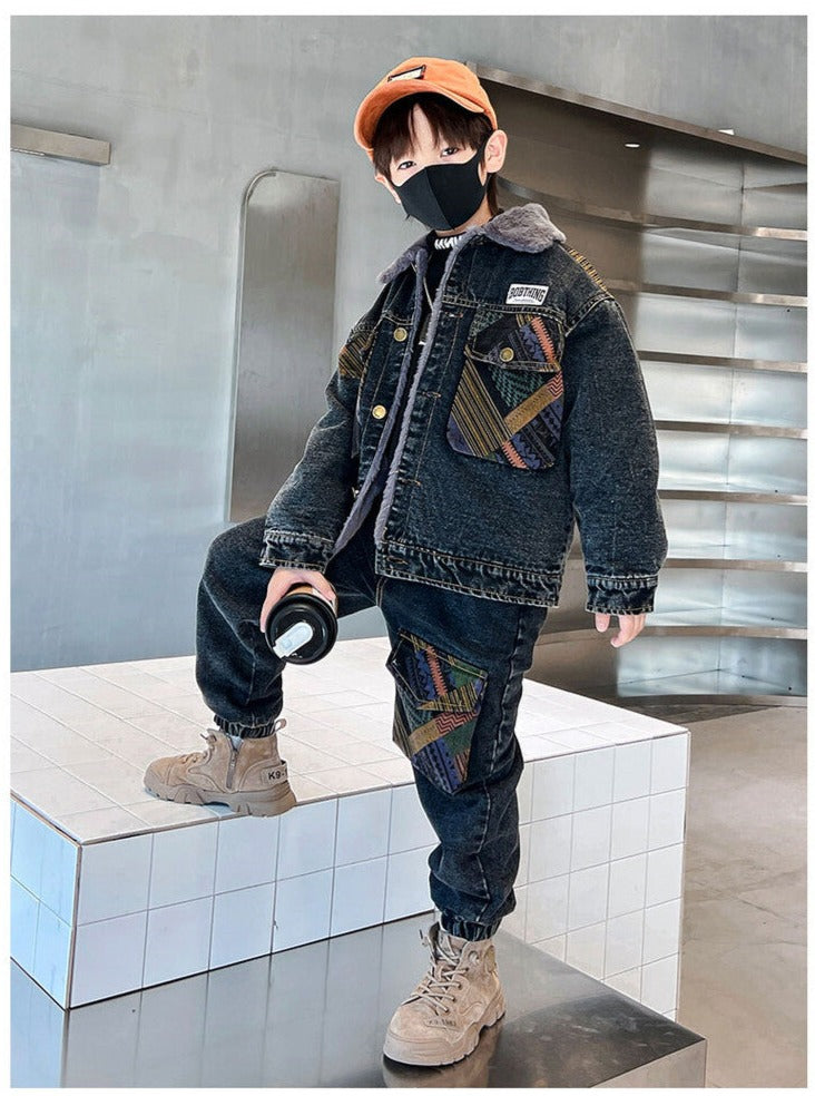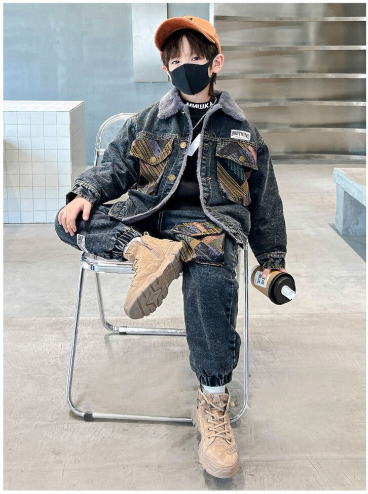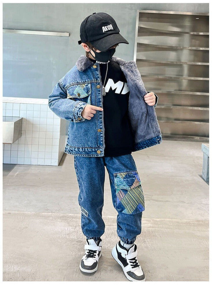 RM1231-02 طقم جينز ولادي قطعتين مبطن فرو بالكامل شتوي ( جكيت + بنطلون )