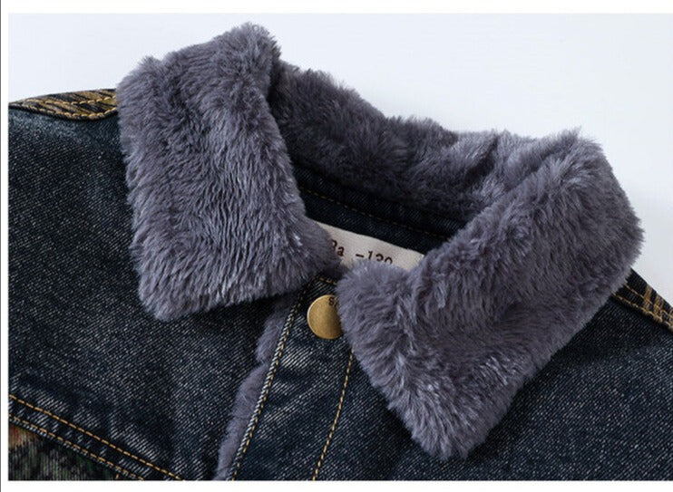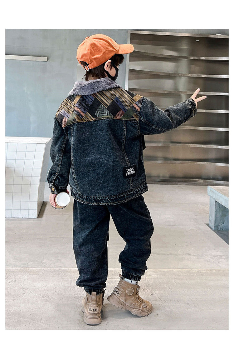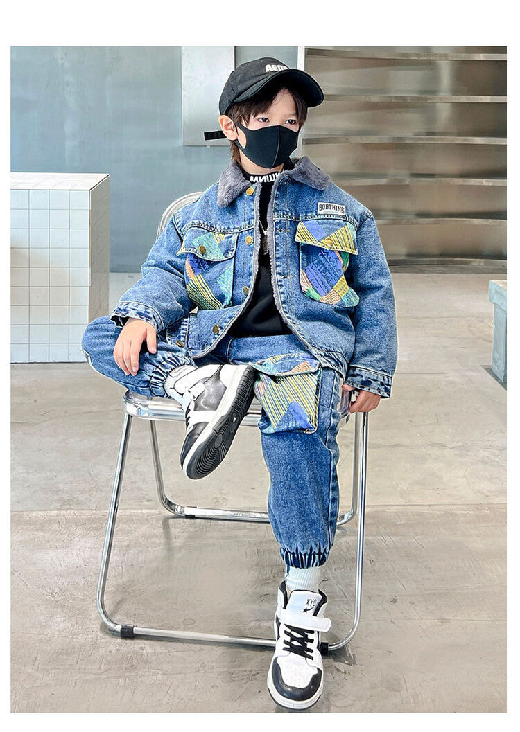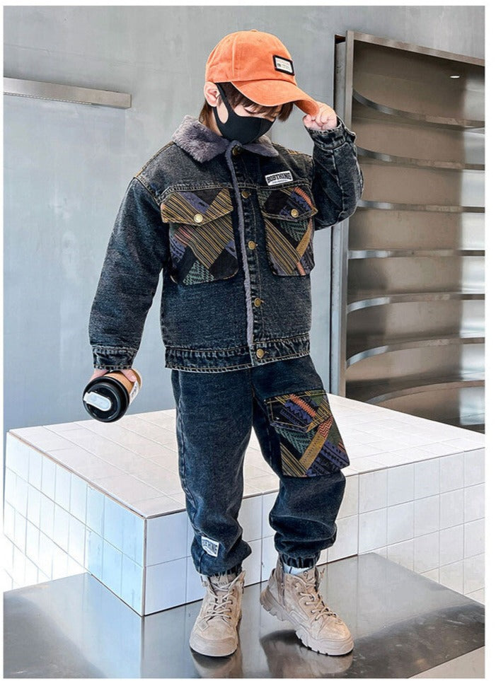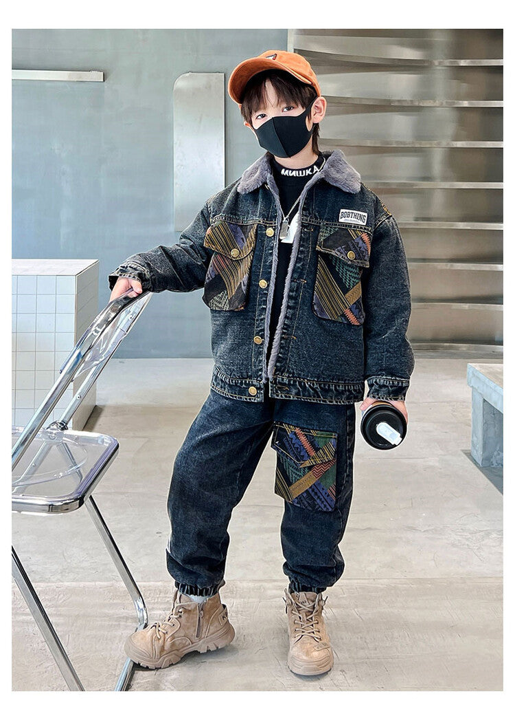 RM1231-02 طقم جينز ولادي قطعتين مبطن فرو بالكامل شتوي ( جكيت + بنطلون )
