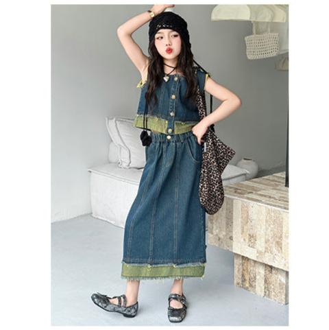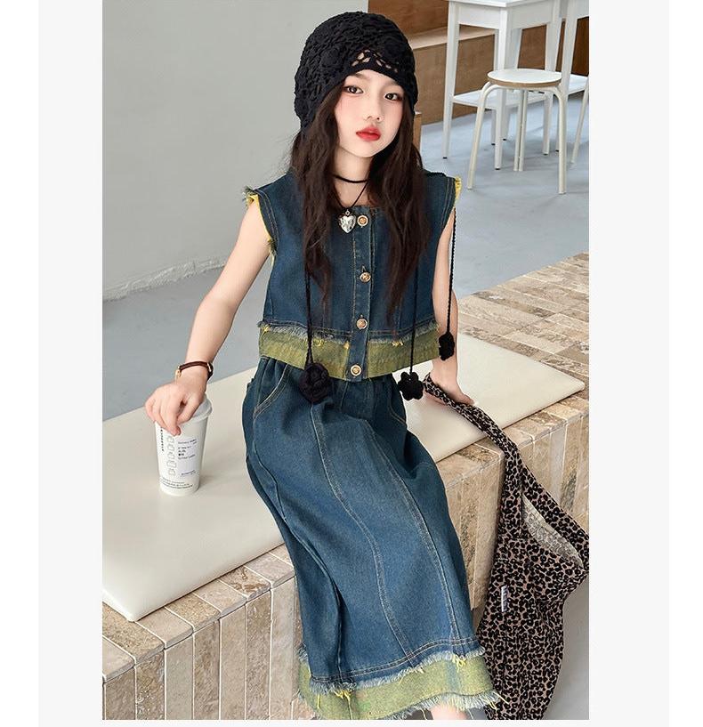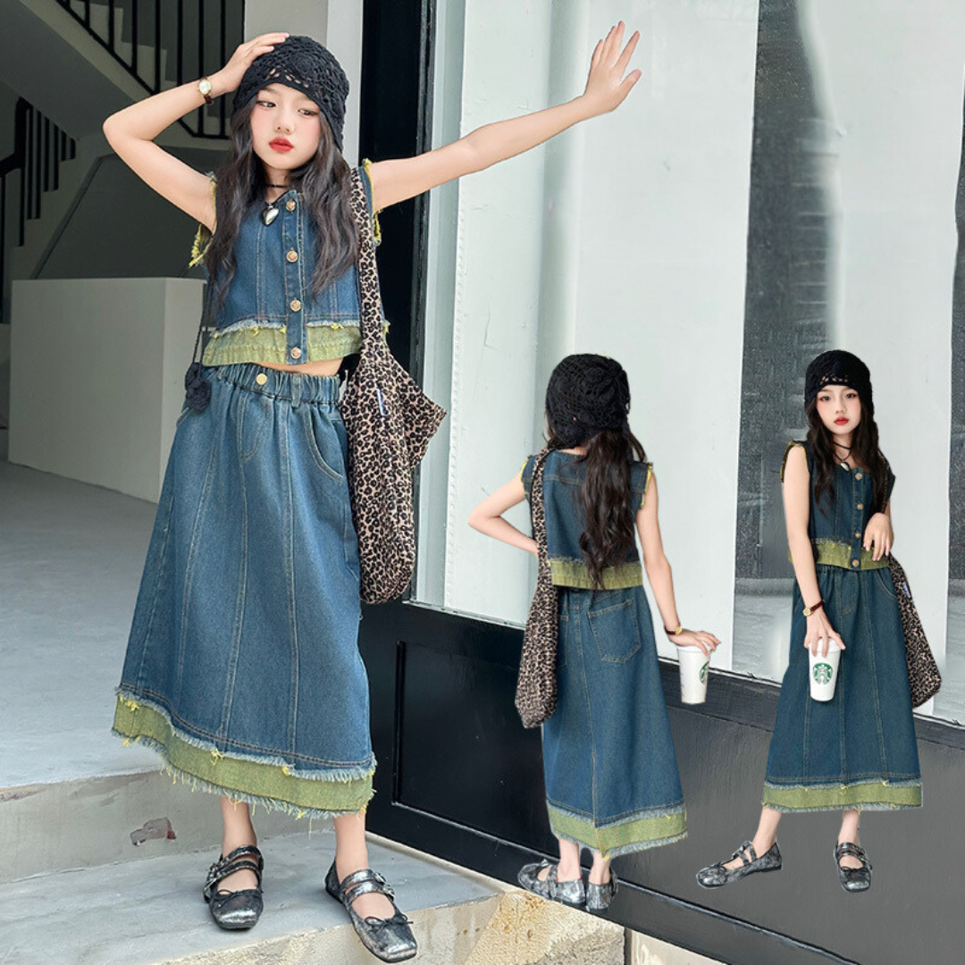 RM150424-29 طقم بناتي جينز صيفي قطعتين ( بلوزة + تنورة )