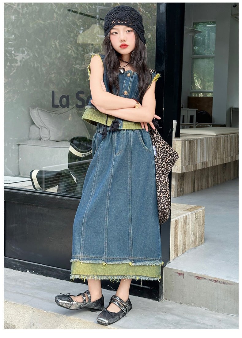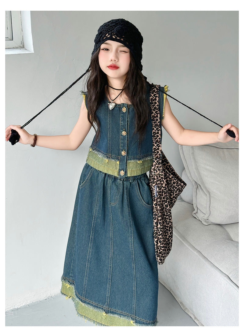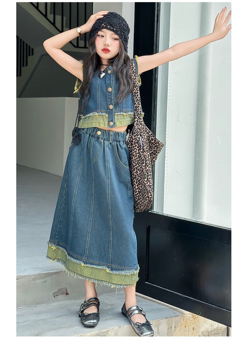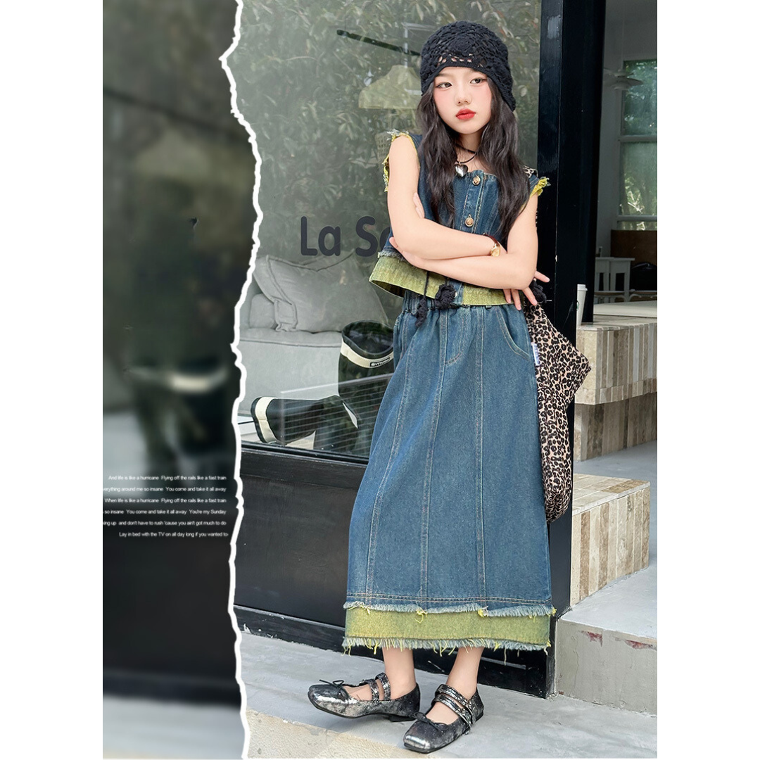 طقم بناتي جينز صيفي قطعتين ( بلوزة + تنورة )