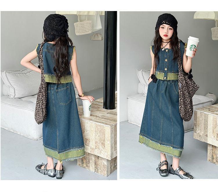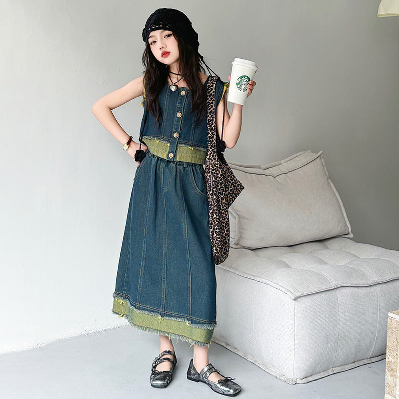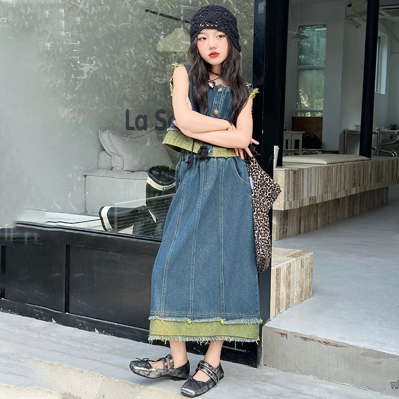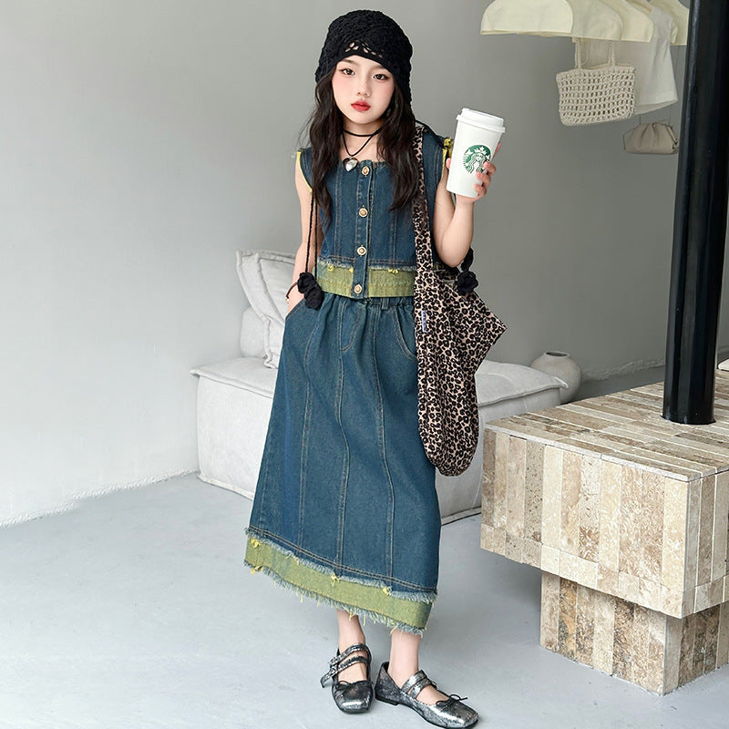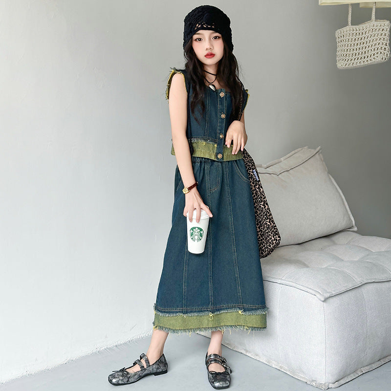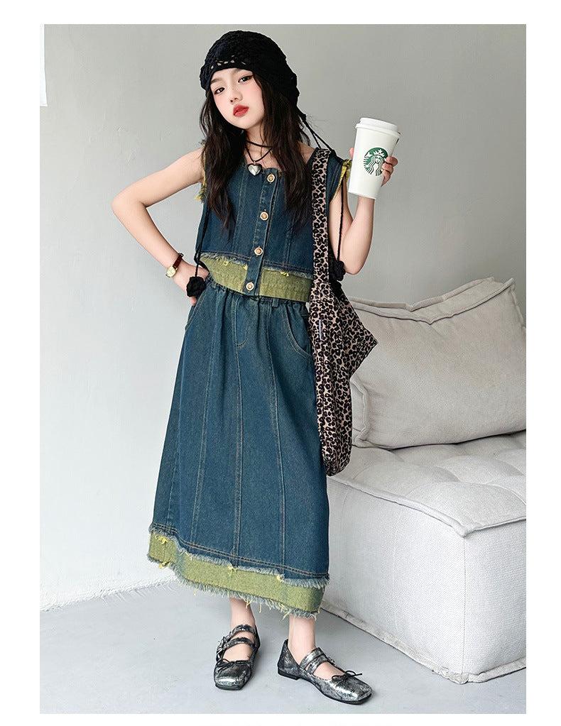 طقم بناتي جينز صيفي قطعتين ( بلوزة + تنورة )