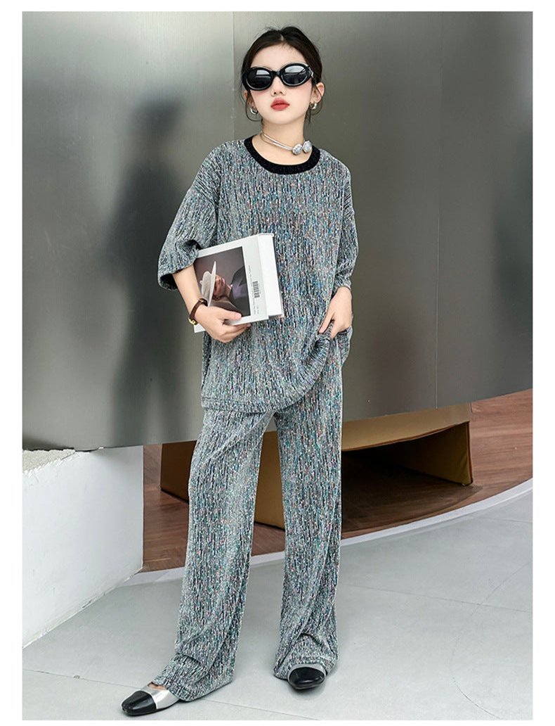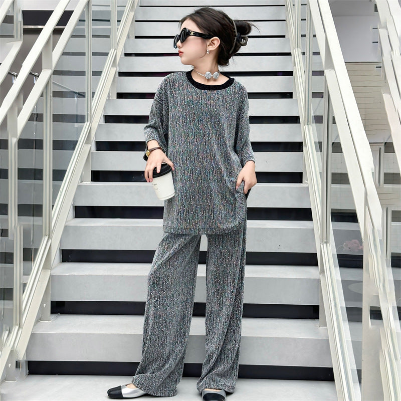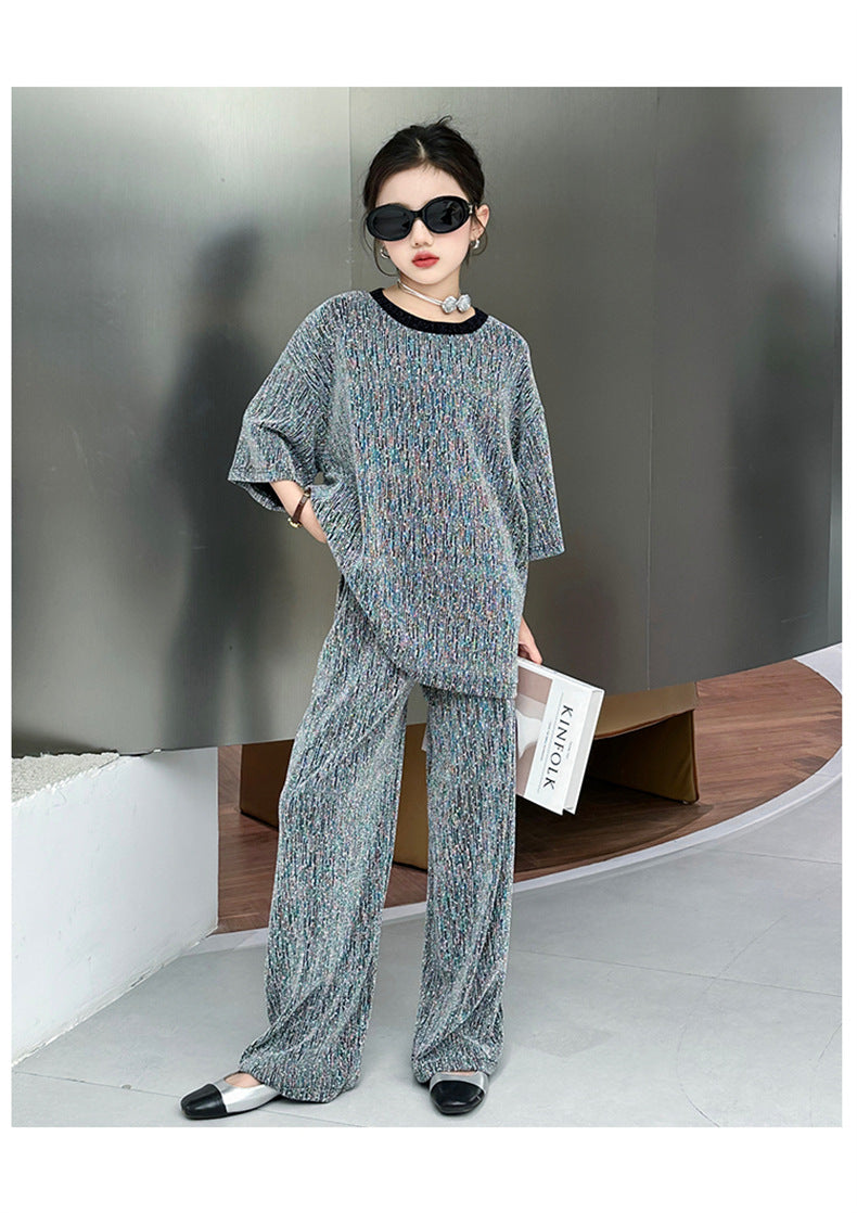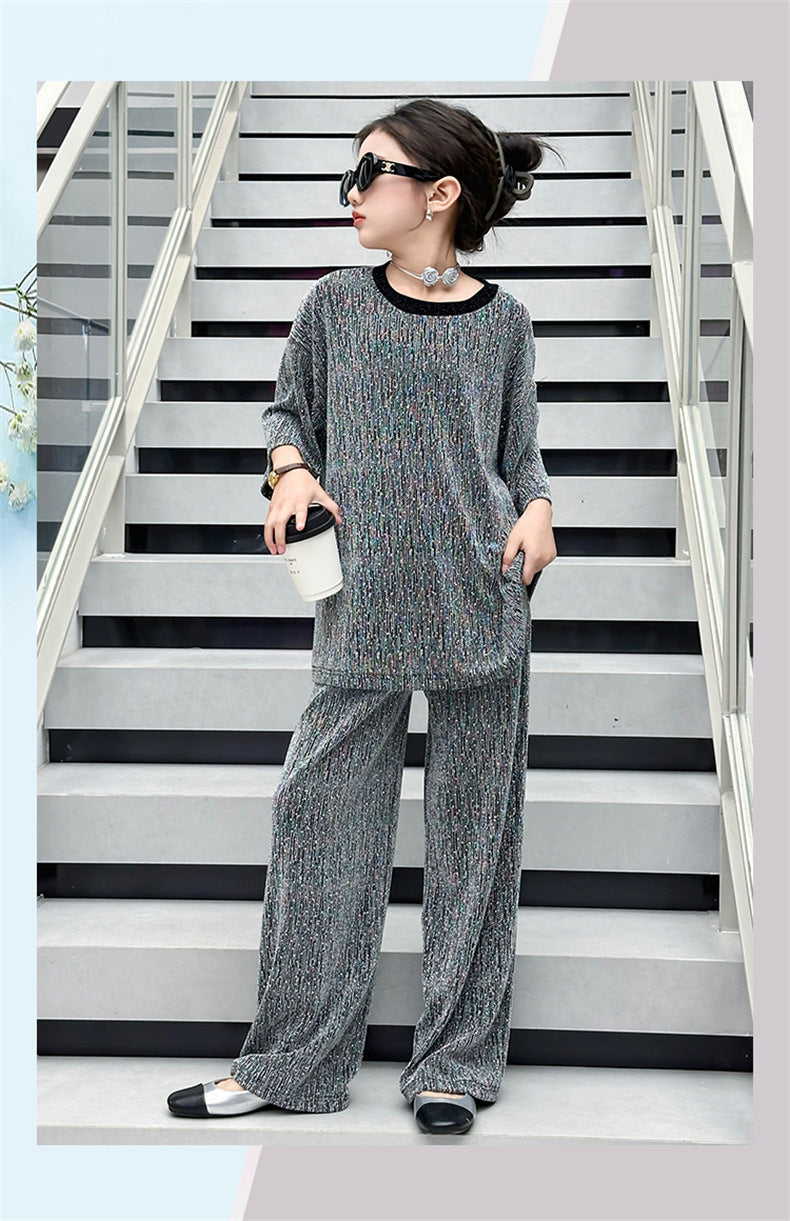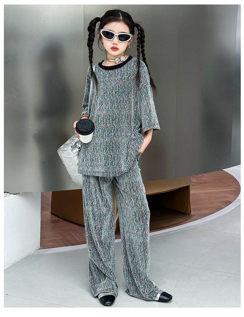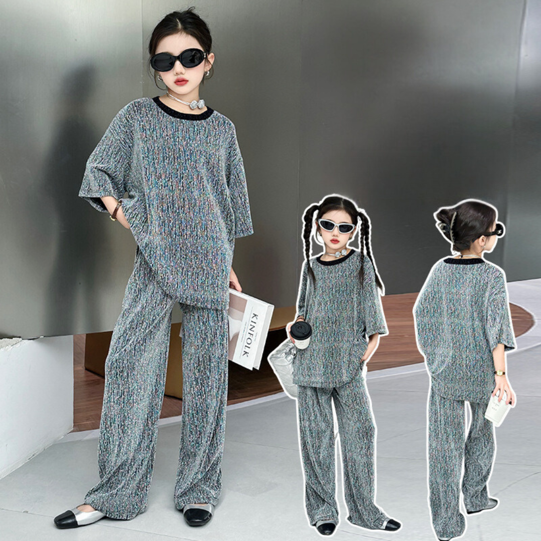طقم بناتي بلمع مزين بالبرق قطعتين ( بلوزة + بنطلون)