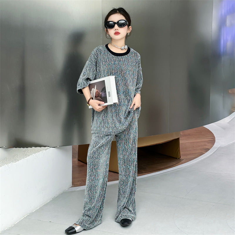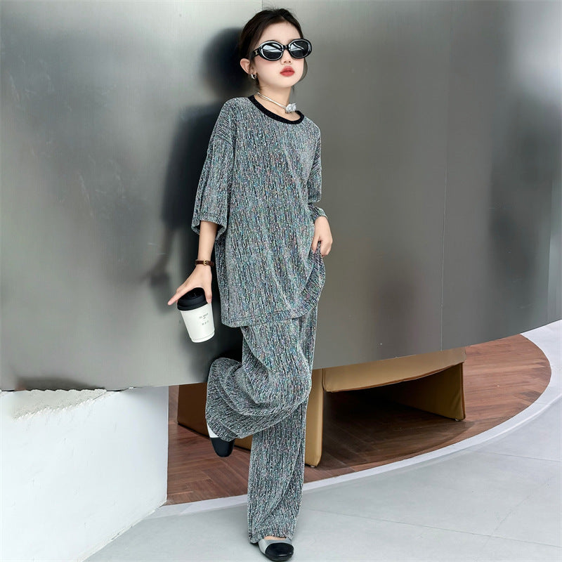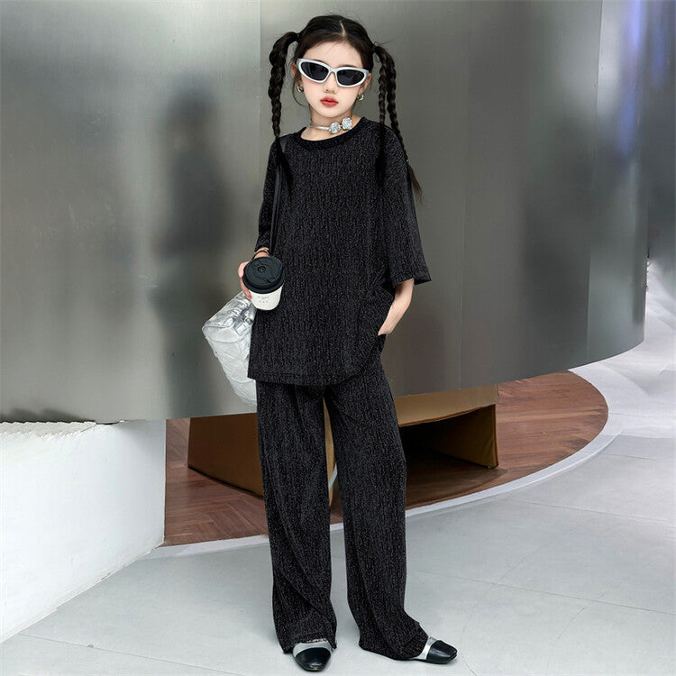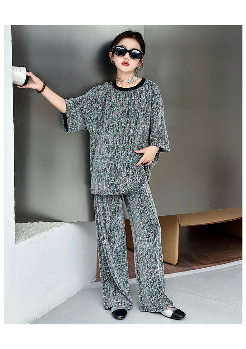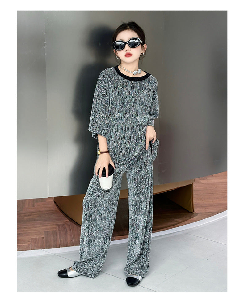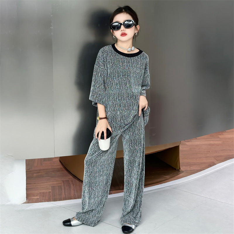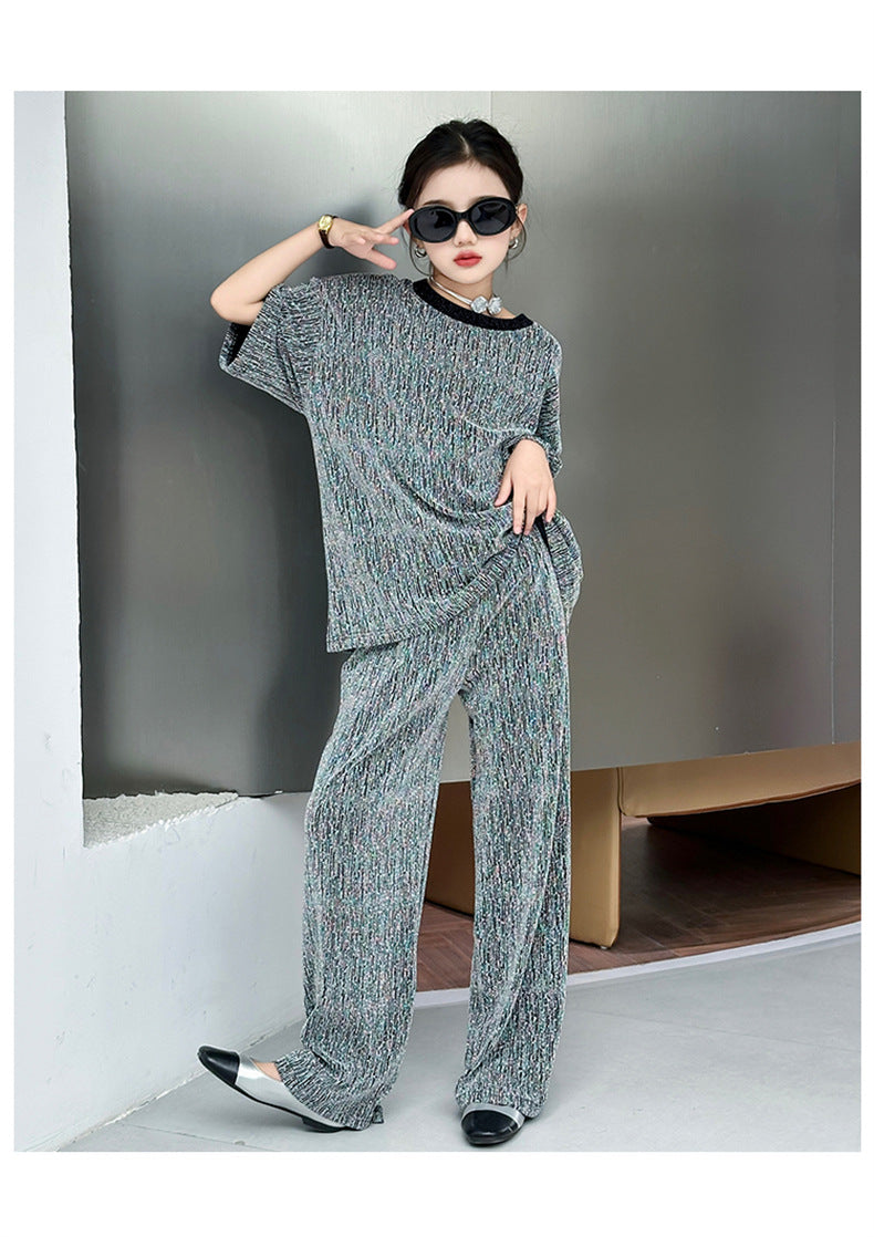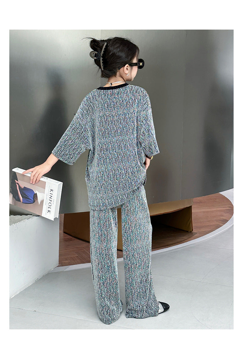 طقم بناتي بلمع مزين بالبرق قطعتين ( بلوزة + بنطلون)
