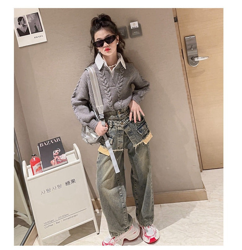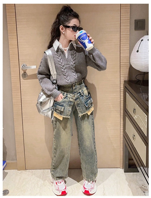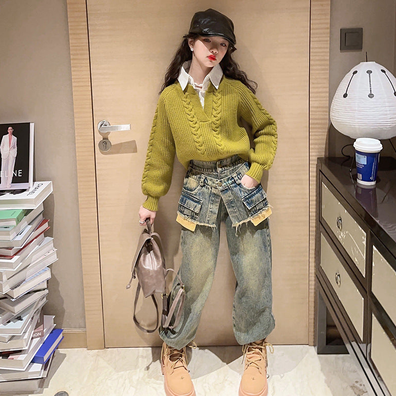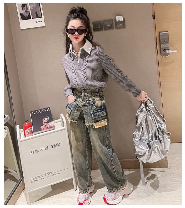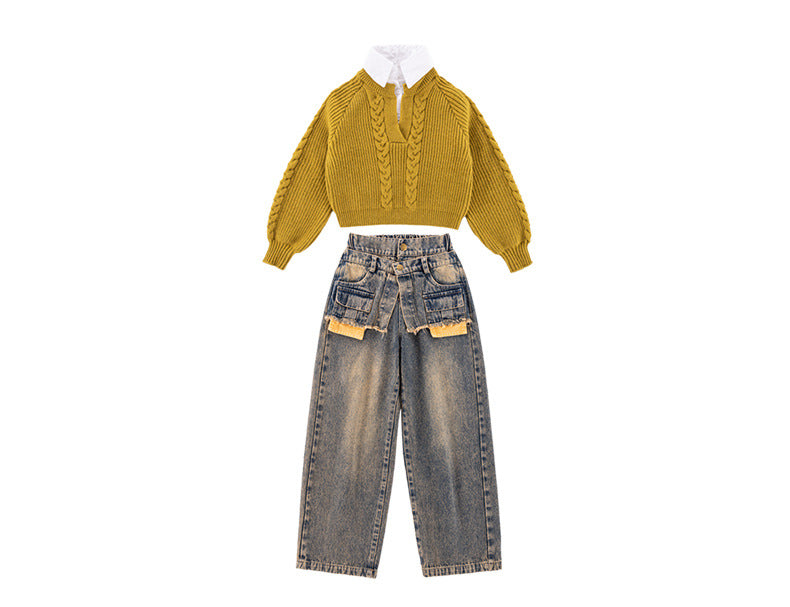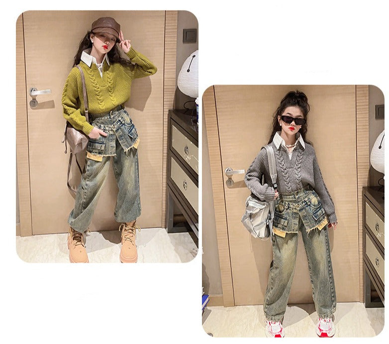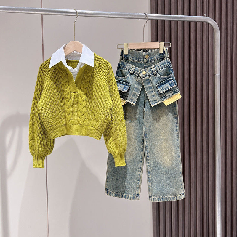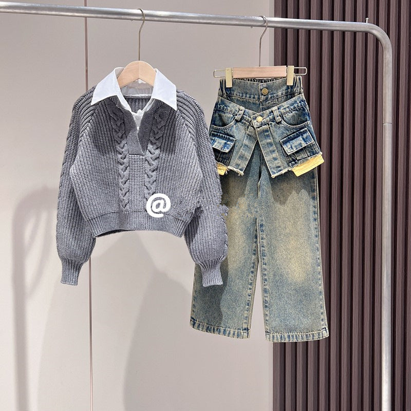 طقم بناتي خريفي/ شتوي قطعتين ( بلوزة صوف + بنطلون جينز )