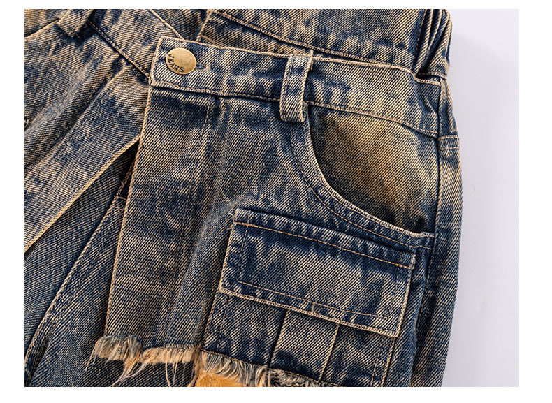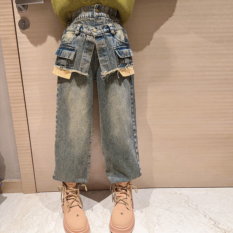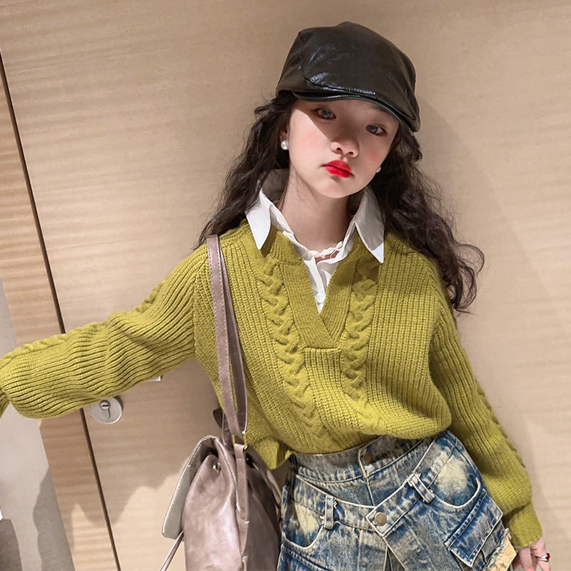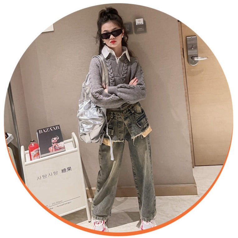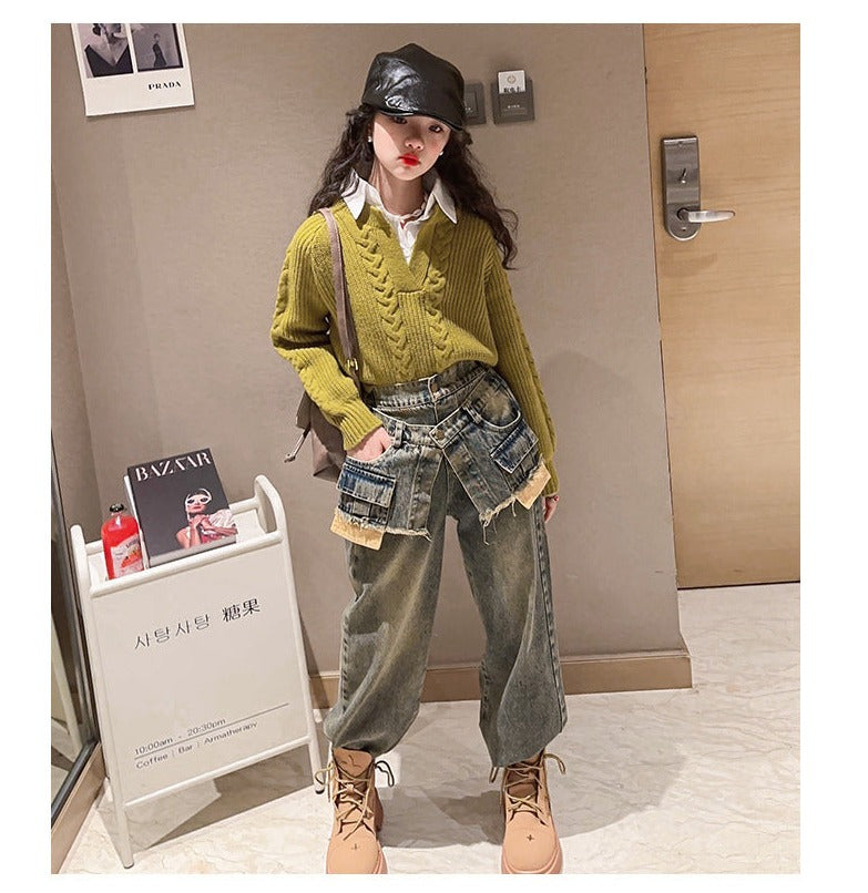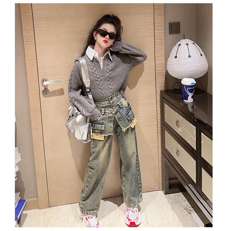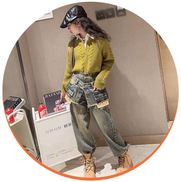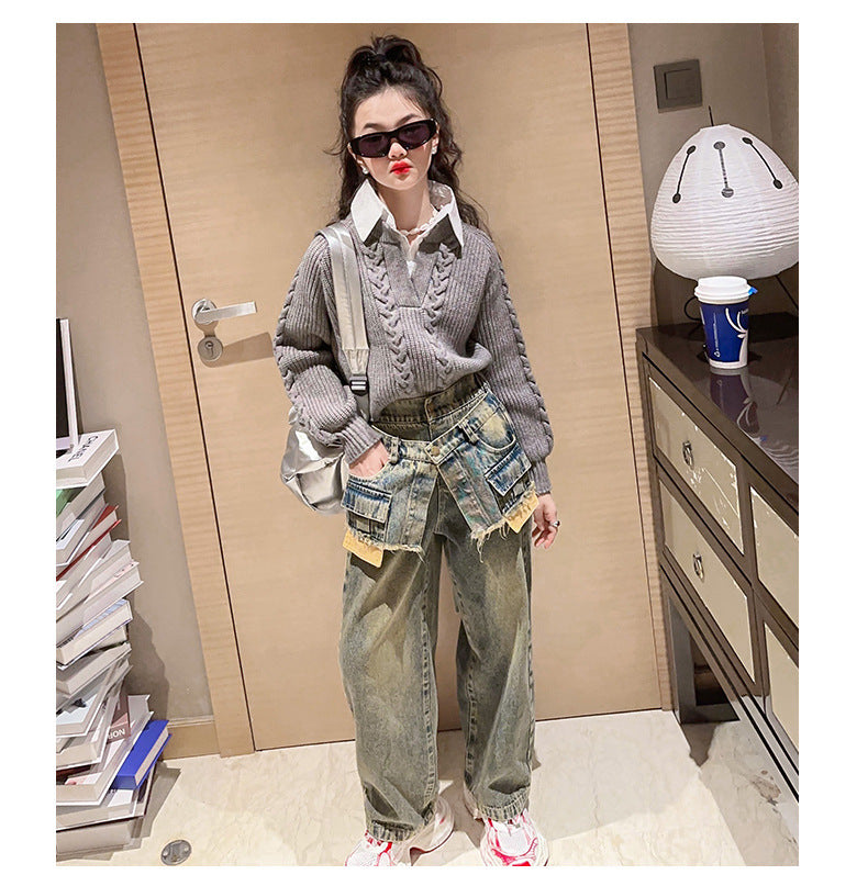 طقم بناتي خريفي/ شتوي قطعتين ( بلوزة صوف + بنطلون جينز )