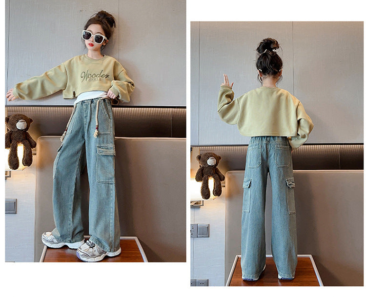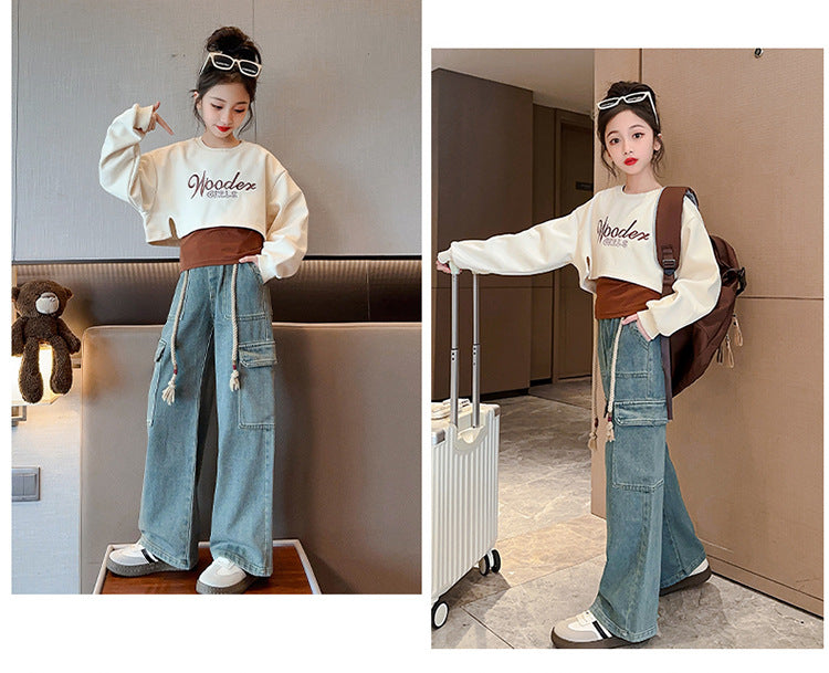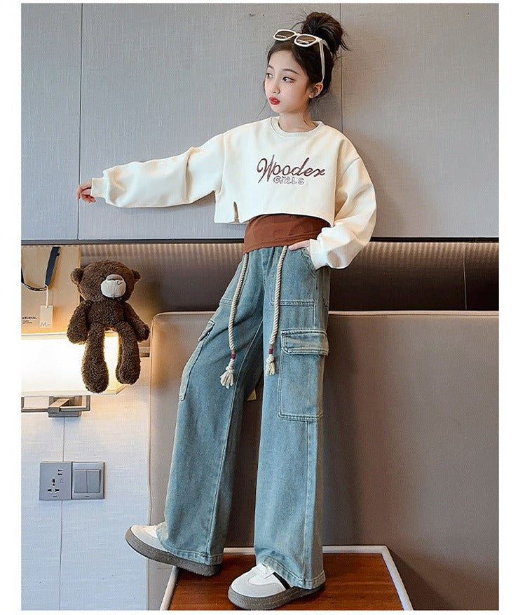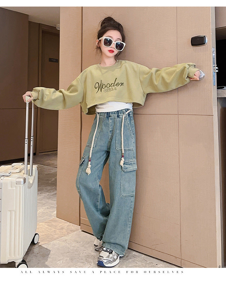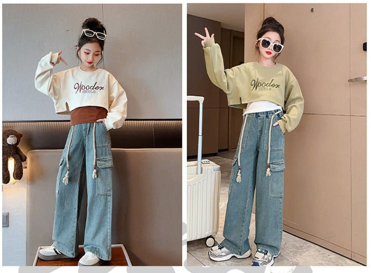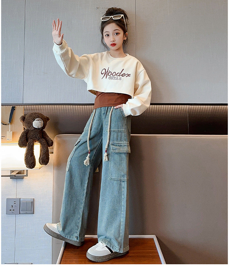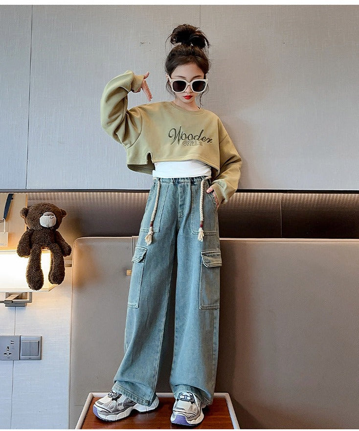طقم بناتي 3 قطع ( بلوزة + بدي + بنطلون جينز )