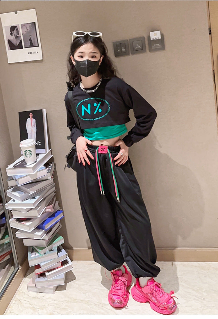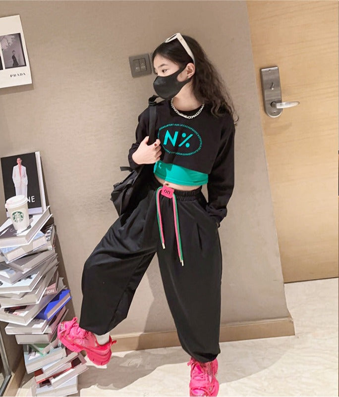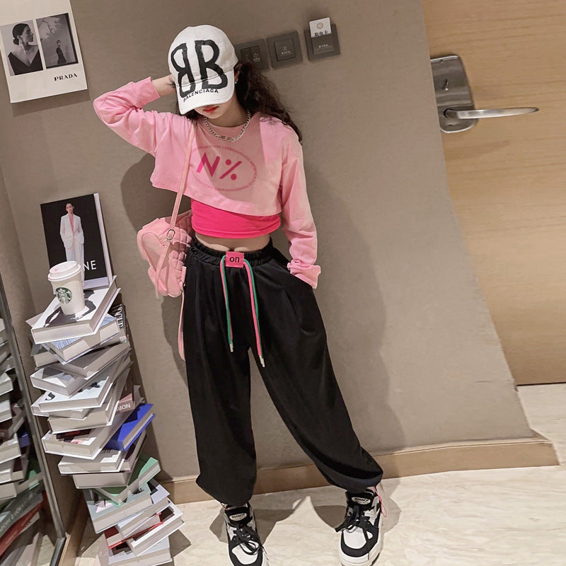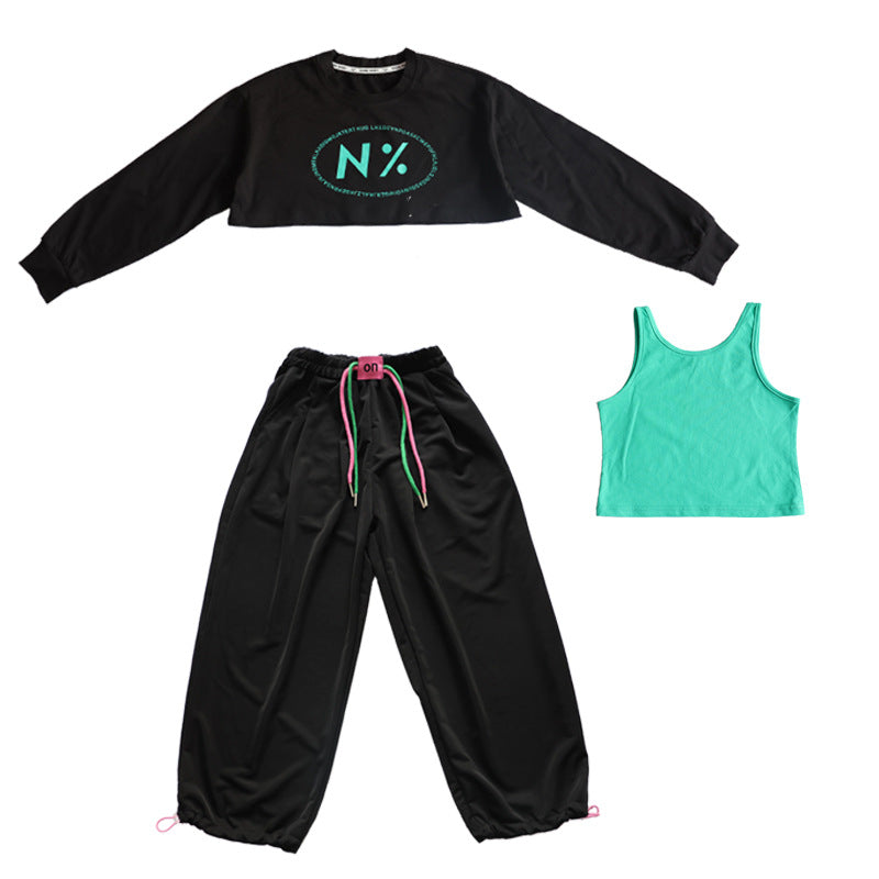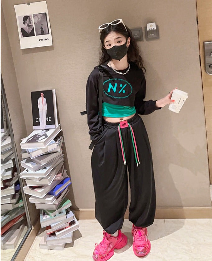 طقم قطني بناتي 3 قطع ( بلوزة قصيرة + بدي ملون + بنطلون)
