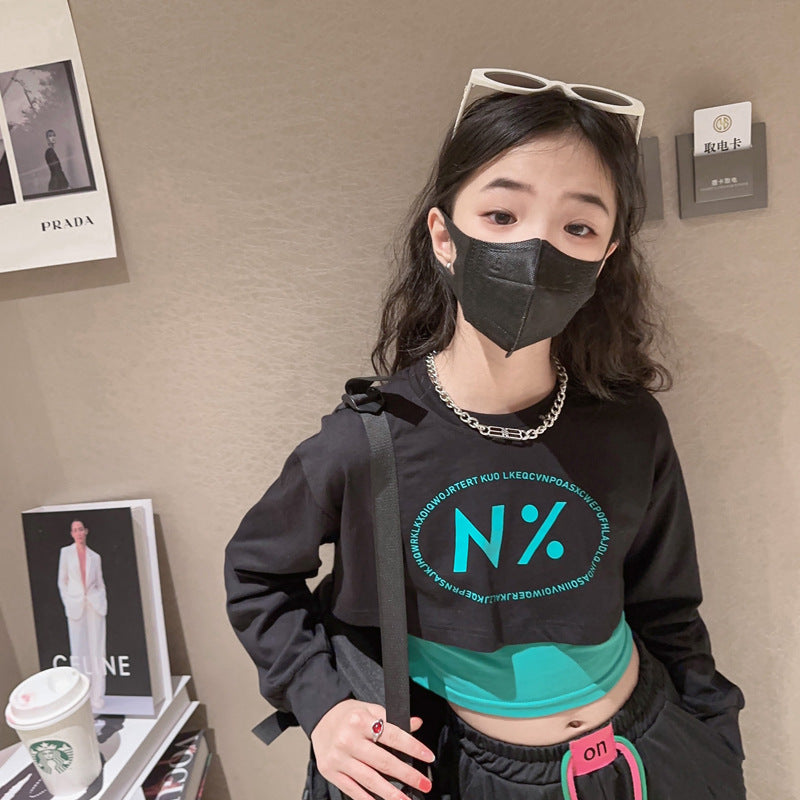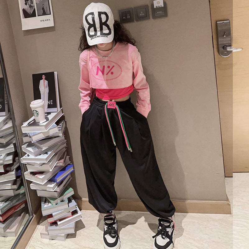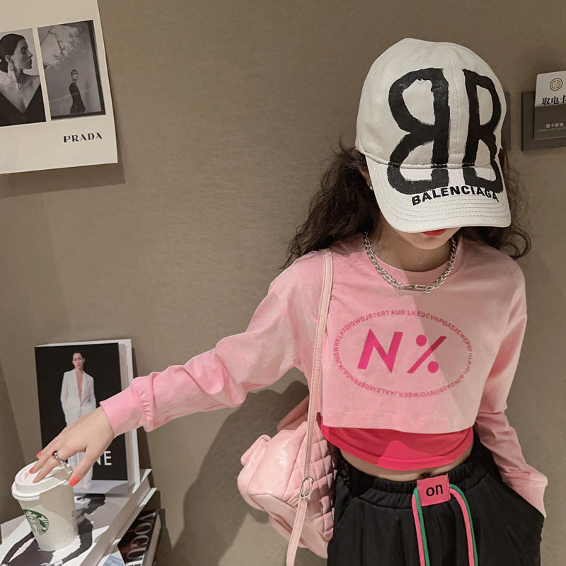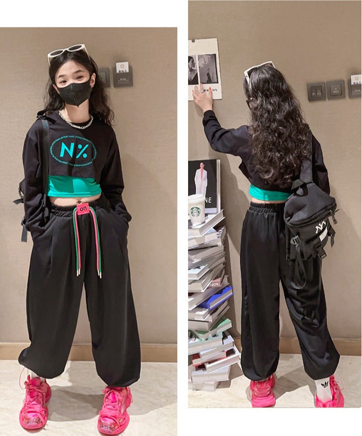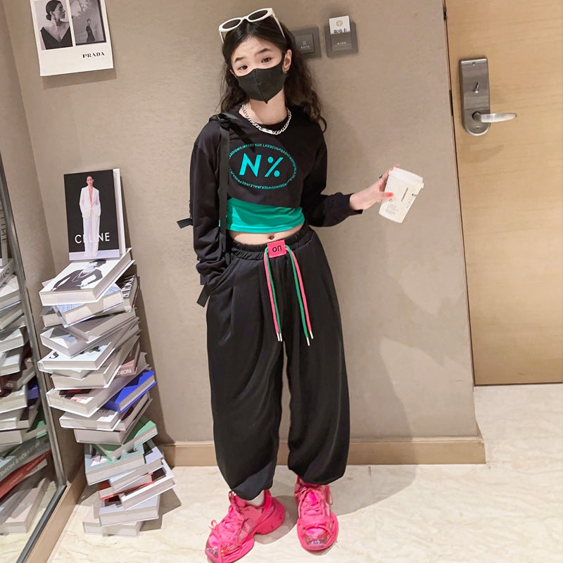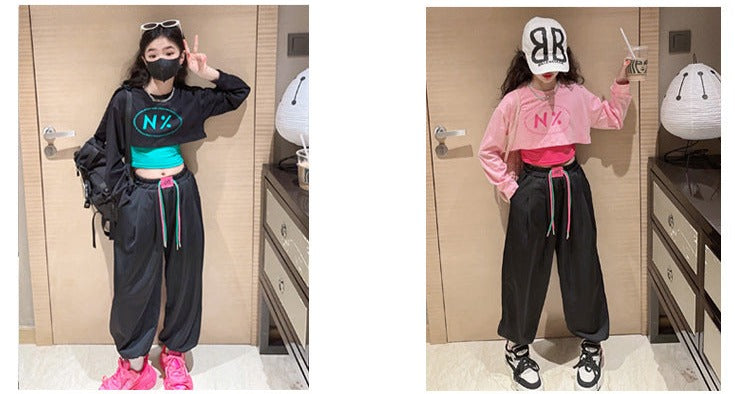 طقم قطني بناتي 3 قطع ( بلوزة قصيرة + بدي ملون + بنطلون)