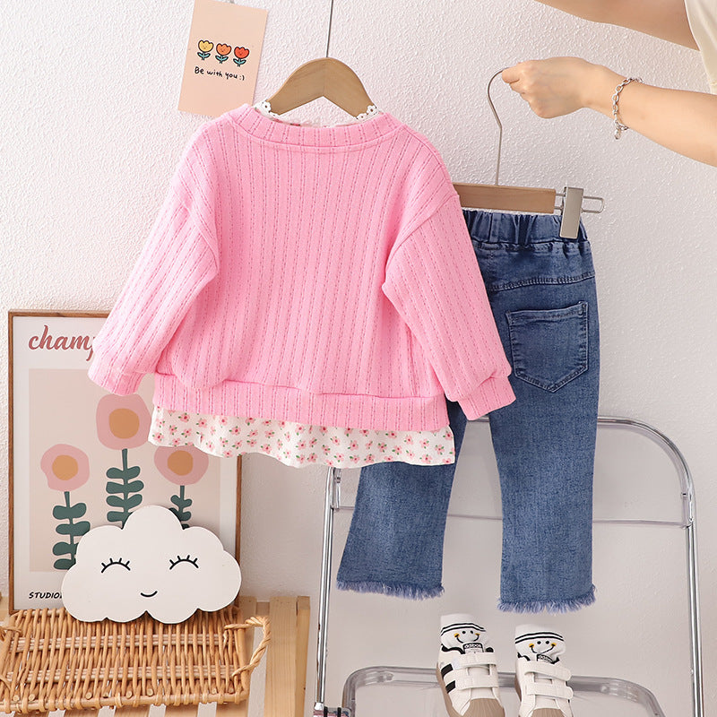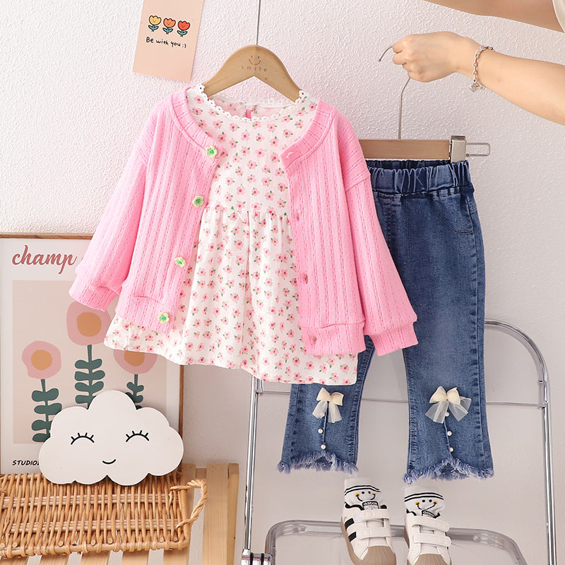 طقم بناتي 3 قطع ( بلوزة + جكيت + بنطلون جينز)