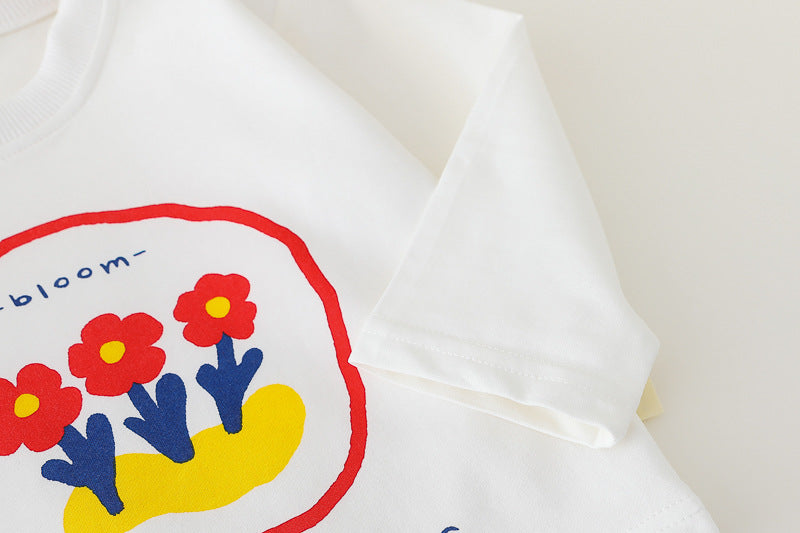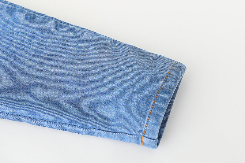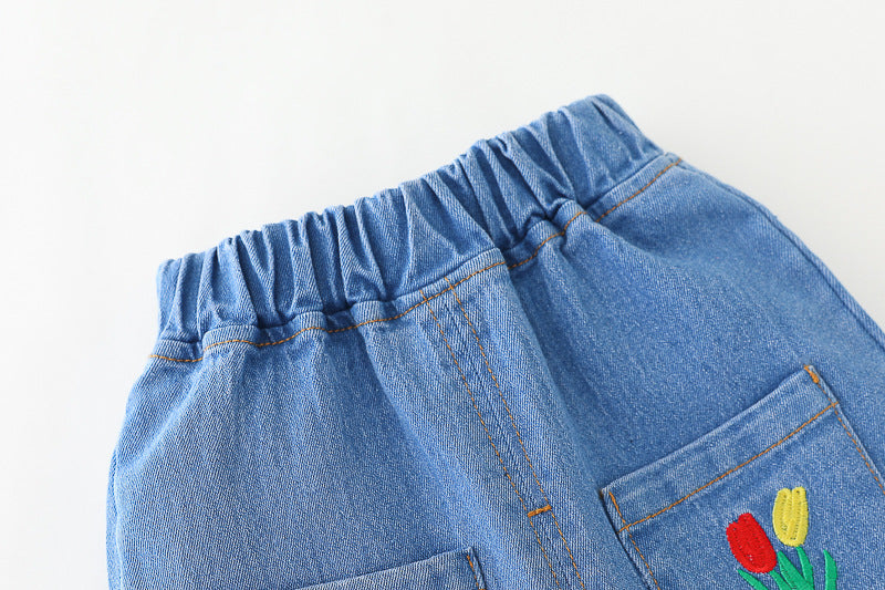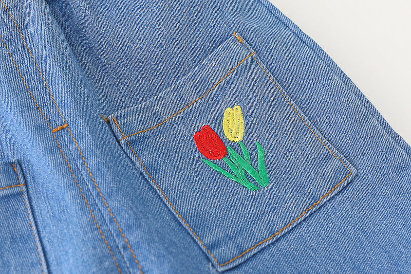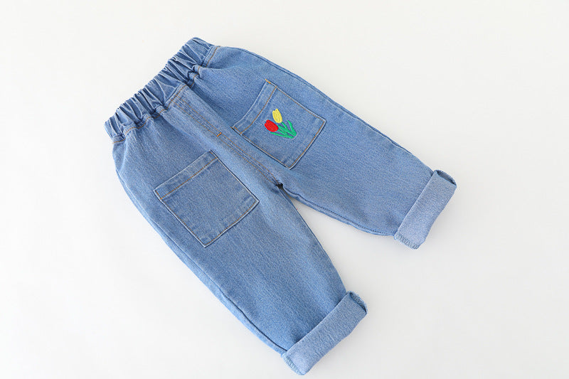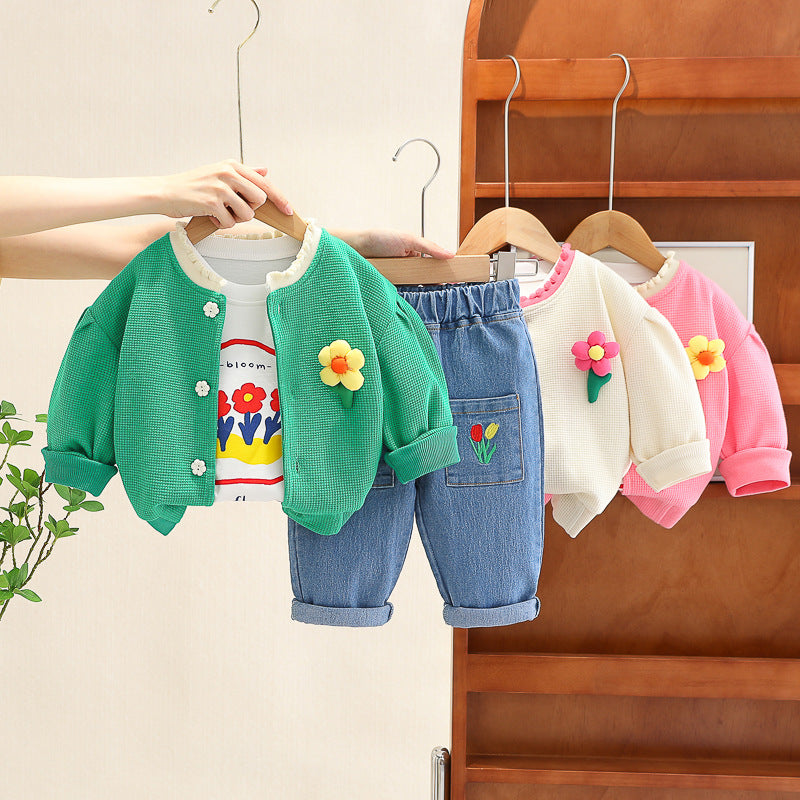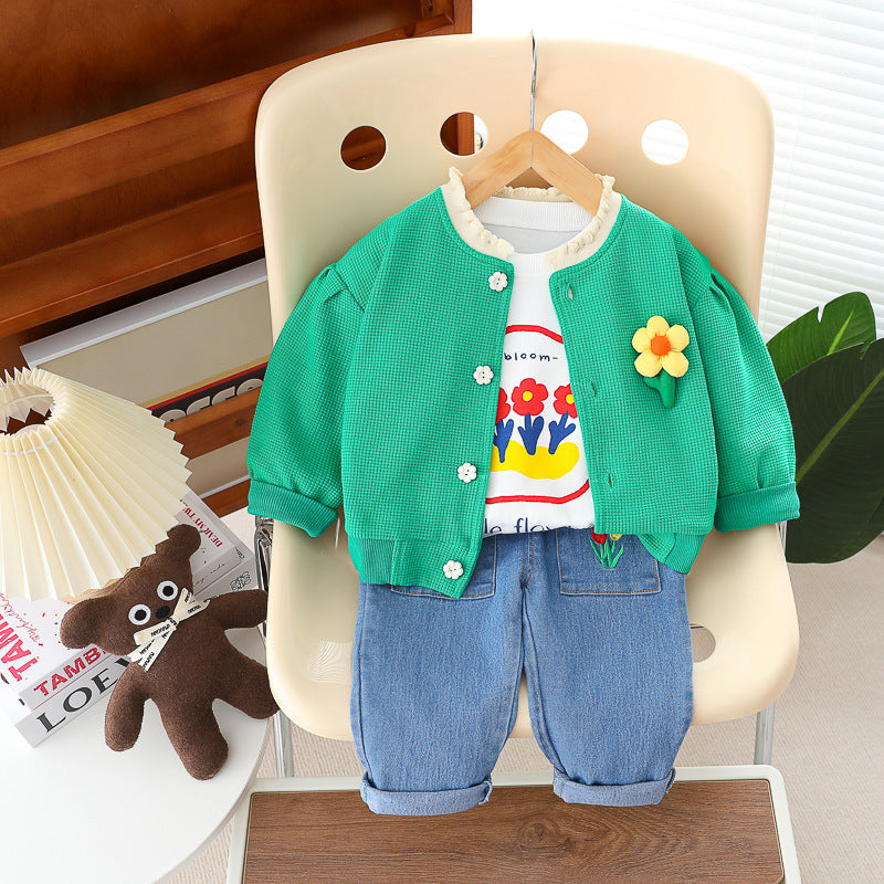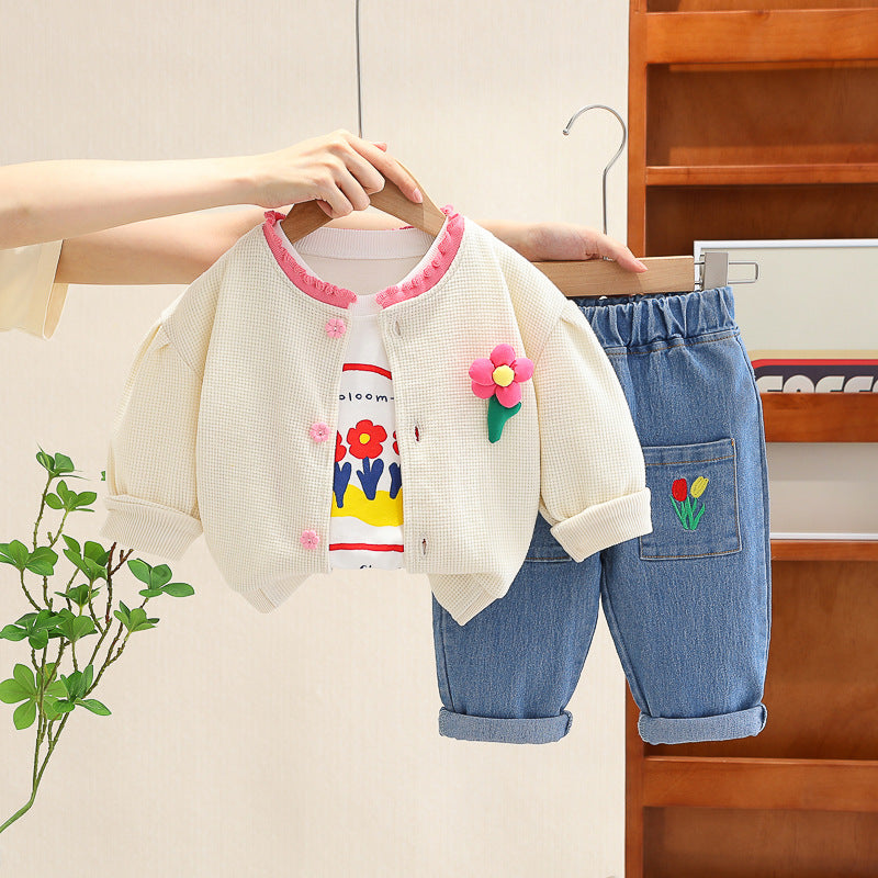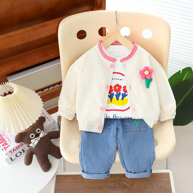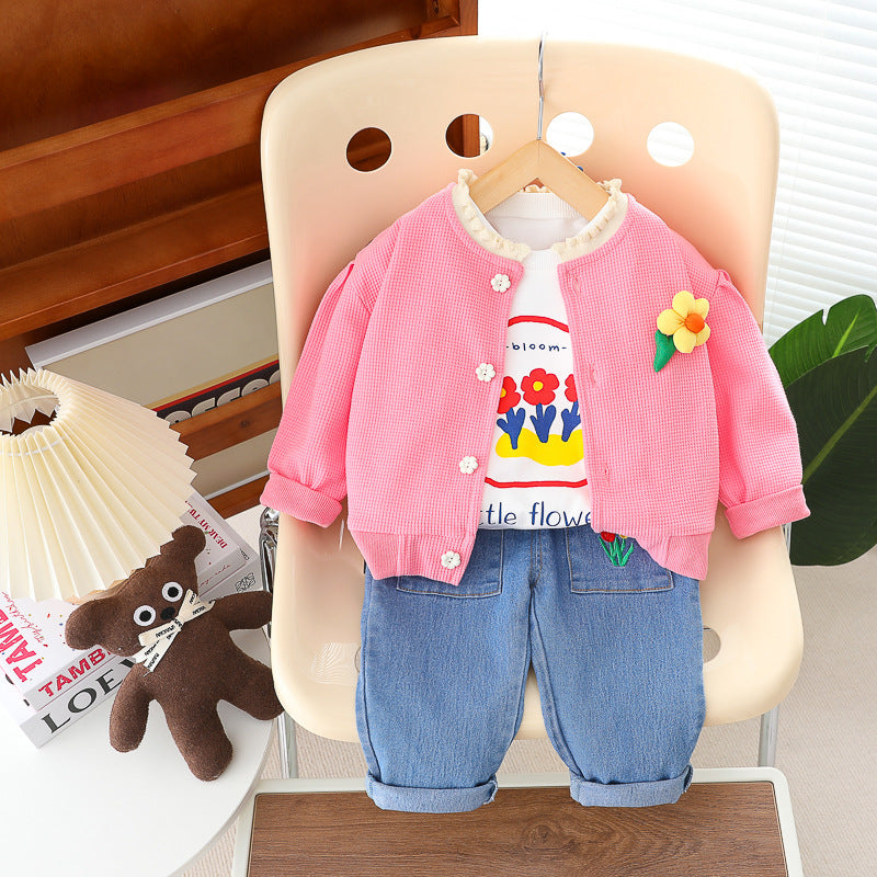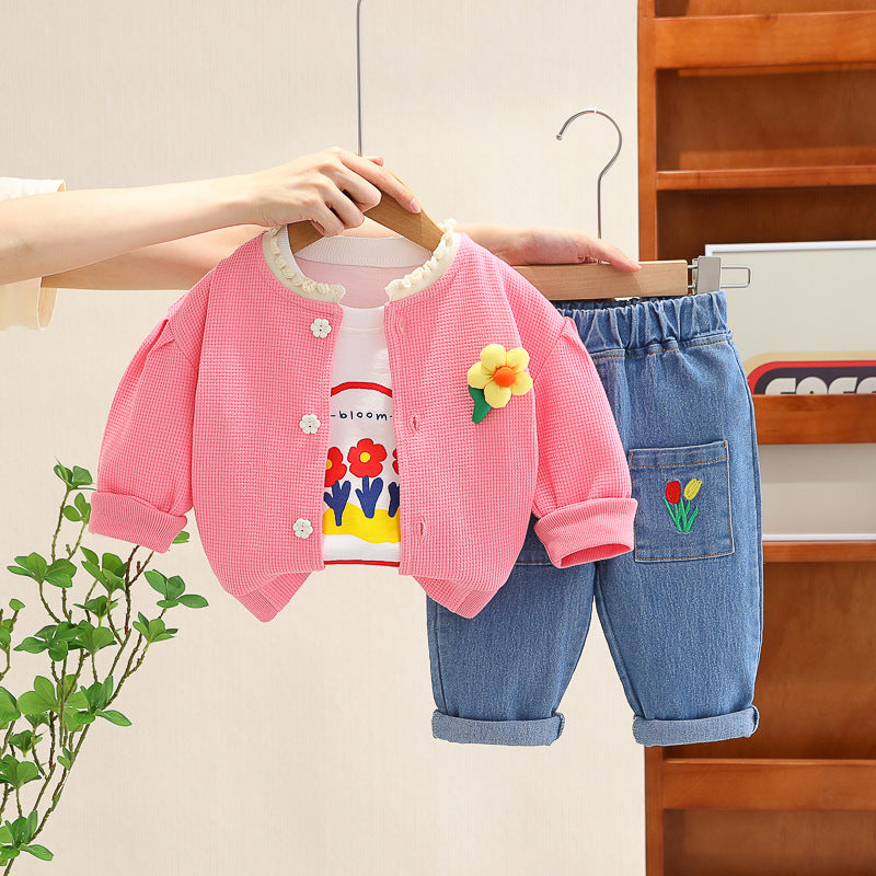 طقم بناتي 3 قطع ( بلوزة موردة + جكيت مع دبوس وردة + بنطلون جينز )