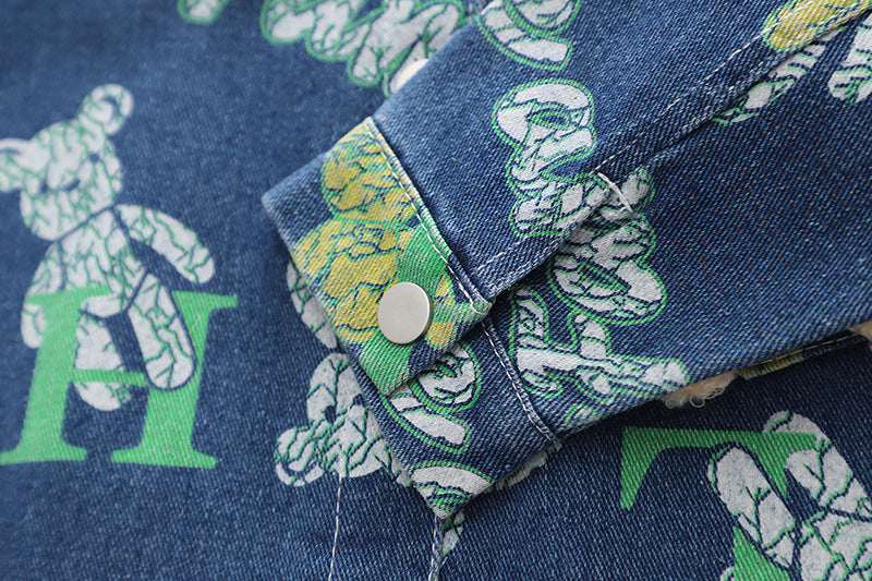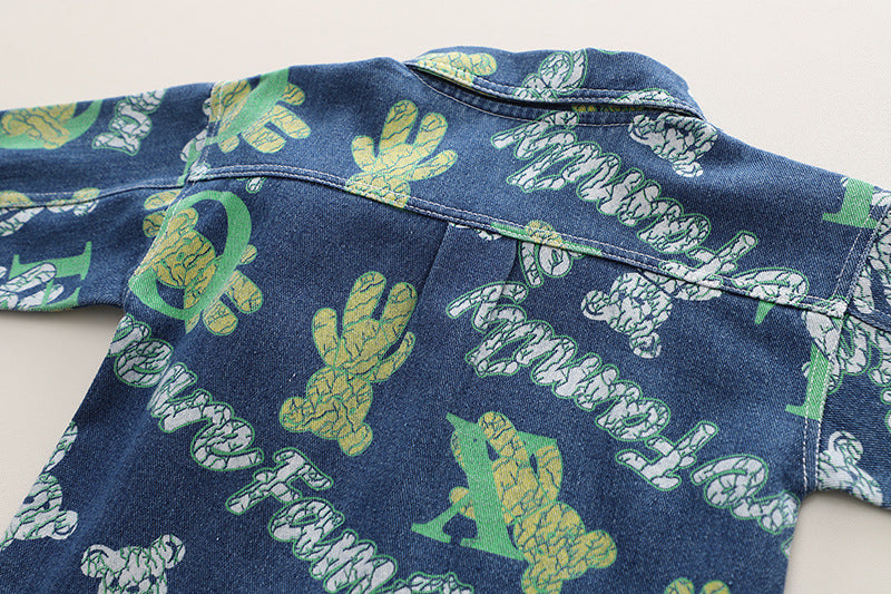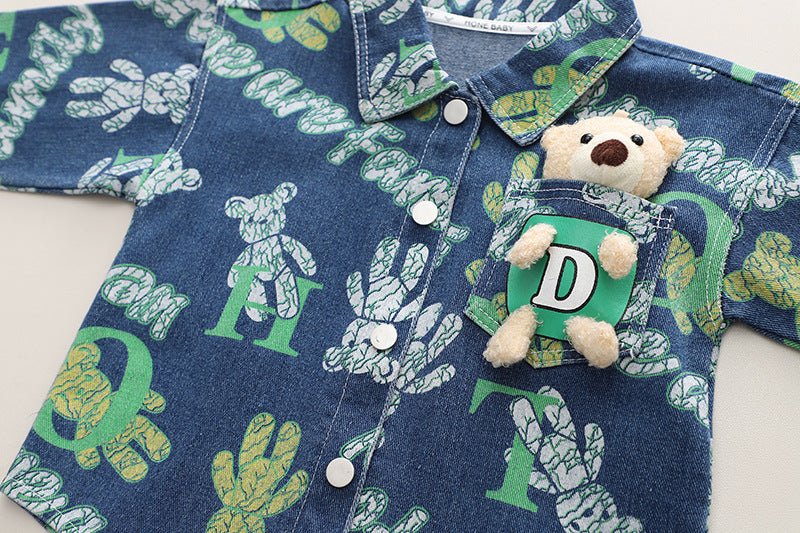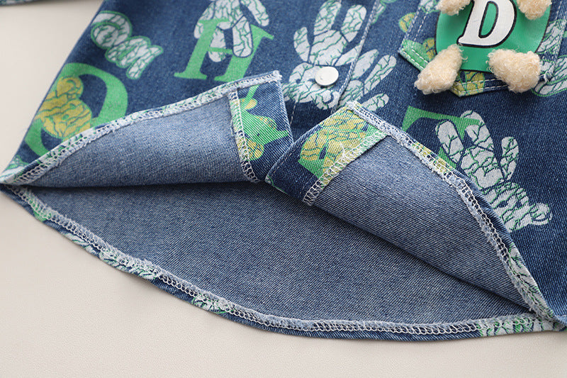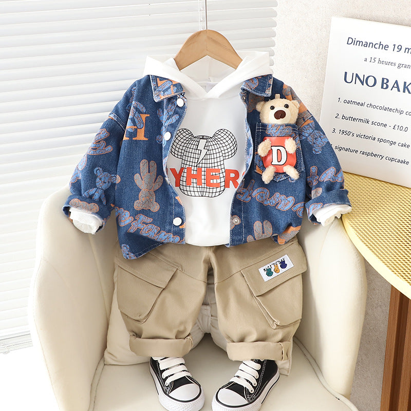 طقم ولادي 3 قطع ( بلوزة قطعني + جكيت جينز مع دبدوب + بنطلون كتان)