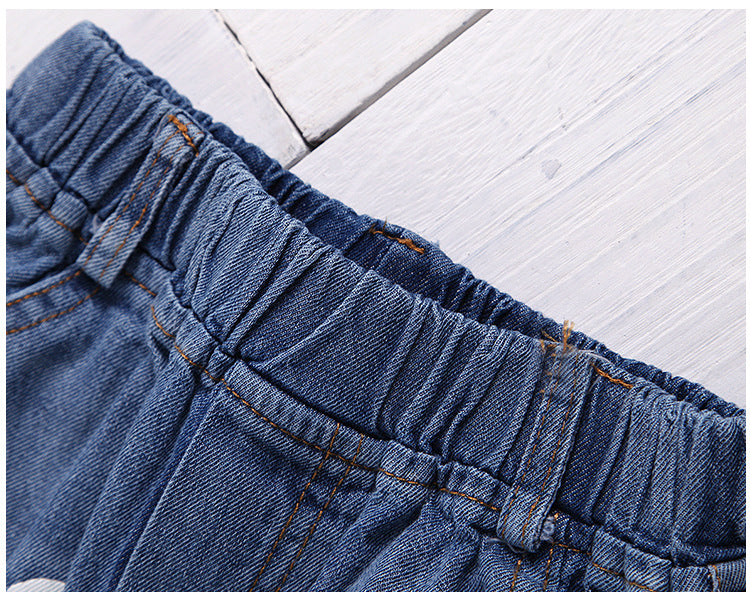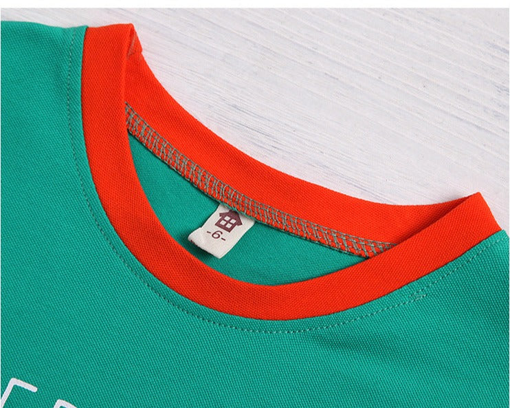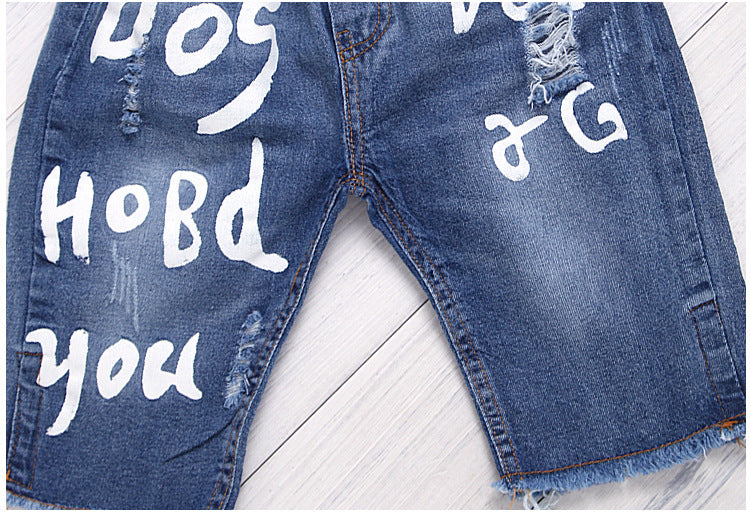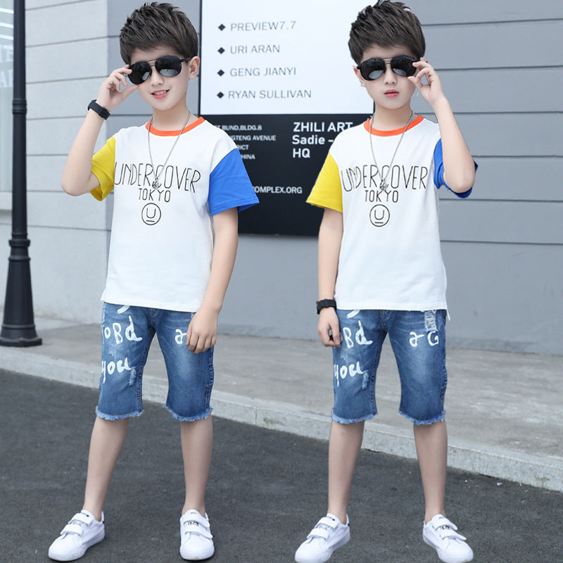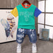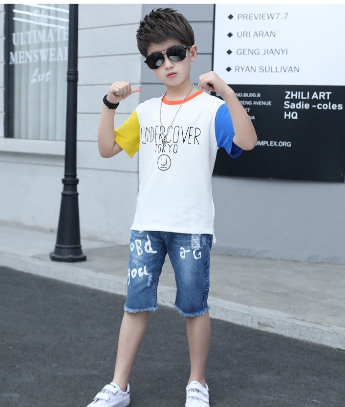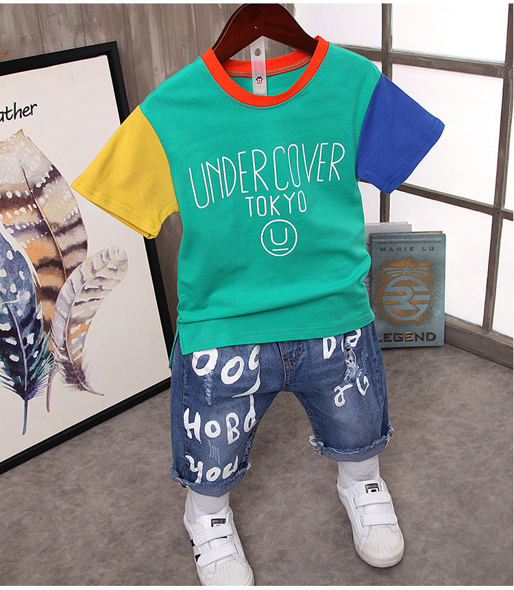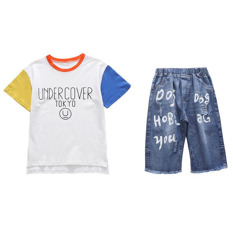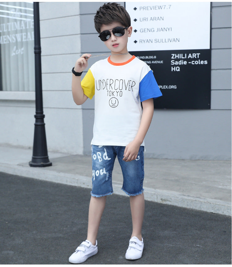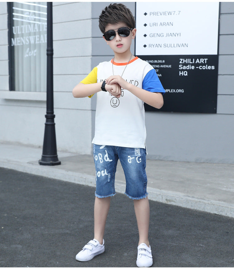 SS-2353B  طقم ولادي جينز بجي قطعتين ( بلوزة قطنية + شورت جينز طويل)