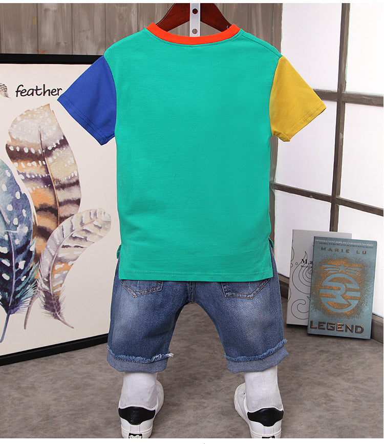 طقم ولادي جينز بجي قطعتين ( بلوزة قطنية + شورت جينز طويل)
