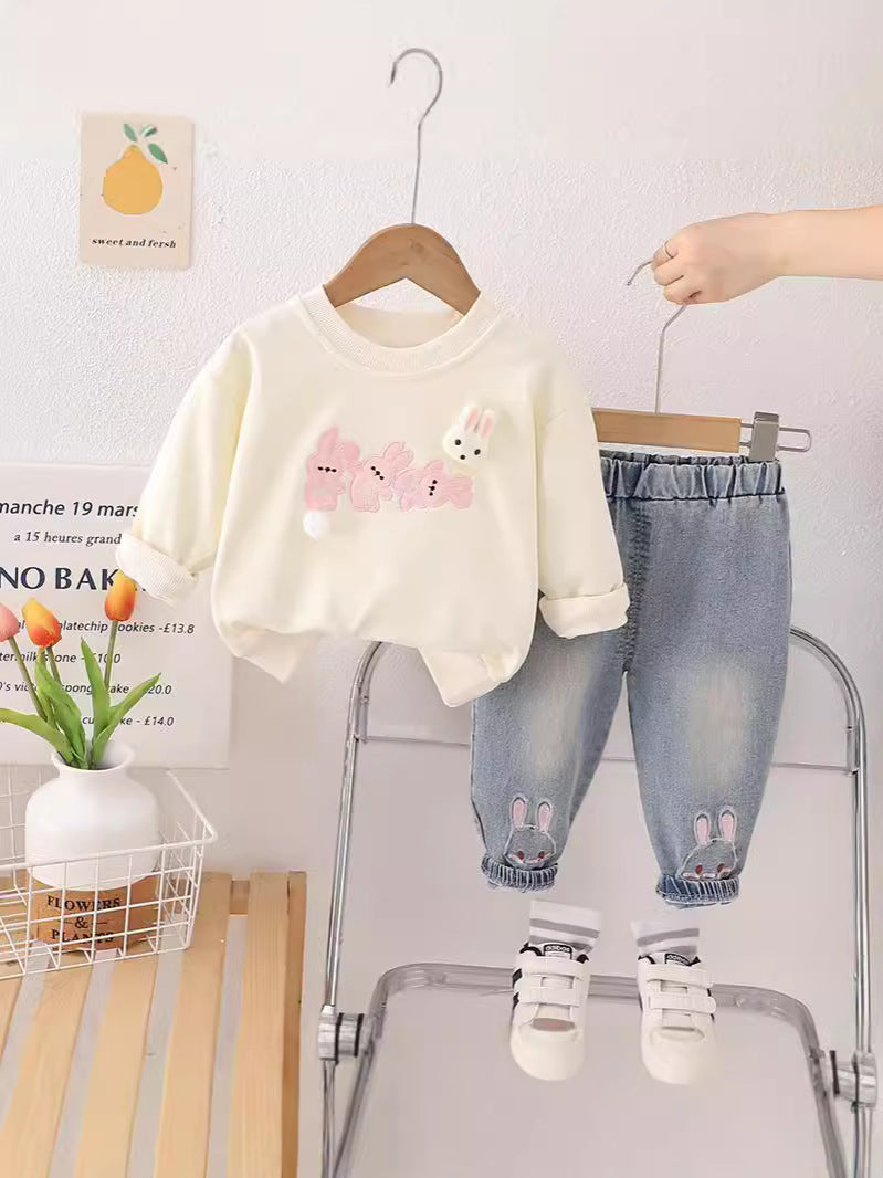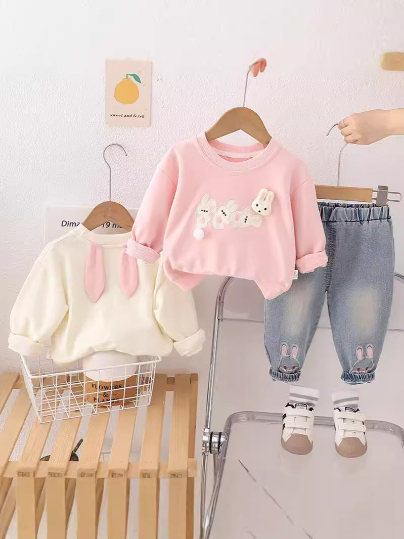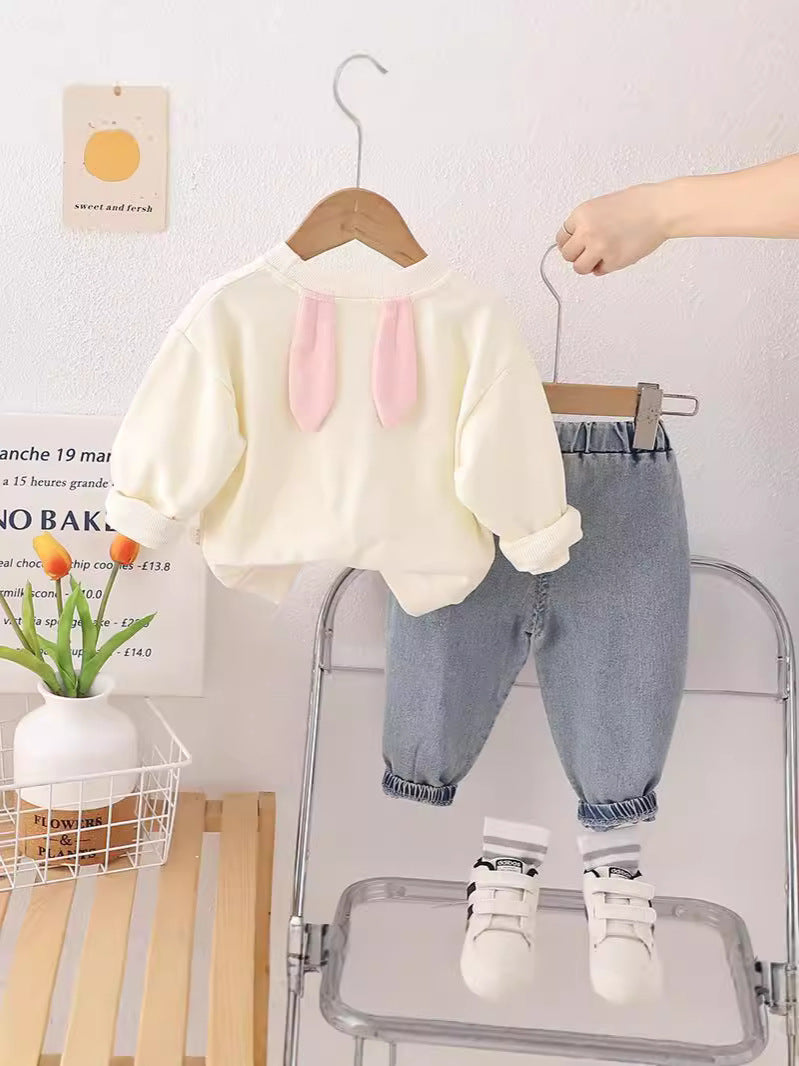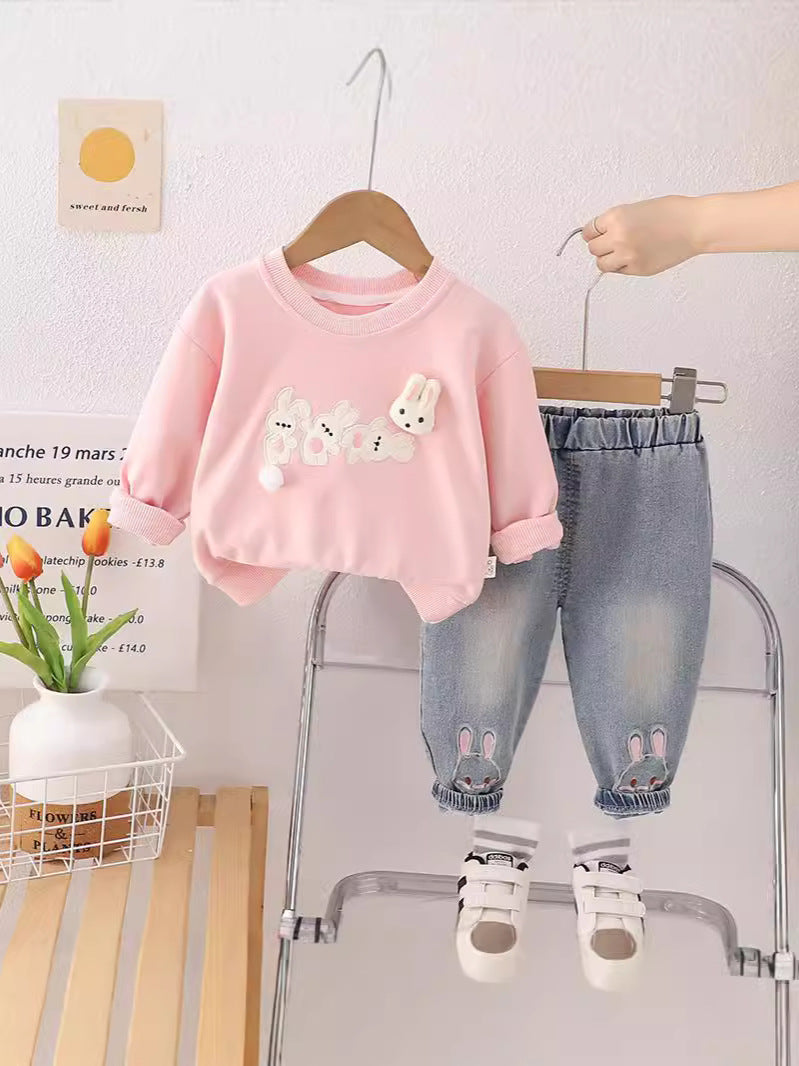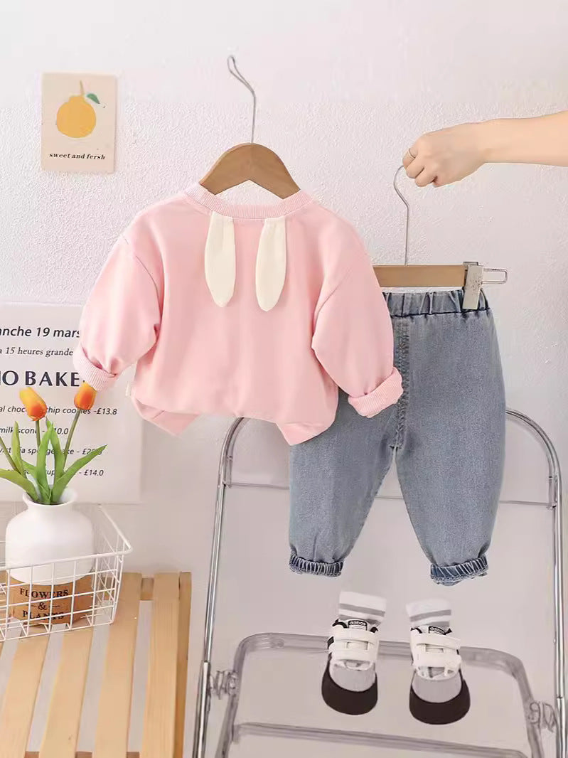 SSN040924-49 طقم بناتي ربيعي خريفي قطعتين ( بلوزة قطن دافي+ بنطلون جينز )