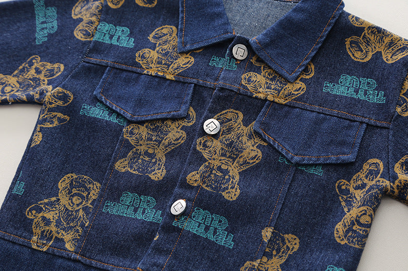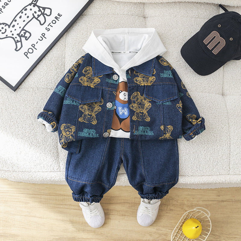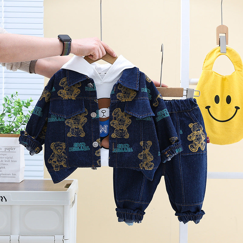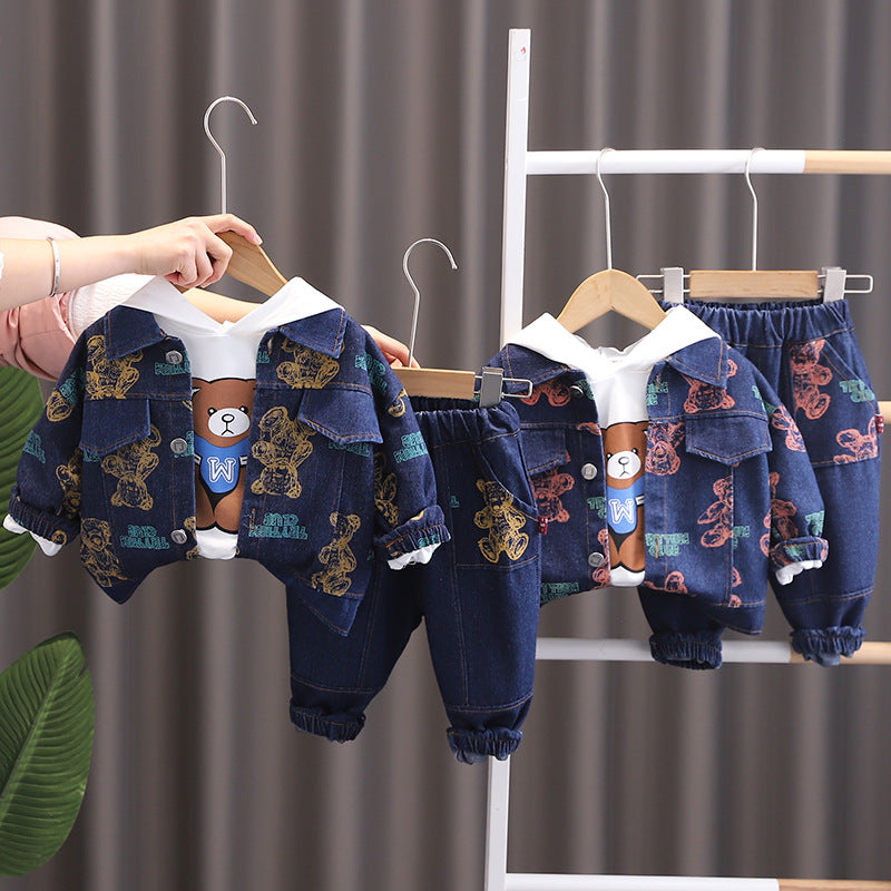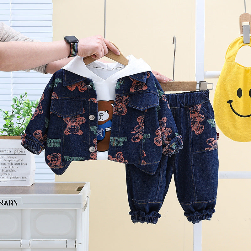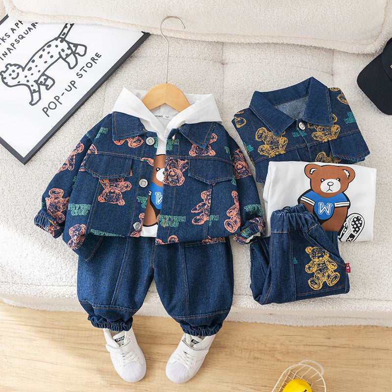 SSN040924-4 طقم جينز ولادي خريفي ربيعي 3 قطع ( بلوزة قطن + جكيت جينز + بنطلون جينز )