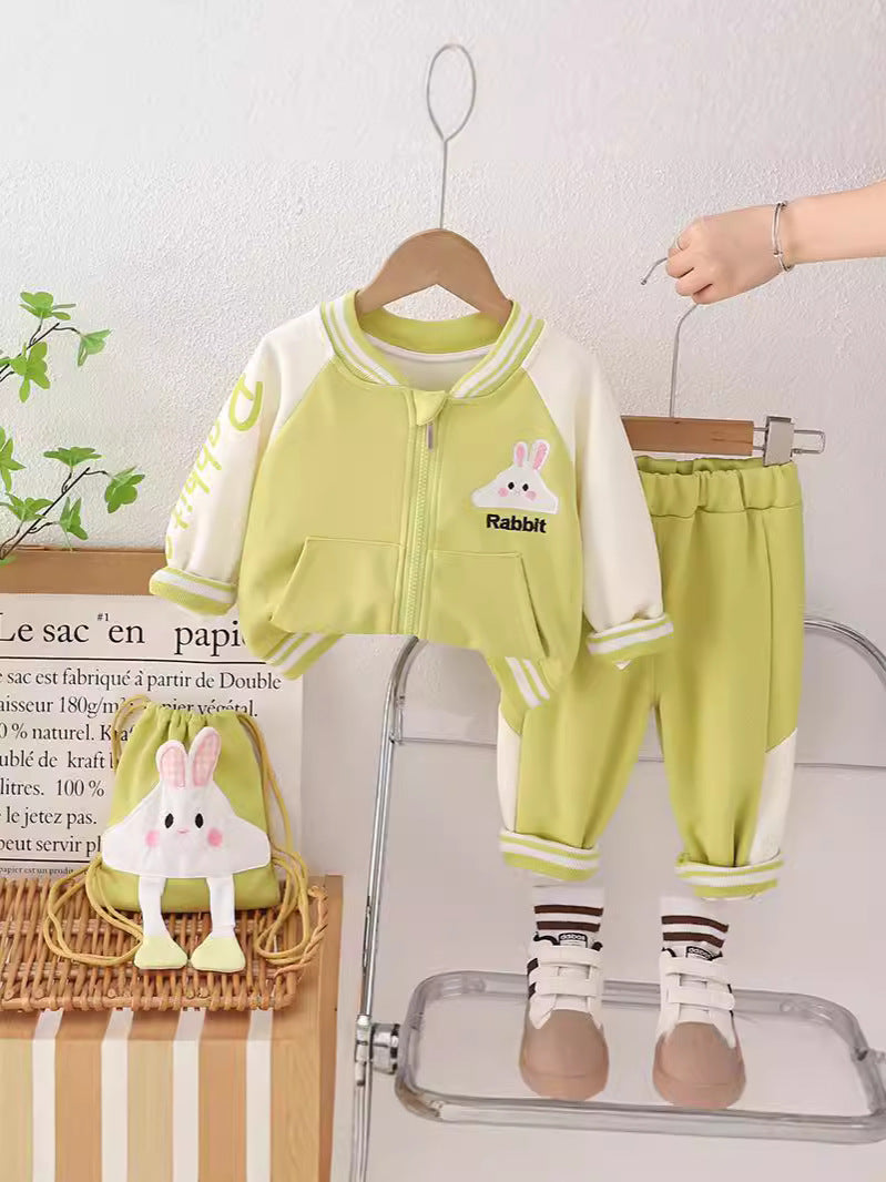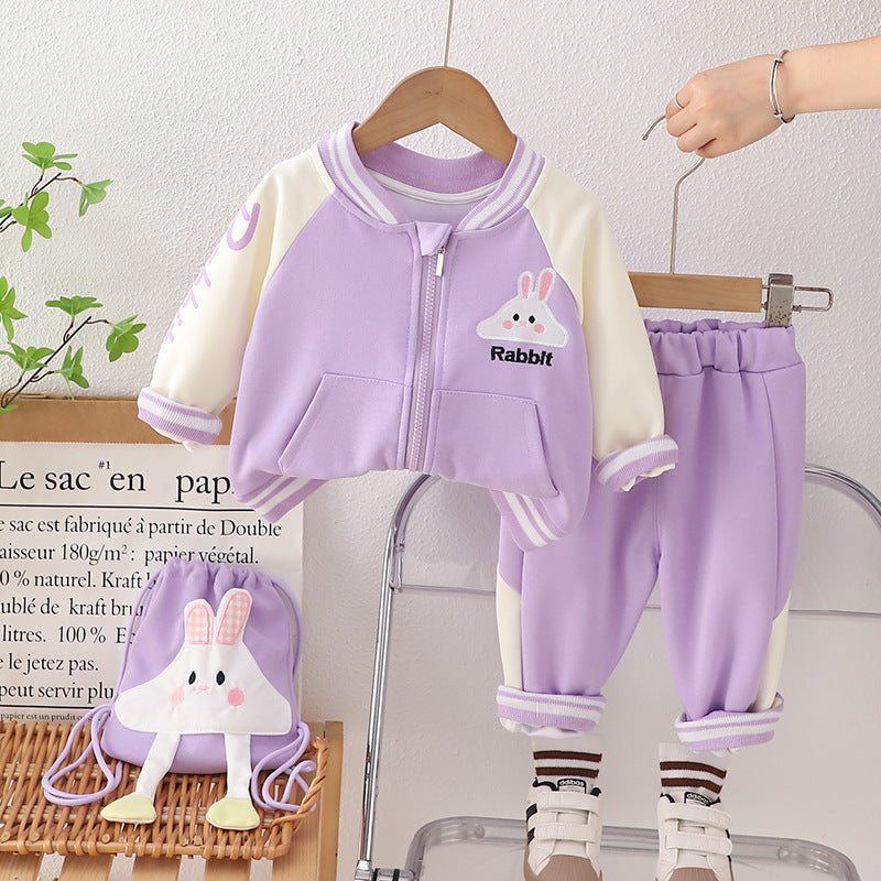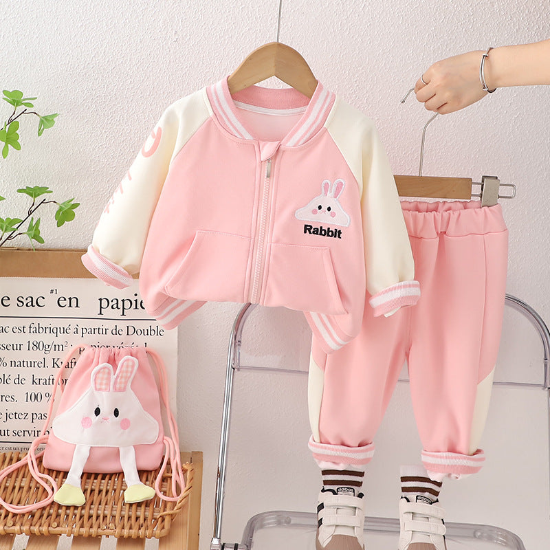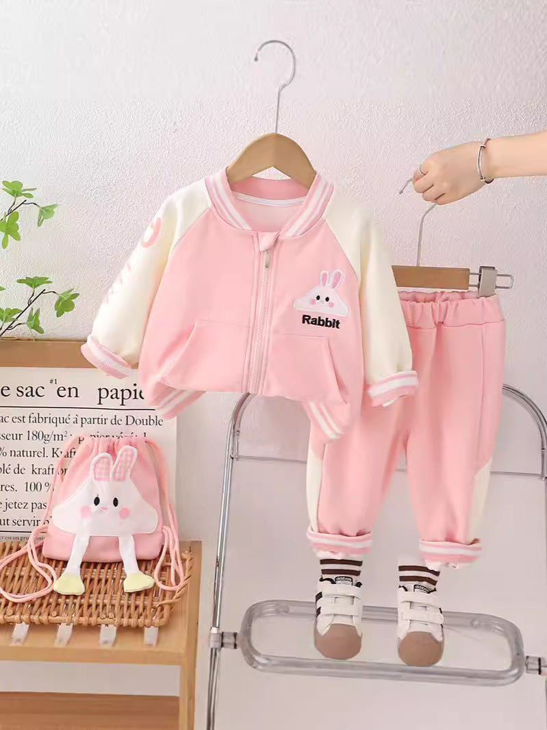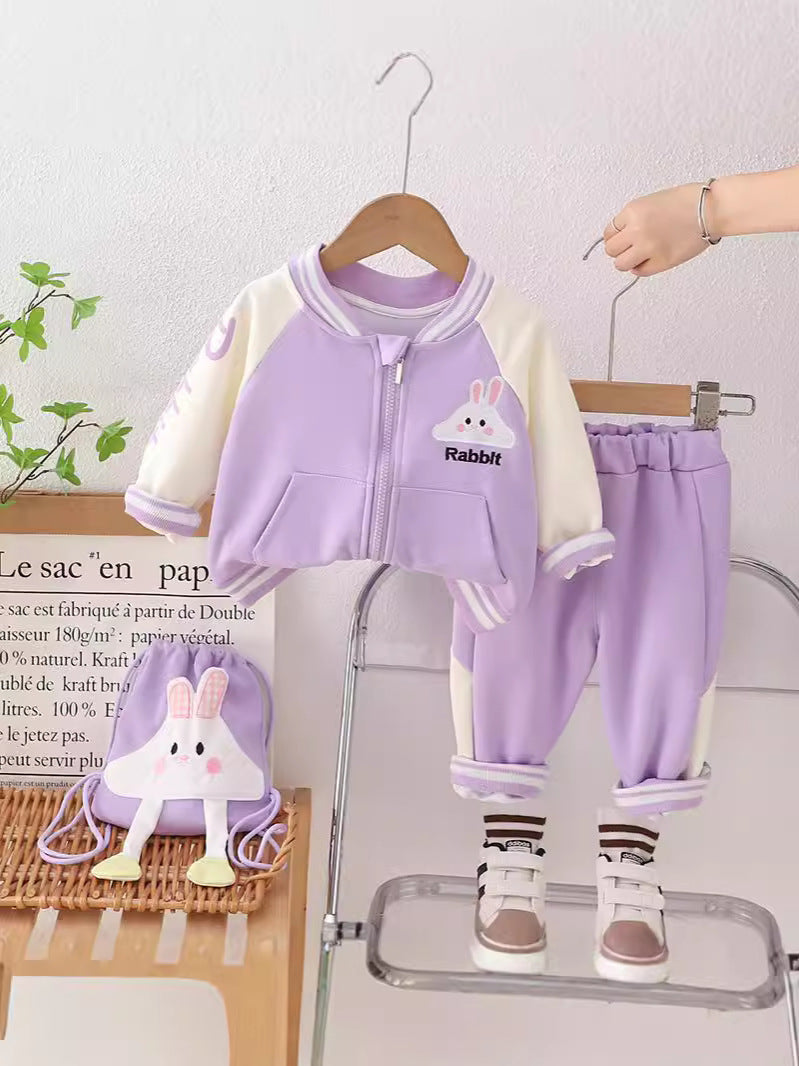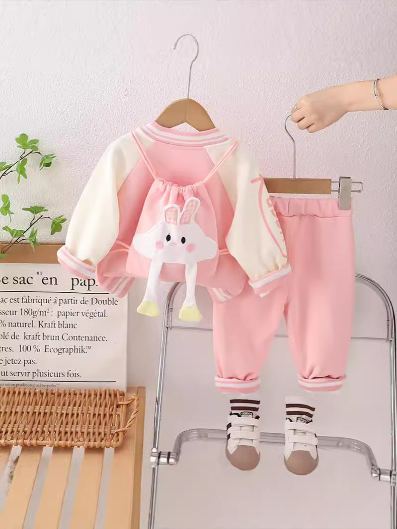 طقم بناتي ربيعي خريفي قطن تقيل 3 قطع ( جكيت + بنطلون + حقيبة)