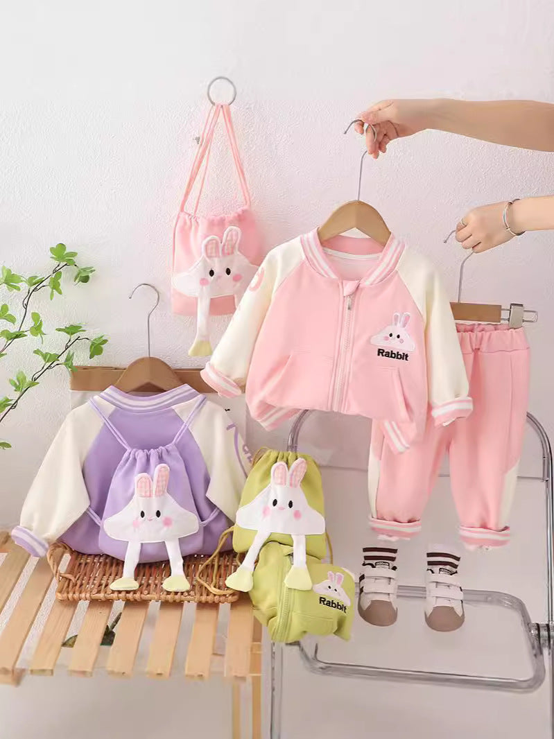 SSN040924-56 طقم بناتي ربيعي خريفي قطن تقيل 3 قطع ( جكيت + بنطلون + حقيبة)