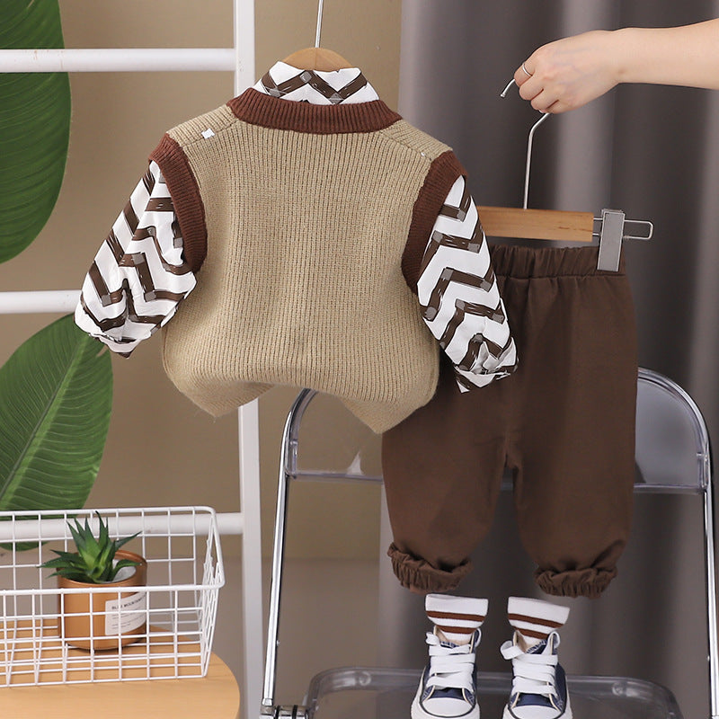 طقم ولادي خريفي ربيعي 3 قطع ( قميص + فست صوف + بنطلون كتان)