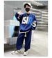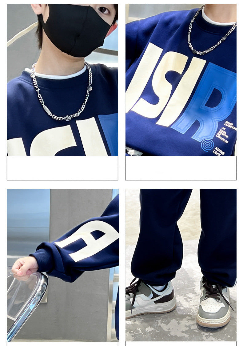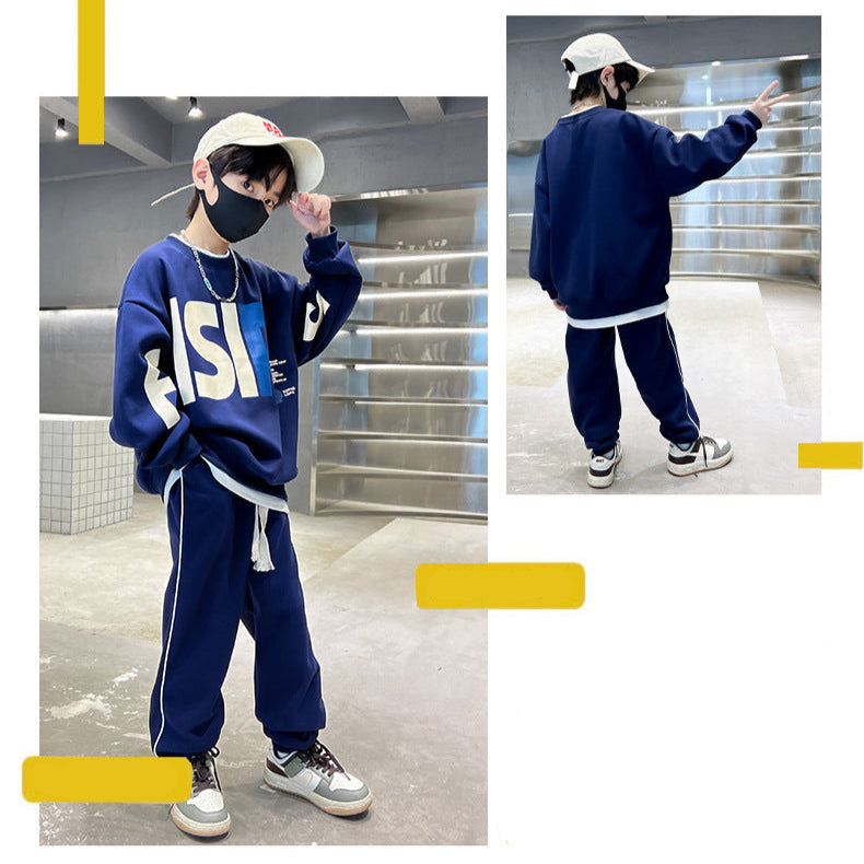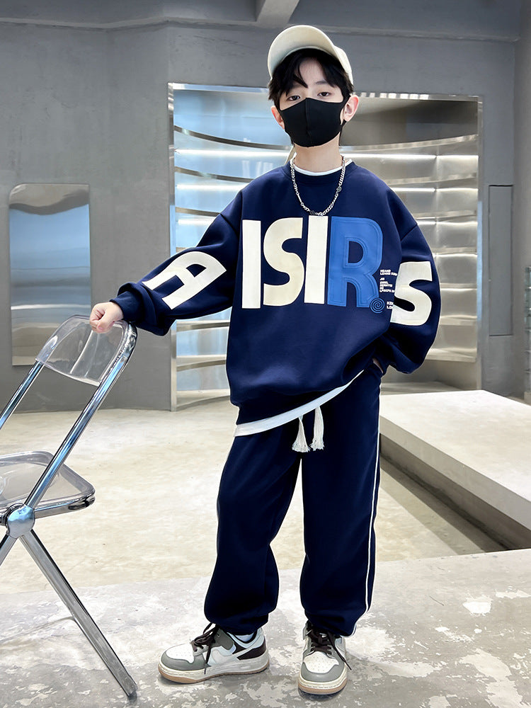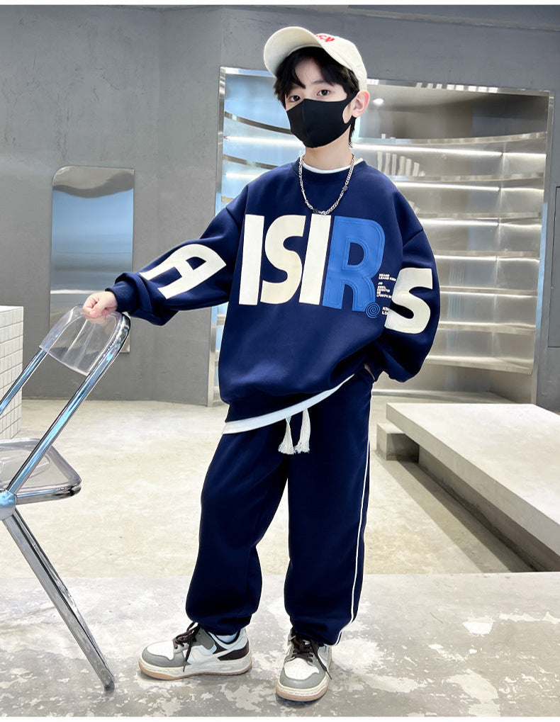 Child wearing a blue tracksuit with large white letters, sitting on a chair indoors.