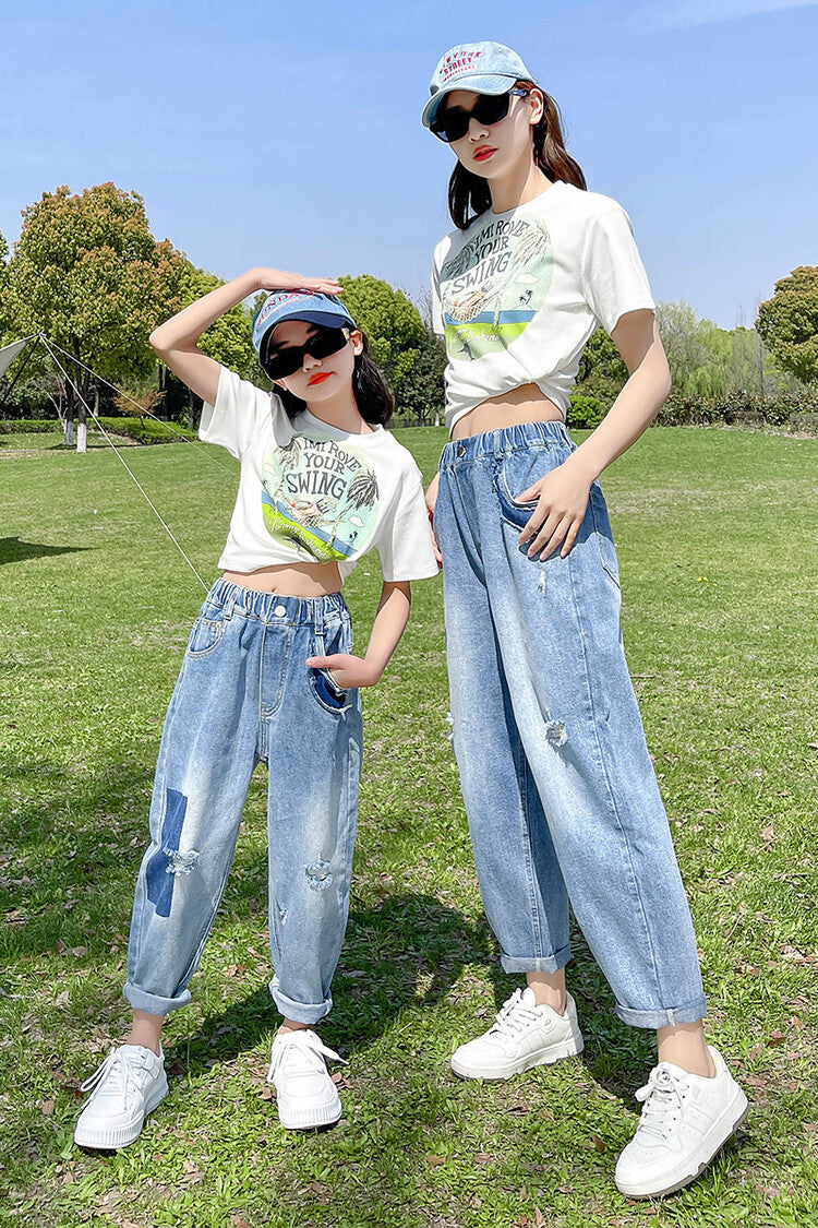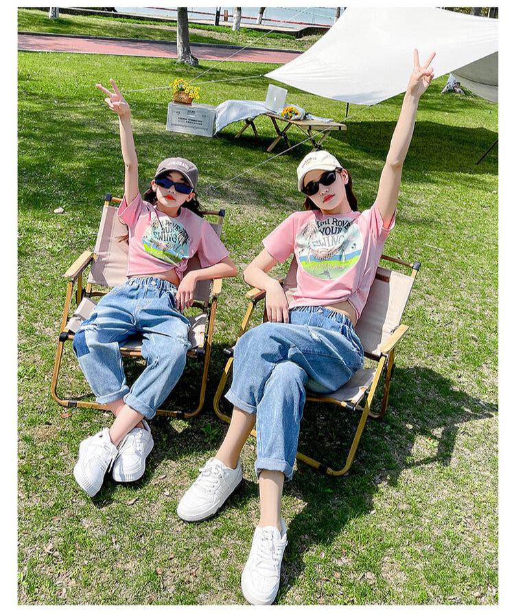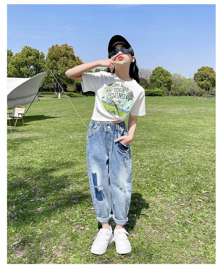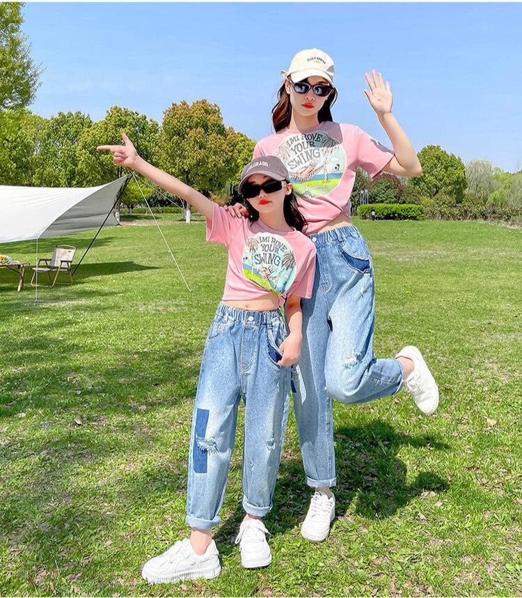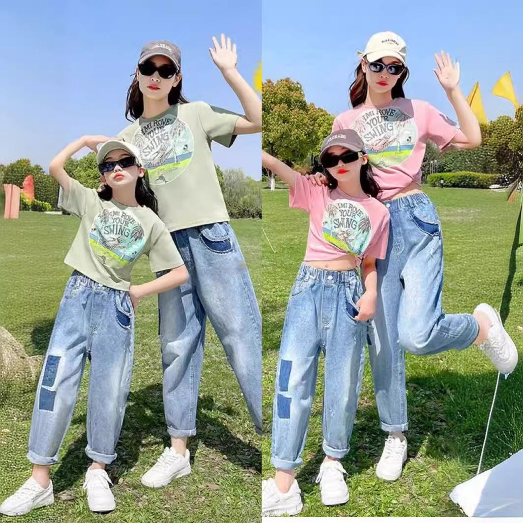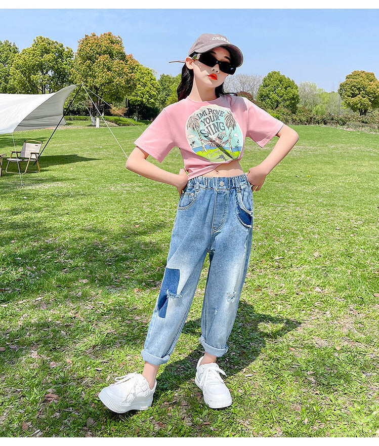 FU14042024-30 طقم بناتي قطعتين ( بلوزة قطنية + بنطلون جينز ناعم )