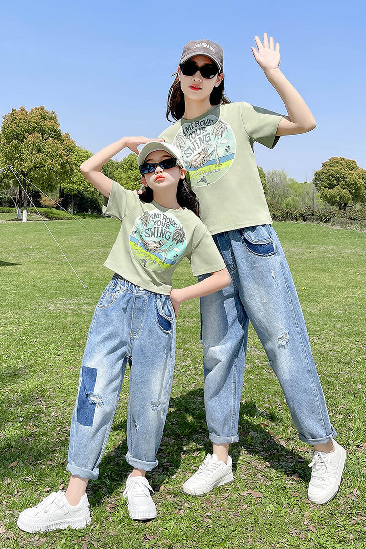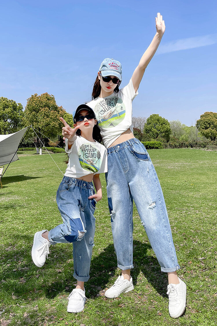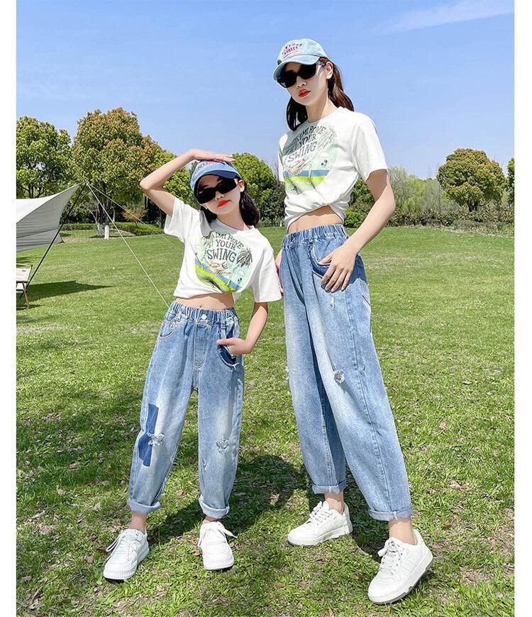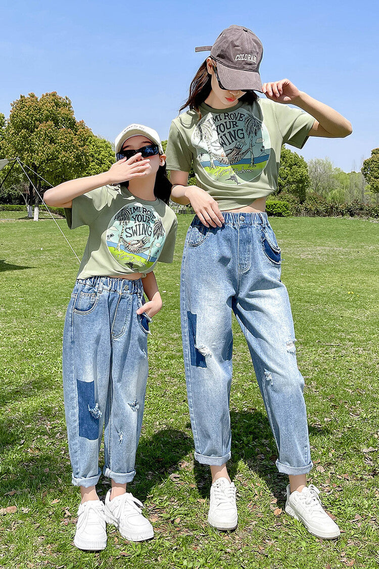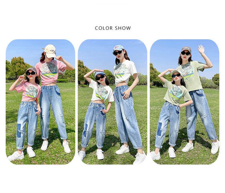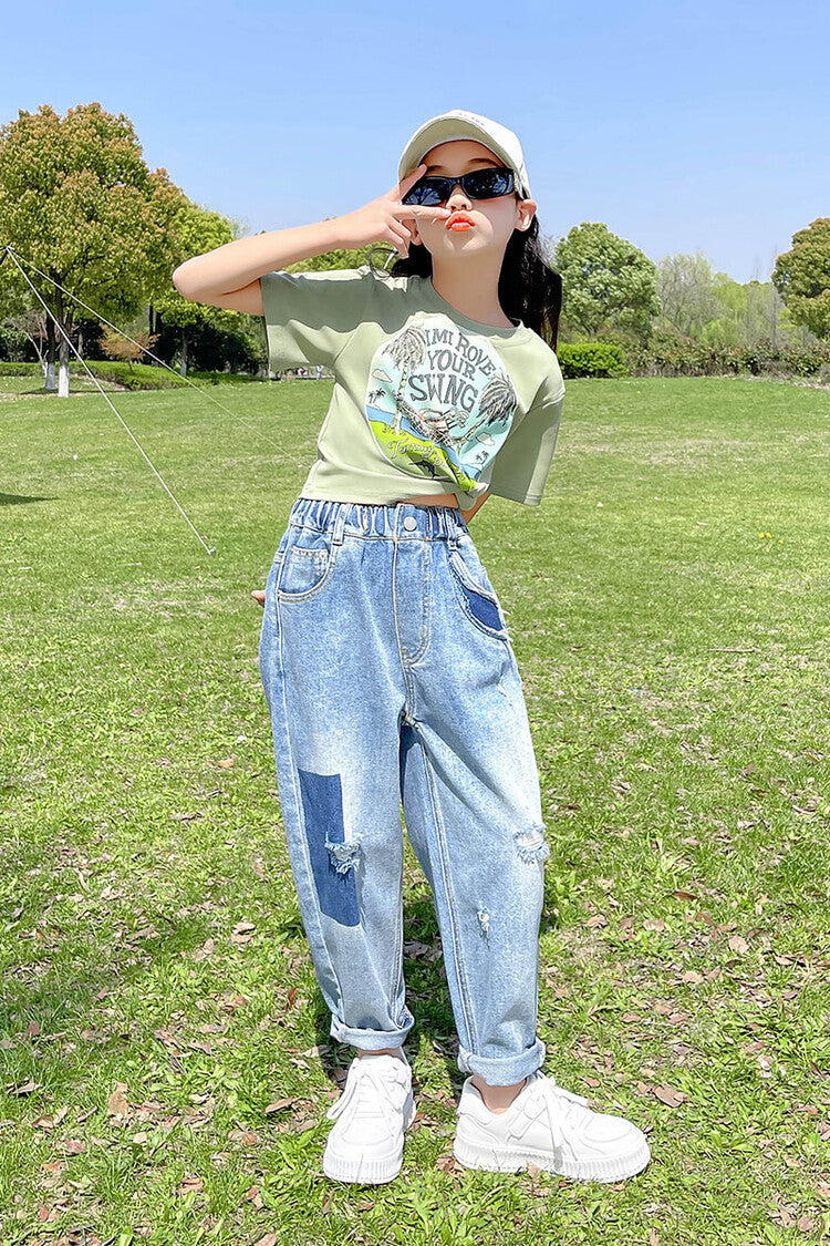 طقم بناتي قطعتين ( بلوزة قطنية + بنطلون جينز ناعم )