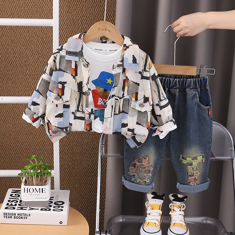 طقم 3 قطع ( بلوزة + جكيت + بنطلون جينز )