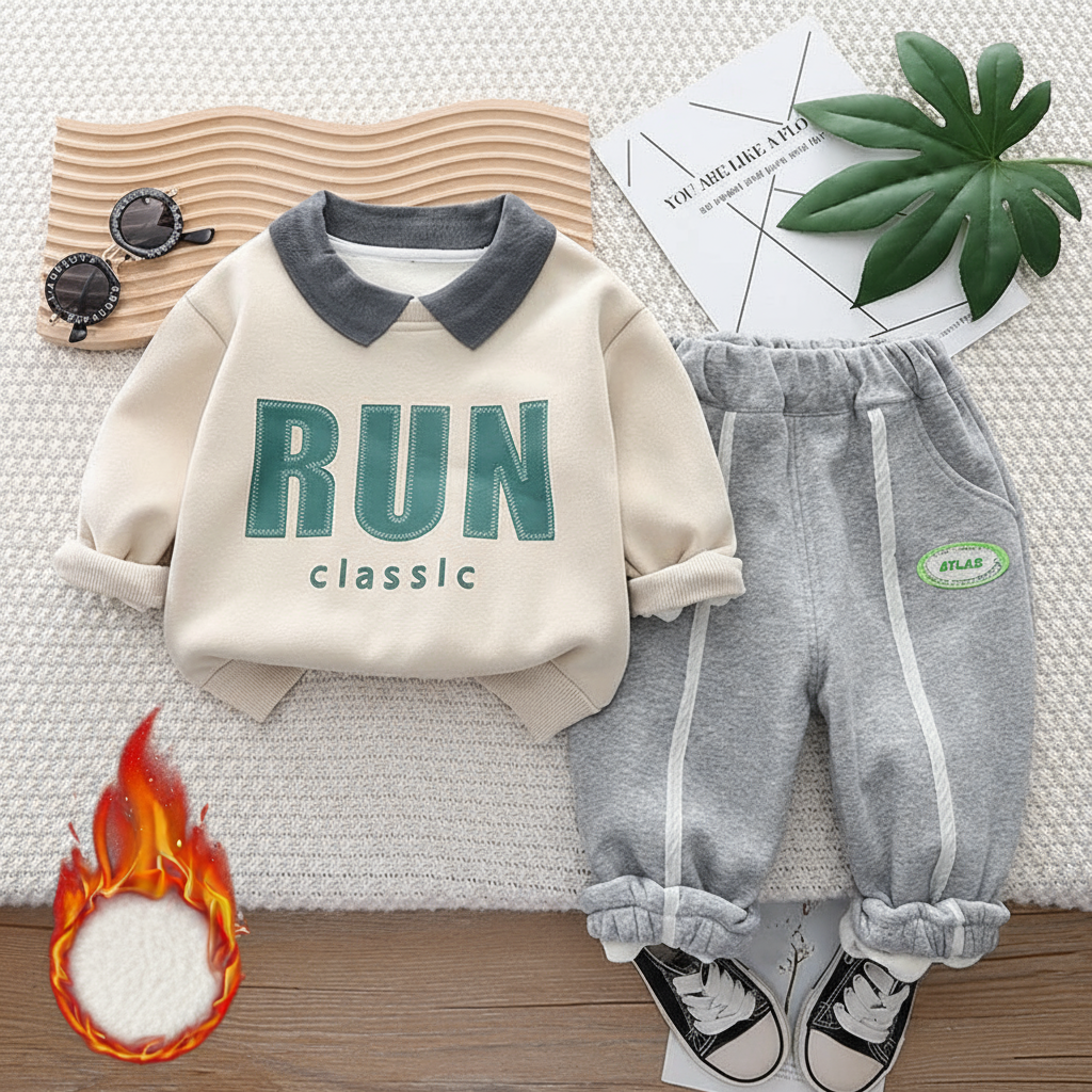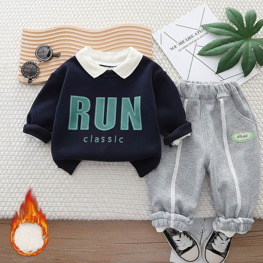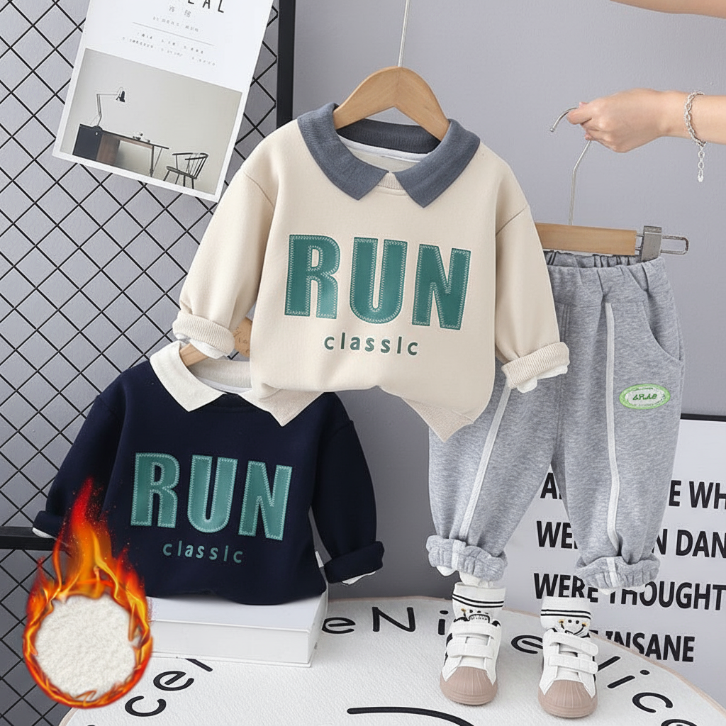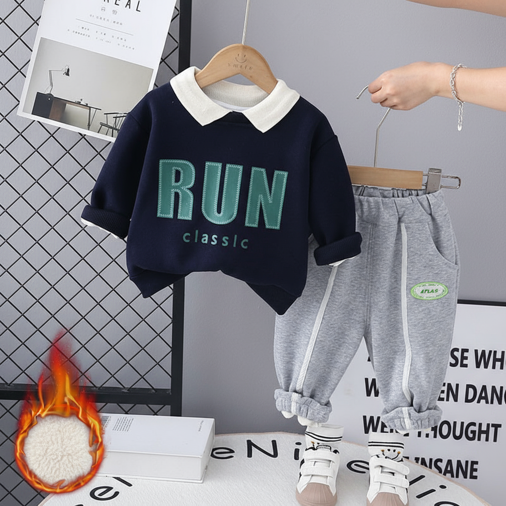 طقم ولادي شتوي تقيل مبطن فرو بالكامل قطعتين ( بلوزة + بنطلون)